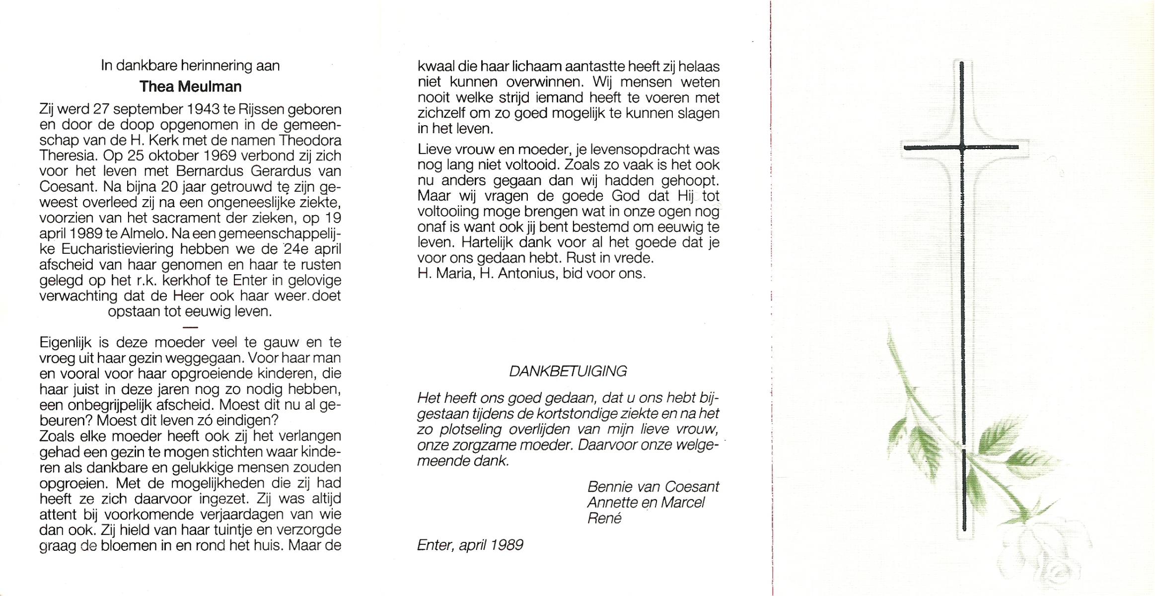 MEULMAN, TheaTheodora Theresia (), geboren op 27-9-1943 te Rijssen, overleden op 19-4-1989 te Almelo op 45-jarige leeftijd, begraven op 24-4-1989 te Wierden, Enter.