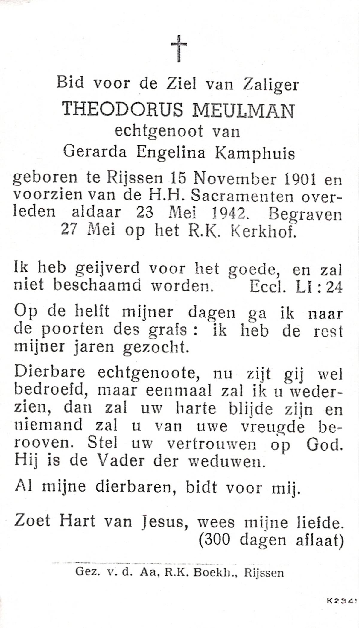MEULMAN, Theodorus, geboren op 15-11-1901 te Rijssen, overleden op 23-5-1942 te Rijssen op 40-jarige leeftijd, begraven op 27-5-1942 te Rijssen.