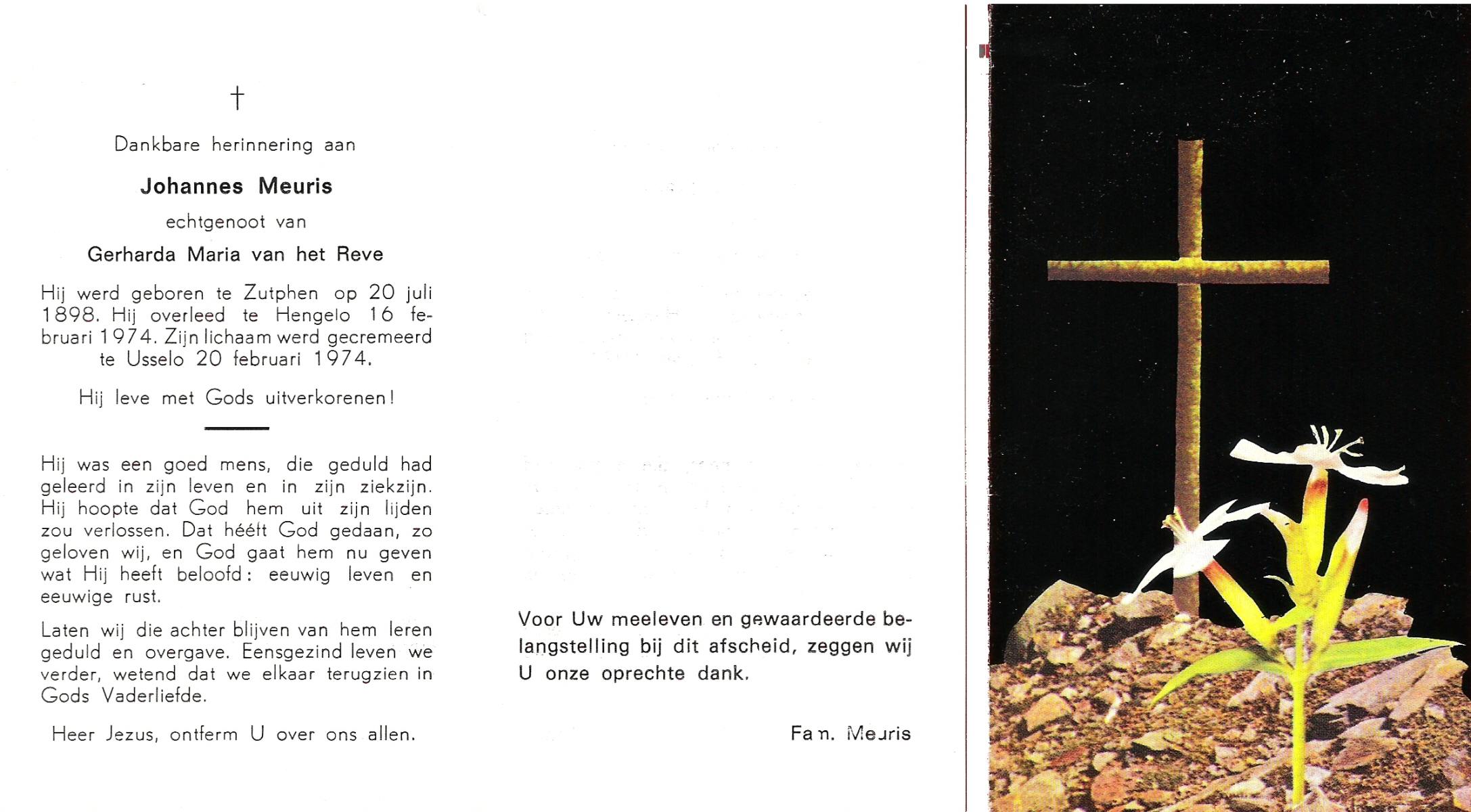 MEURIS, Johannes, geboren op 20-07-1898 te Zutphen, overleden op 16-2-1974 te Hengelo (Ov.) op 75-jarige leeftijd, gecremeerd op 20-2-1974 te Usselo.