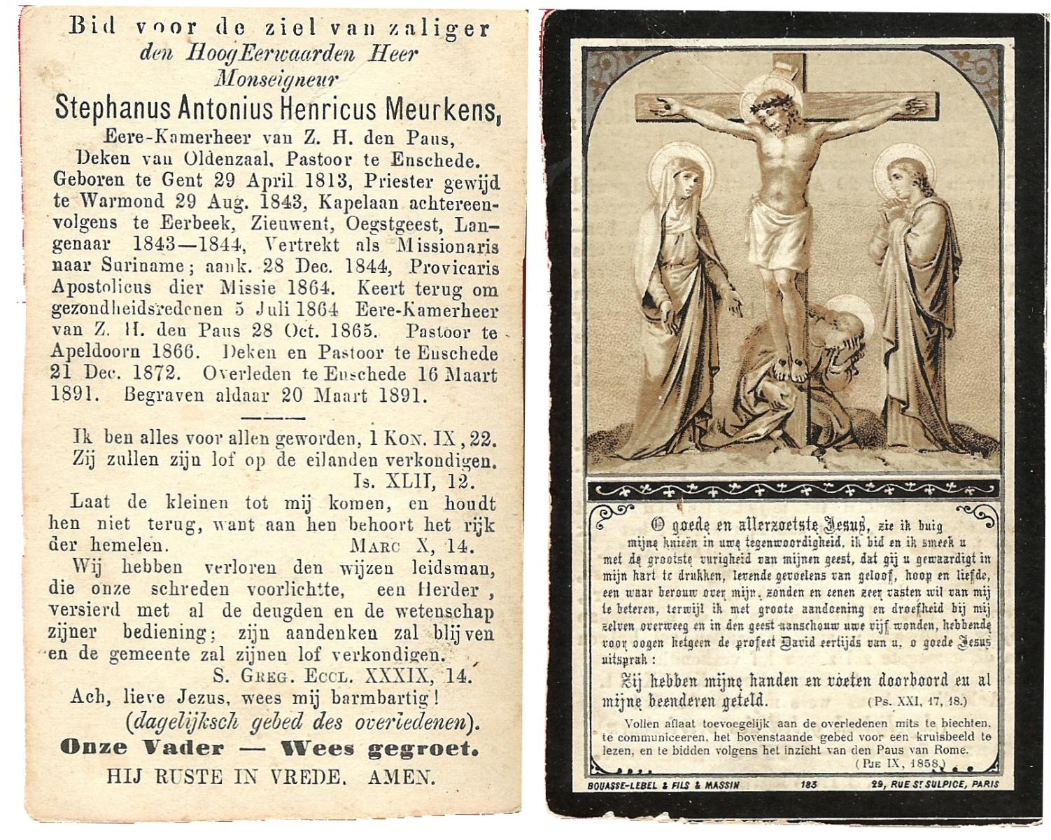 MEURKENS, Stephanus Antonius Henricus, geboren op 29-04-1813 te Gent, B., overleden op 16-03-1891 te Enschede op 77-jarige leeftijd, begraven op 20-03-1891 te Enschede.