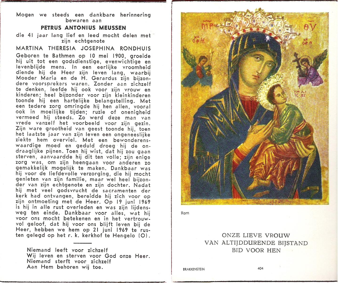 MEUSSEN, Petrus Antonius, geboren op 10-5-1900 te Bathmen, overleden op 19-6-1969 op 69-jarige leeftijd, begraven op 21-6-1969 te Hengelo (Ov.).