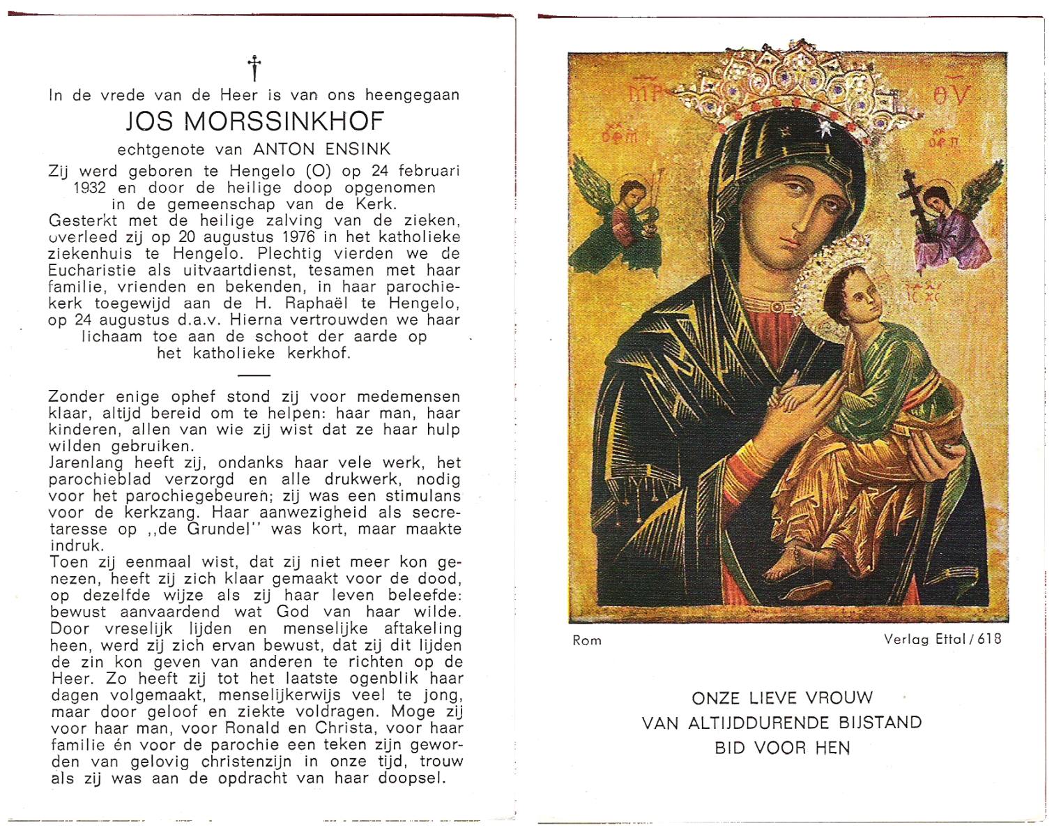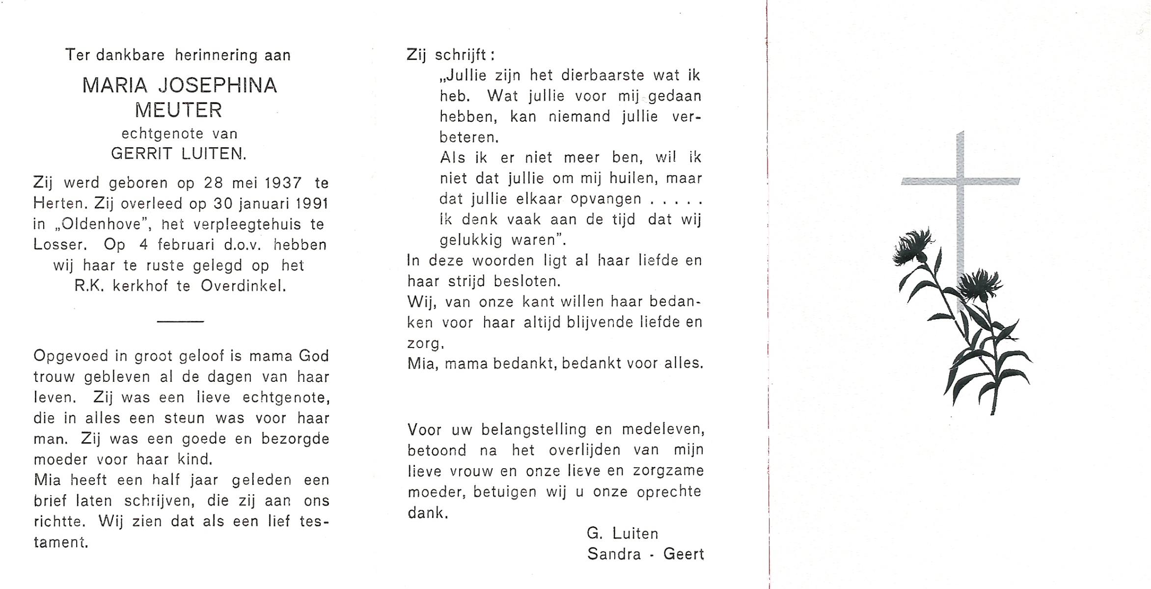 MEUTER, Maria Josephina, geboren op 28-5-1937 te Hertme, overleden op 30-1-1991 te Losser op 53-jarige leeftijd, begraven op 4-2-1991 te Overdinkel.