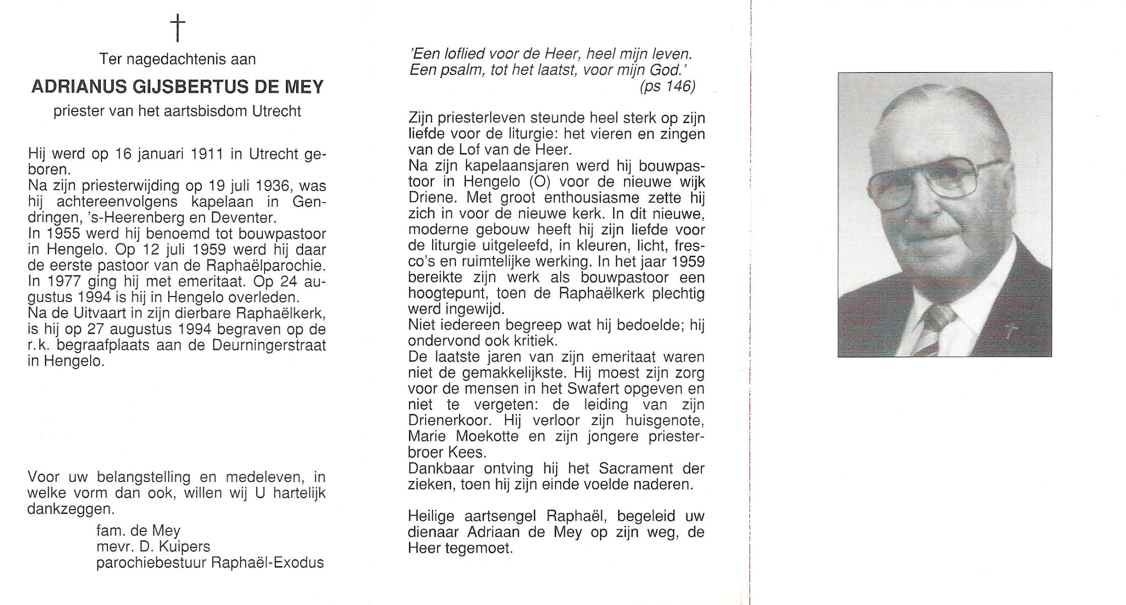 MEY, de, Adrianus Gijsbertus, geboren op 16-1-1911 te Utrecht, overleden op 24-8-1994 te Hengelo (Ov.) op 83-jarige leeftijd, begraven op 27-8-1994 te Hengelo (Ov.).