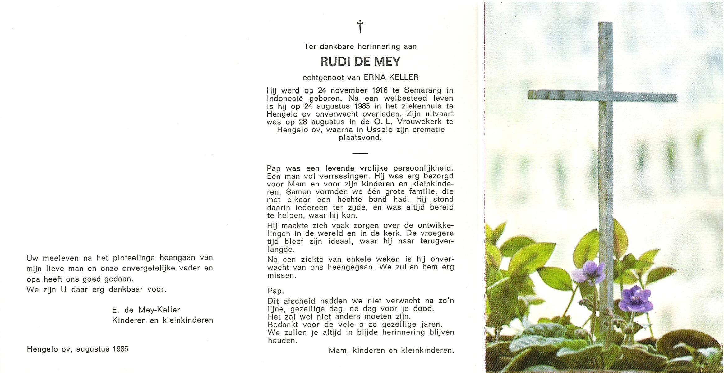 MEY, de, Rudi, geboren op 24-11-1916 te Semarang (Ind.), overleden op 24-8-1985 te Hengelo (Ov.) op 69-jarige leeftijd, gecremeerd op 28-8-1985 te Usselo.