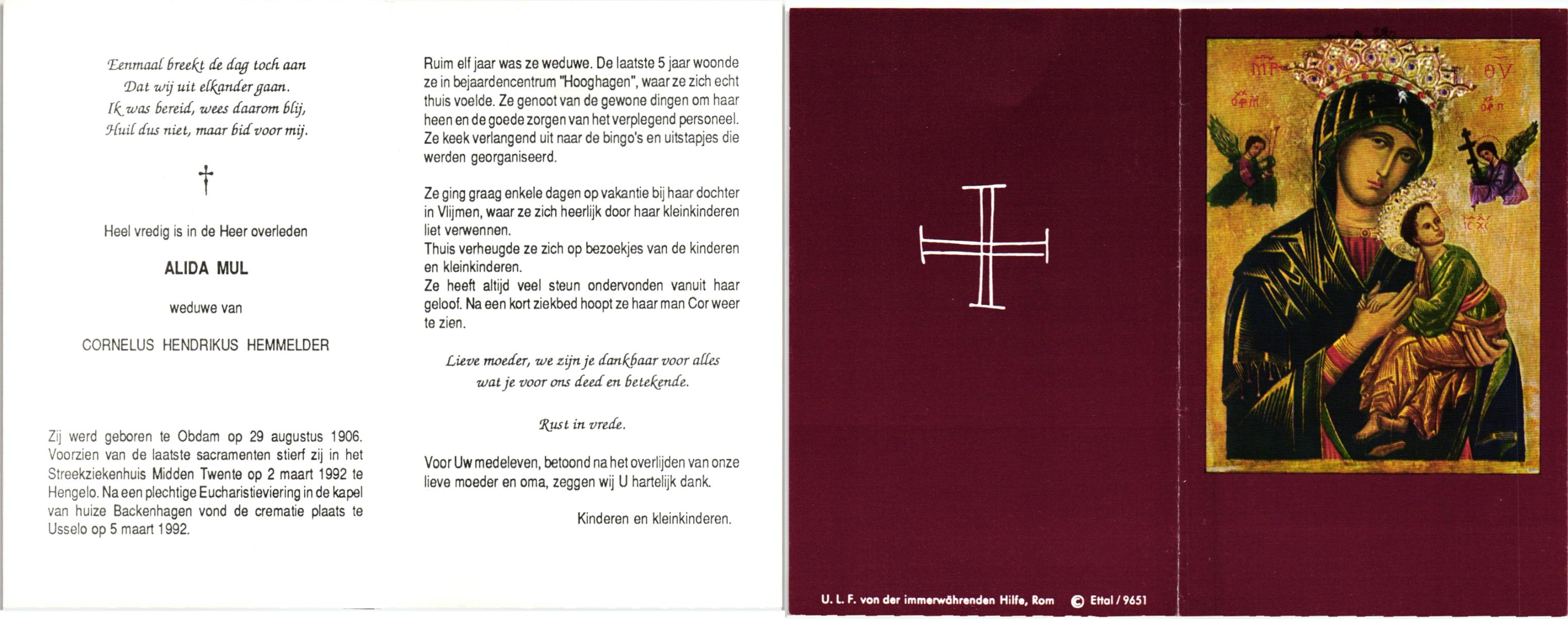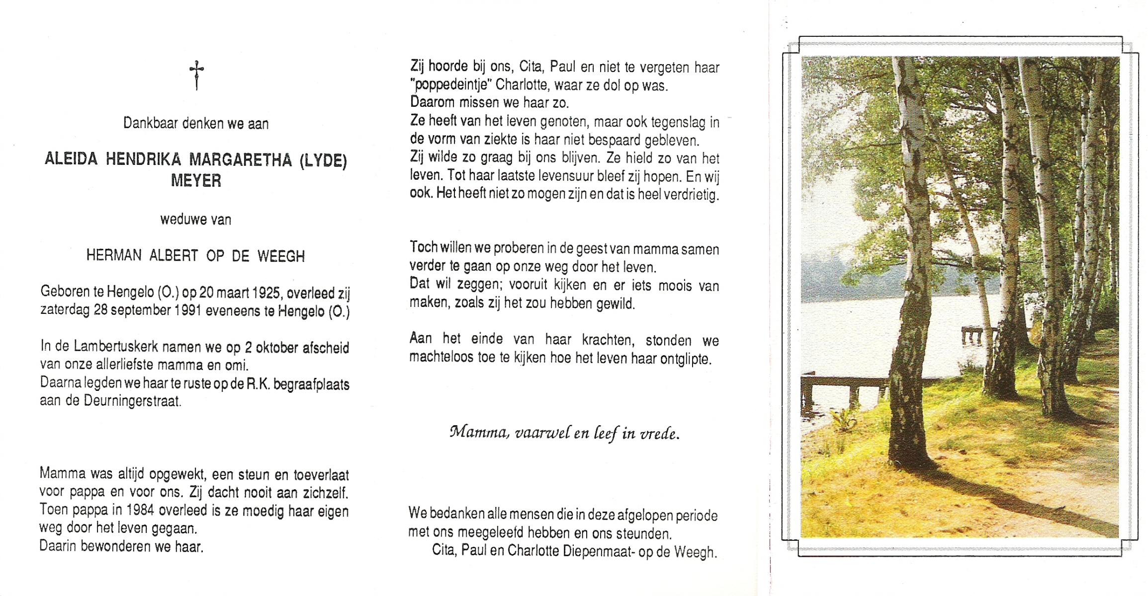 MEYER, Aleida Hendrika Margaretha (Lyde), geboren op 20-3-1925 te Hengelo (O), overleden op 28-9-1991 te Hengelo (Ov.) op 66-jarige leeftijd, begraven op 2-10-1991 te Hengelo (Ov.).