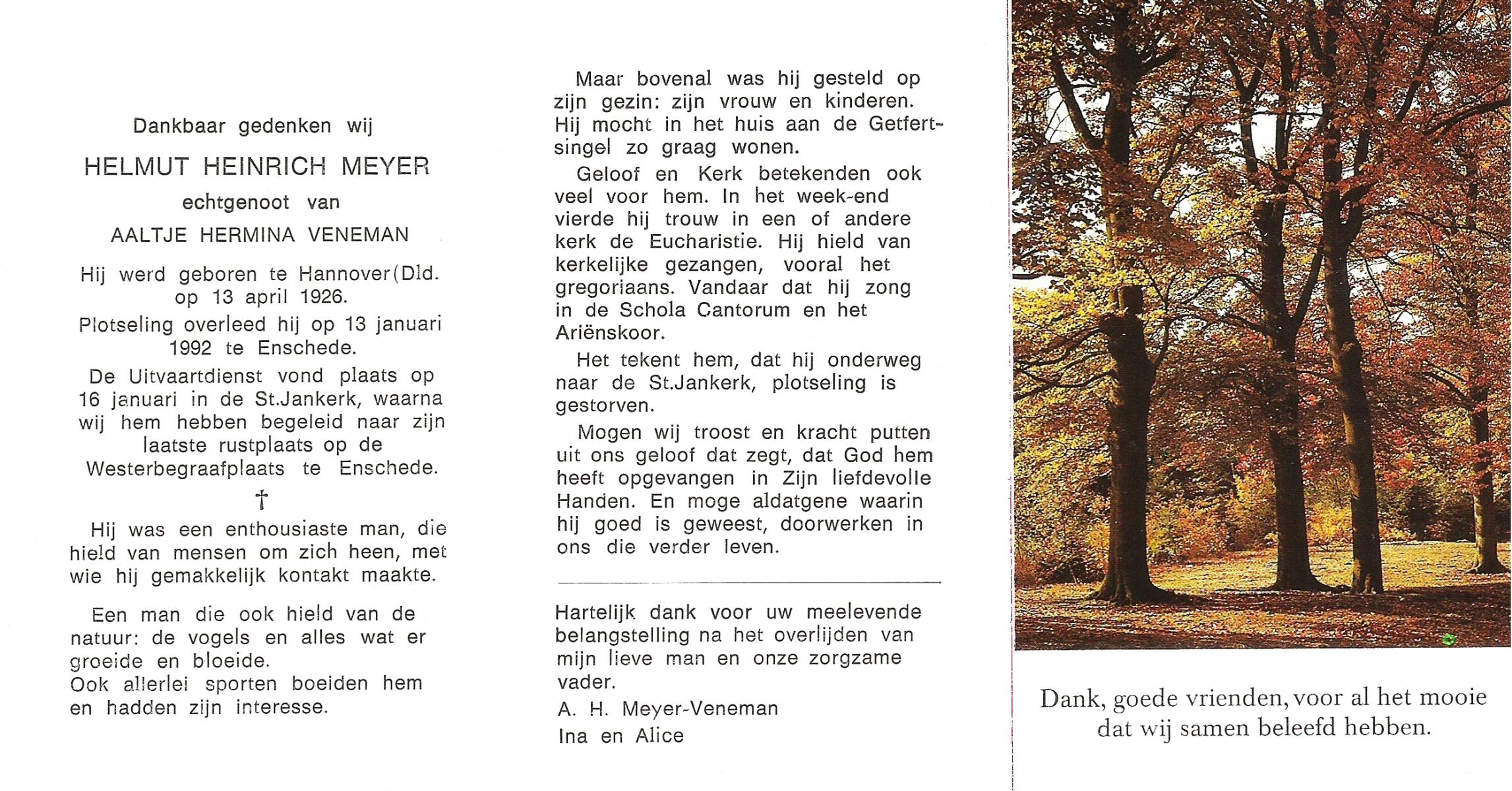 MEYER, Helmut Heinrich, geboren op 13-4-1926 te Hannover(D), overleden op 13-1-1992 te Enschede op 65-jarige leeftijd, begraven op 16-1-1992 te Enschede.