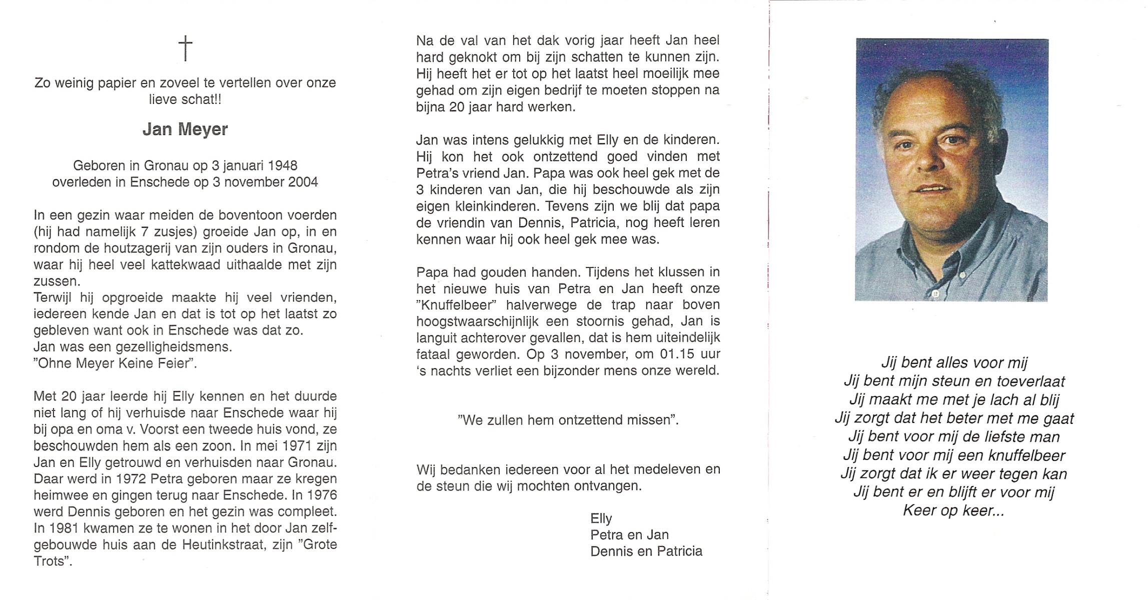 MEYER, Jan, geboren op 3-1-1948 te Gronau (Dld.), overleden op 3-11-2004 te Enschede op 56-jarige leeftijd.