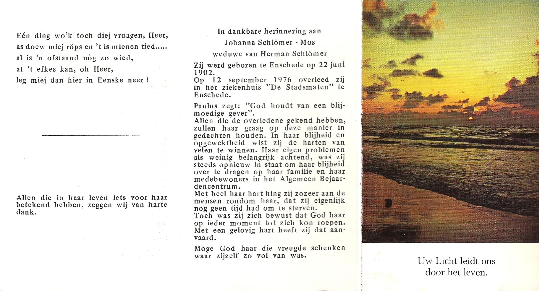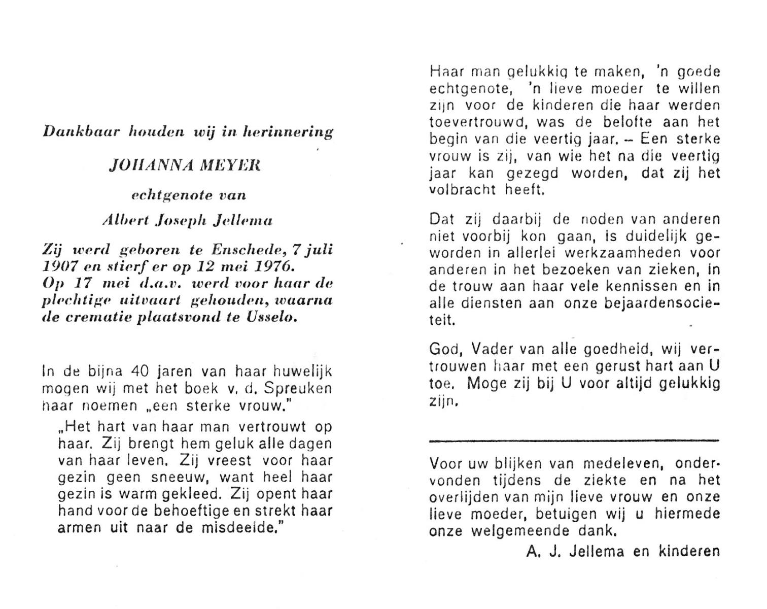 MEYER, Johanna, geboren op 7-7-1907 te Enschede, overleden op 12-5-1976 te Enschede op 68-jarige leeftijd, gecremeerd op 17-5-1976 te Usselo.