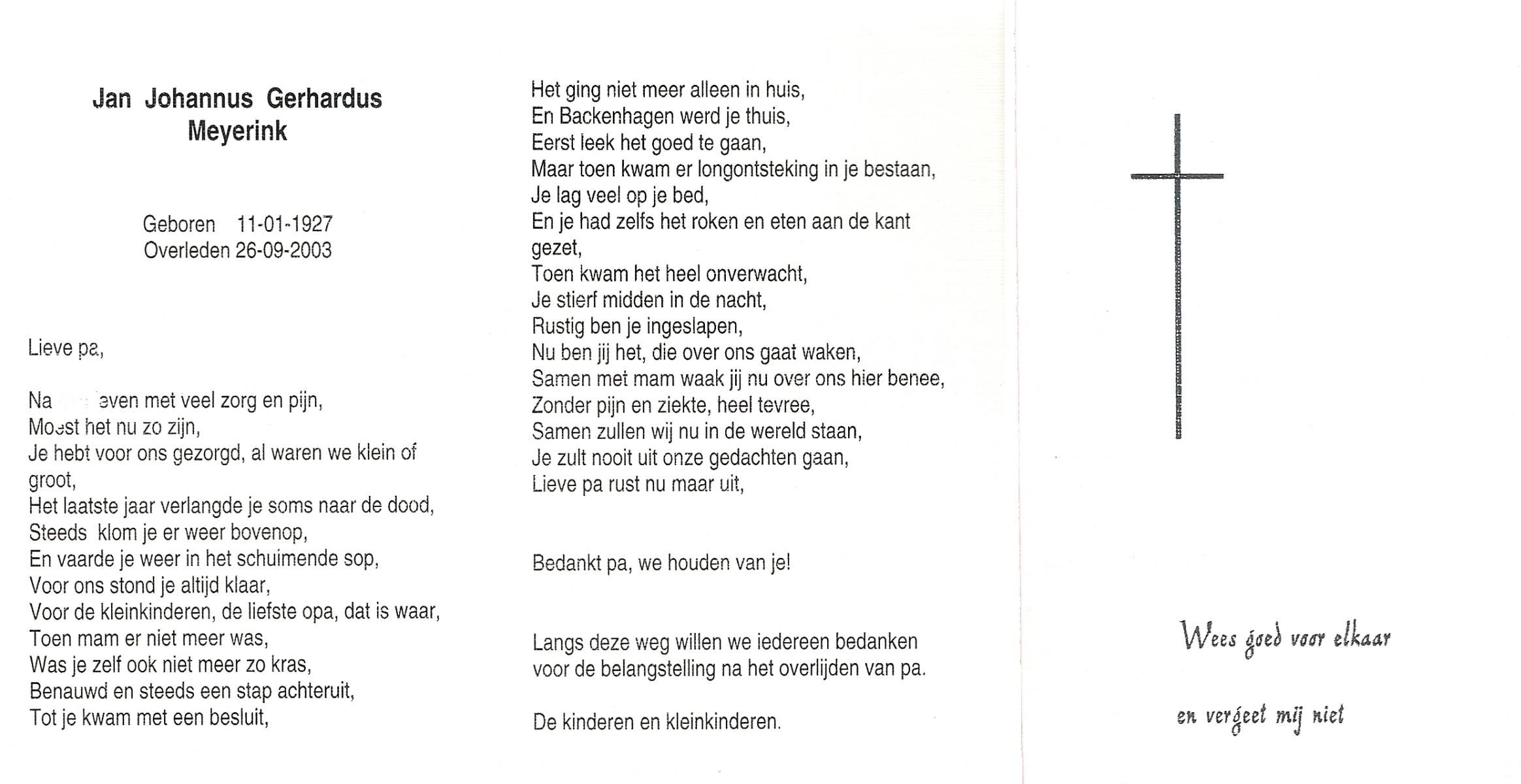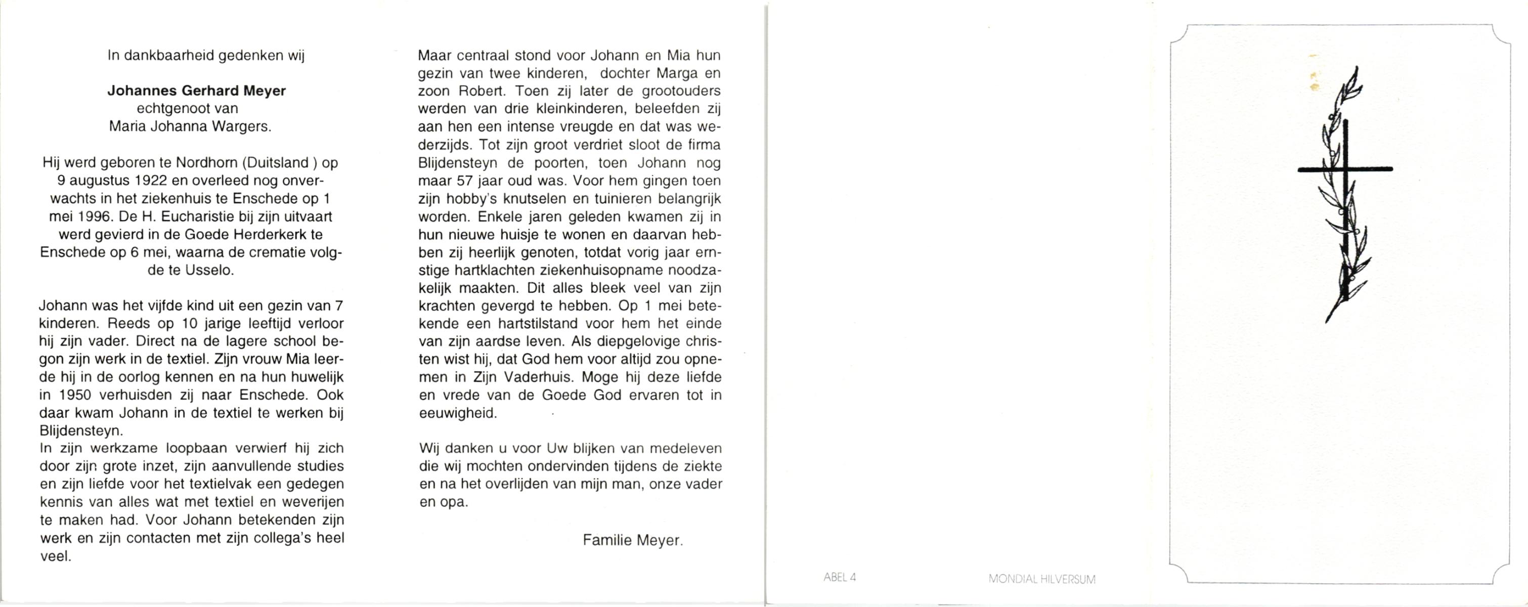 MEYER, , Johannes Gerhard, geboren op 9-8-1922 te Nordhorn, Dld, overleden op 1-5-1996 te Enschede op 73-jarige leeftijd, gecremeerd op 6-5-1996 te Usselo.