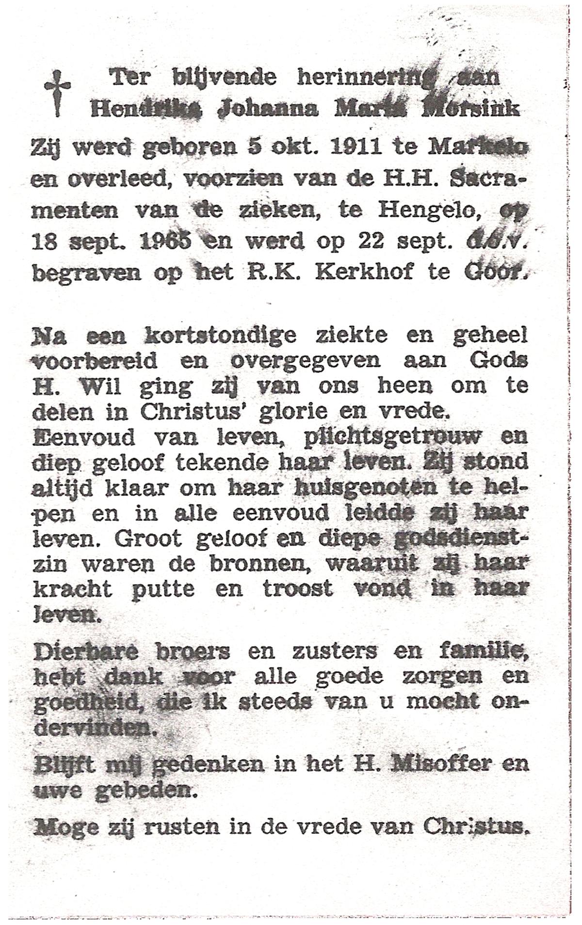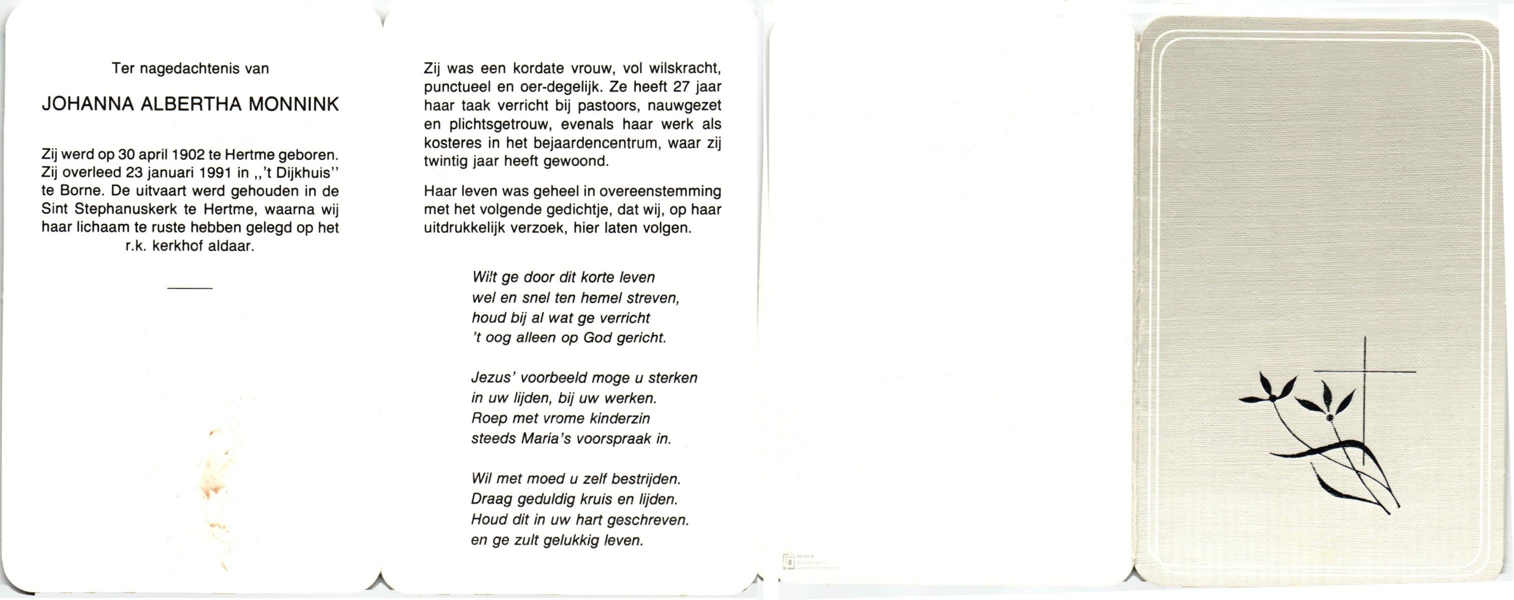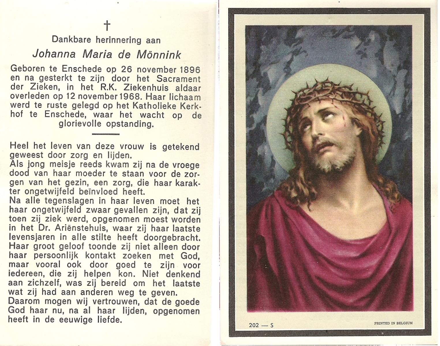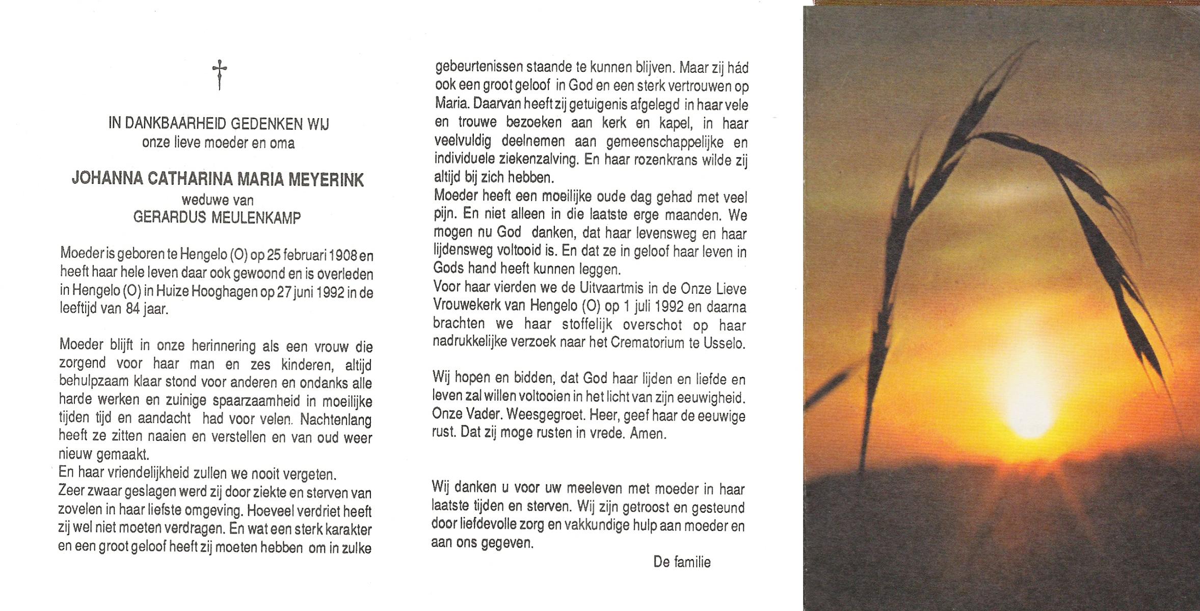 MEYERINK, Johanna Catharina Maria, geboren op 25-2-1908 te Hengelo (O), overleden op 27-6-1992 te Hengelo (Ov.) op 84-jarige leeftijd.