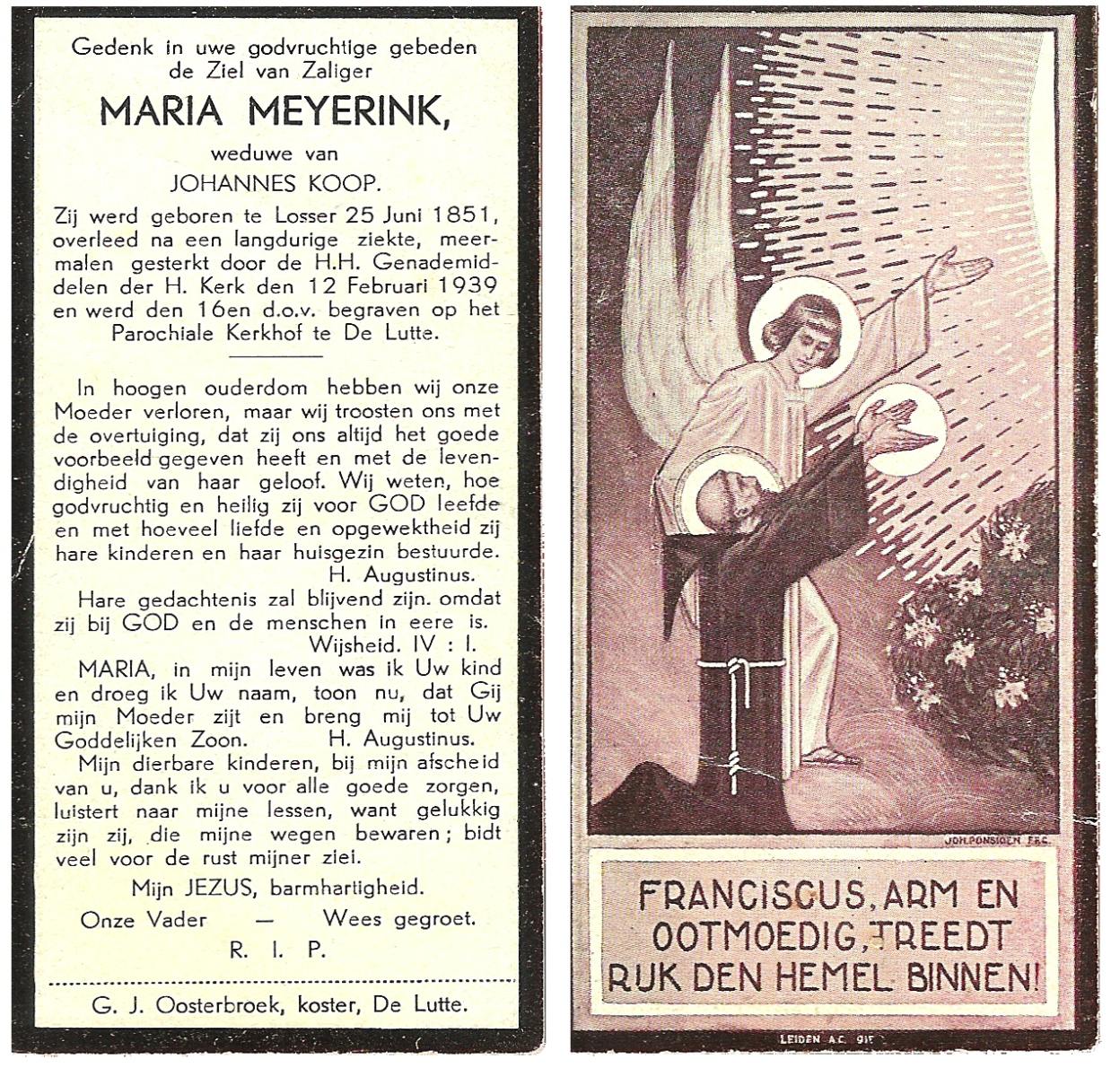 MEYERINK, Maria, geboren op 25-06-1851 te Losser, overleden op 12-2-1939 op 87-jarige leeftijd, begraven op 16-2-1939 te De Lutte.