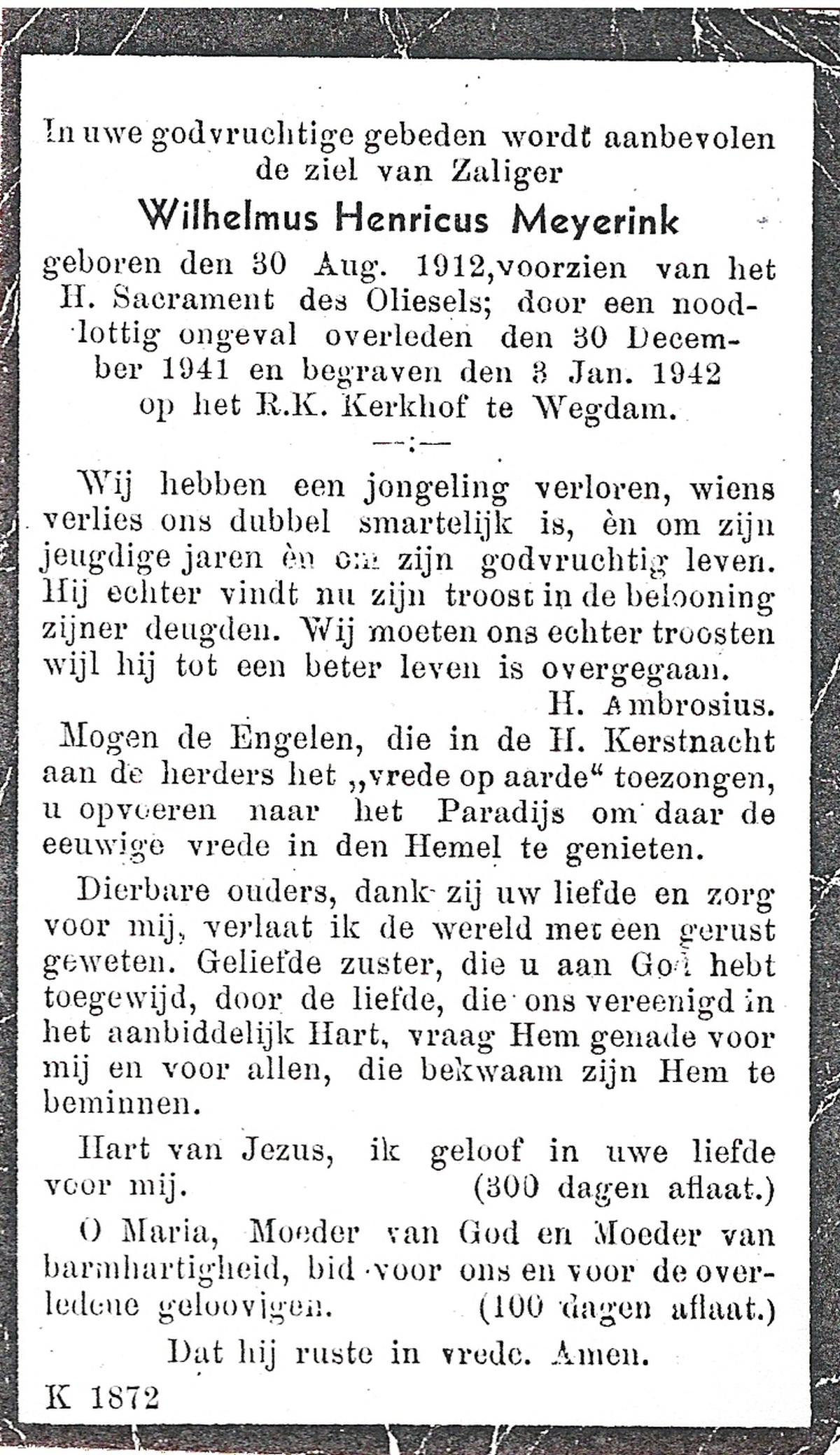 MEYERINK, Wilhelmus Henricus, geboren op 30-8-1912, overleden op 30-12-1941 op 29-jarige leeftijd, begraven op 3-1-1942 te Wegdam.
