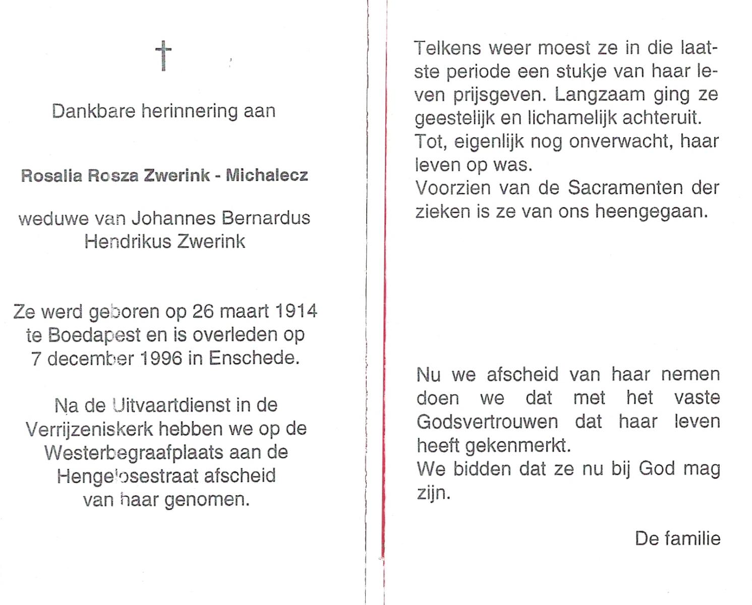 MICHALECZ, Rosalia Rosza, geboren op 26-3-1914 te Boedapest (Hon.), overleden op 7-12-1996 te Enschede op 82-jarige leeftijd.