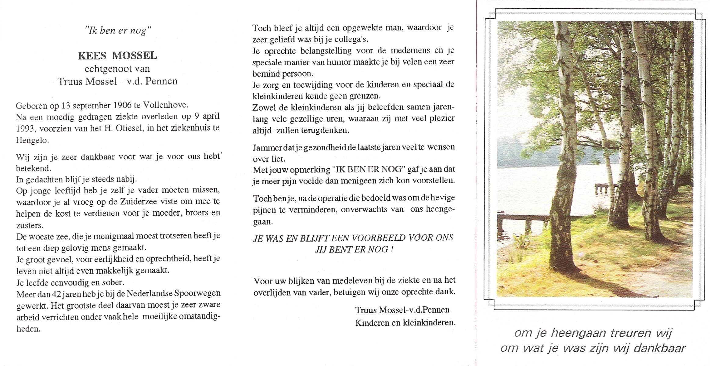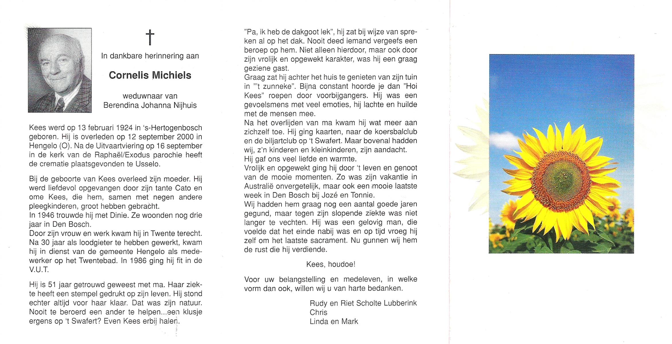 MICHIELS, Cornelis, geboren op 13-2-1924 te 's Hertogenbosch, overleden op 12-9-2000 te Hengelo (Ov.) op 76-jarige leeftijd, gecremeerd op 16-9-2000 te Usselo.