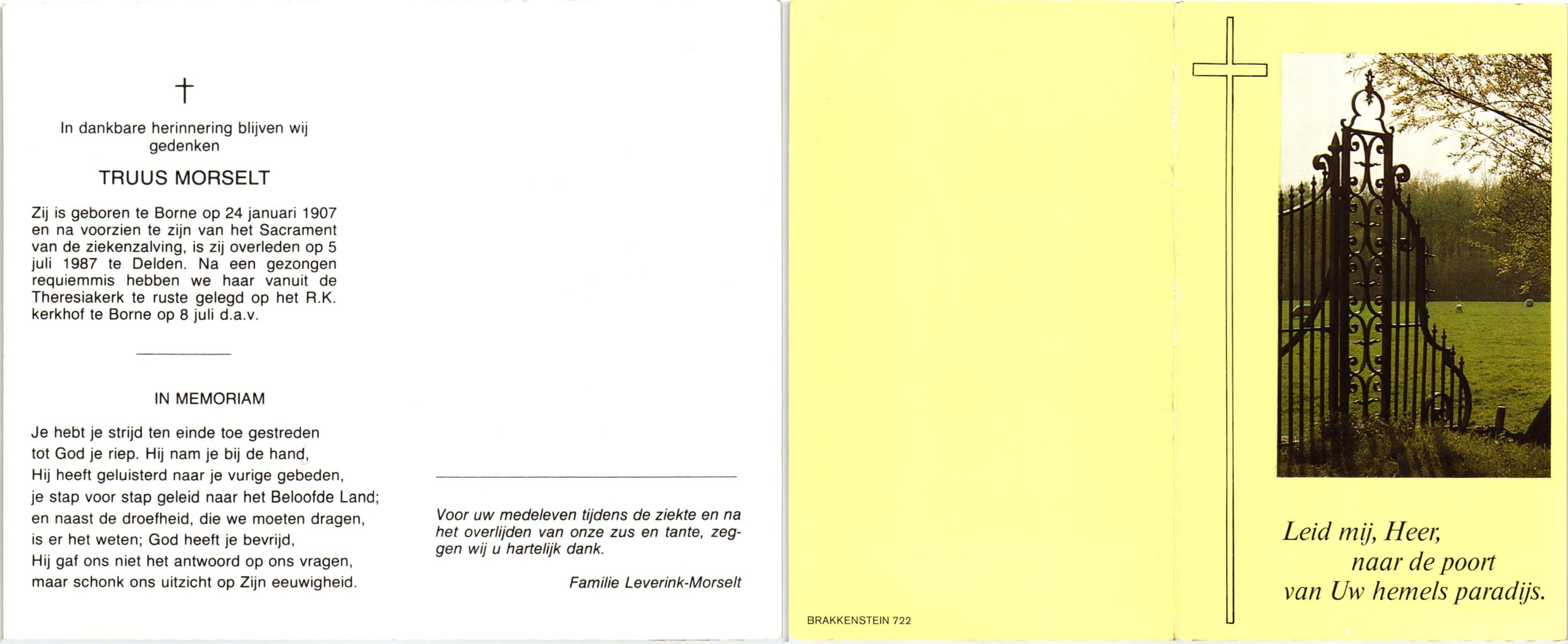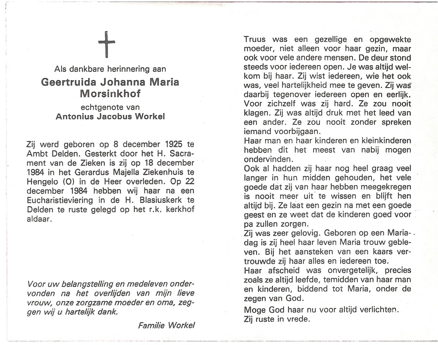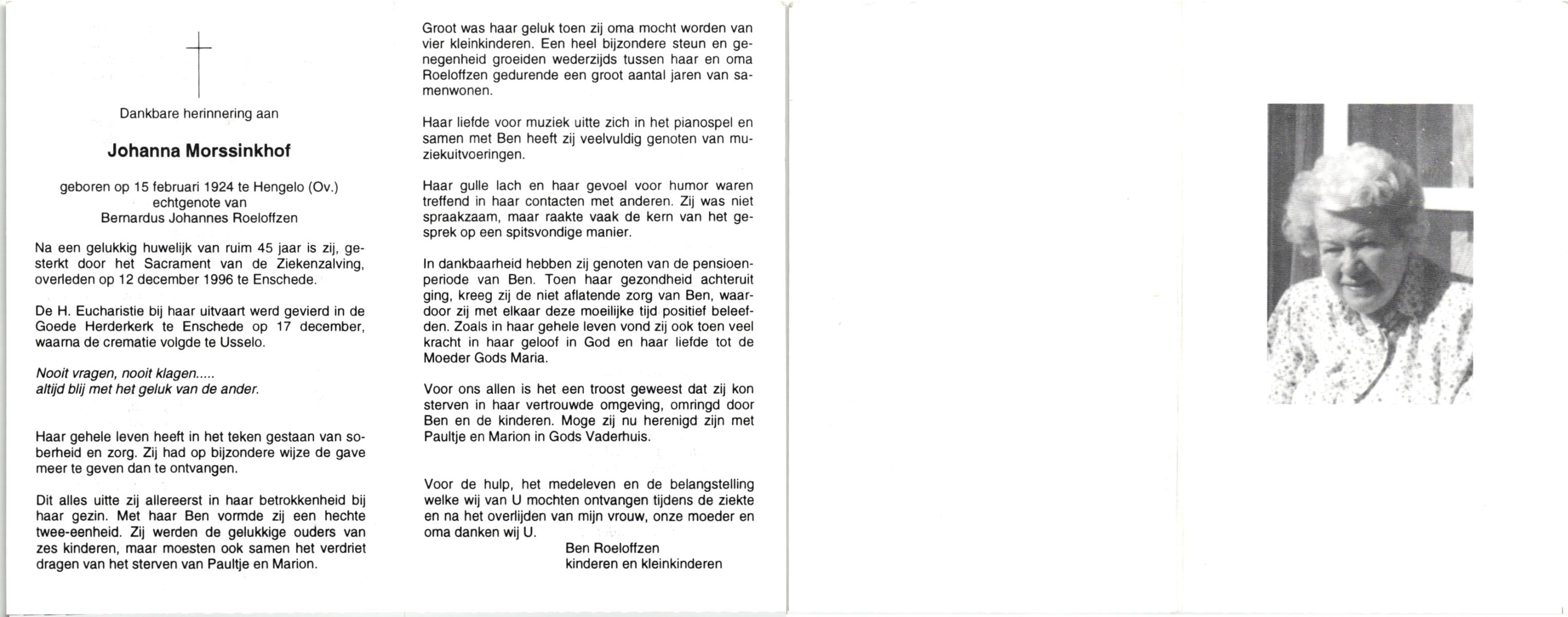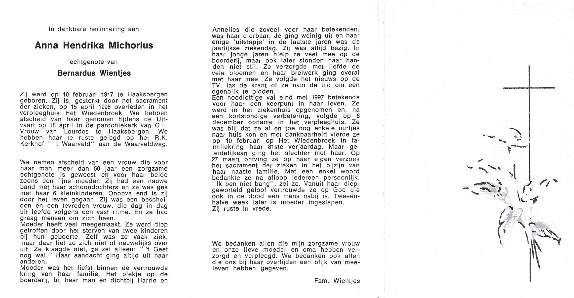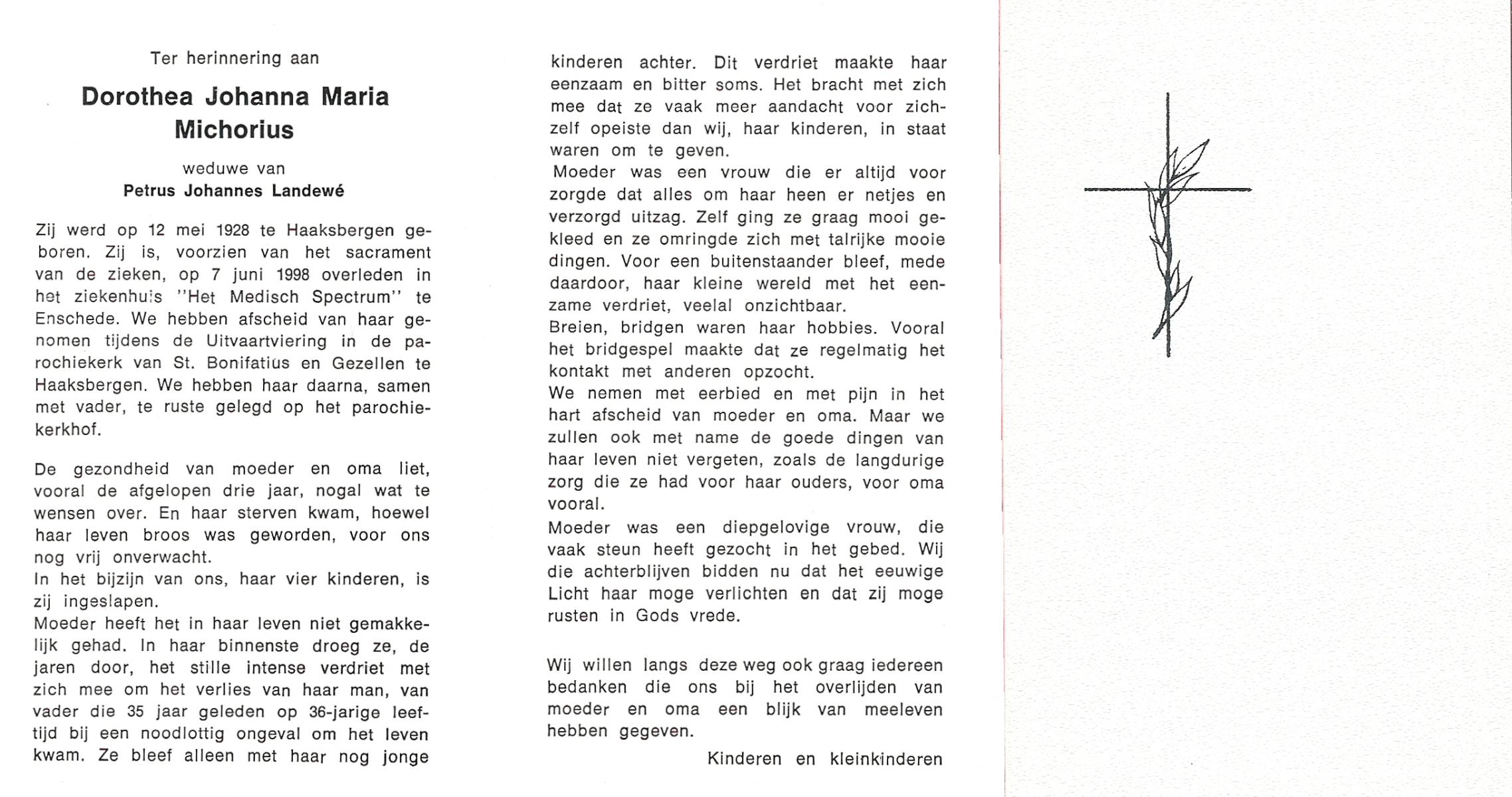 MICHORIUS, Dorothea Johanna Maria, geboren op 12-5-1928 te Haaksbergen, overleden op 7-6-1998 te Enschede op 70-jarige leeftijd, begraven te Haaksbergen.