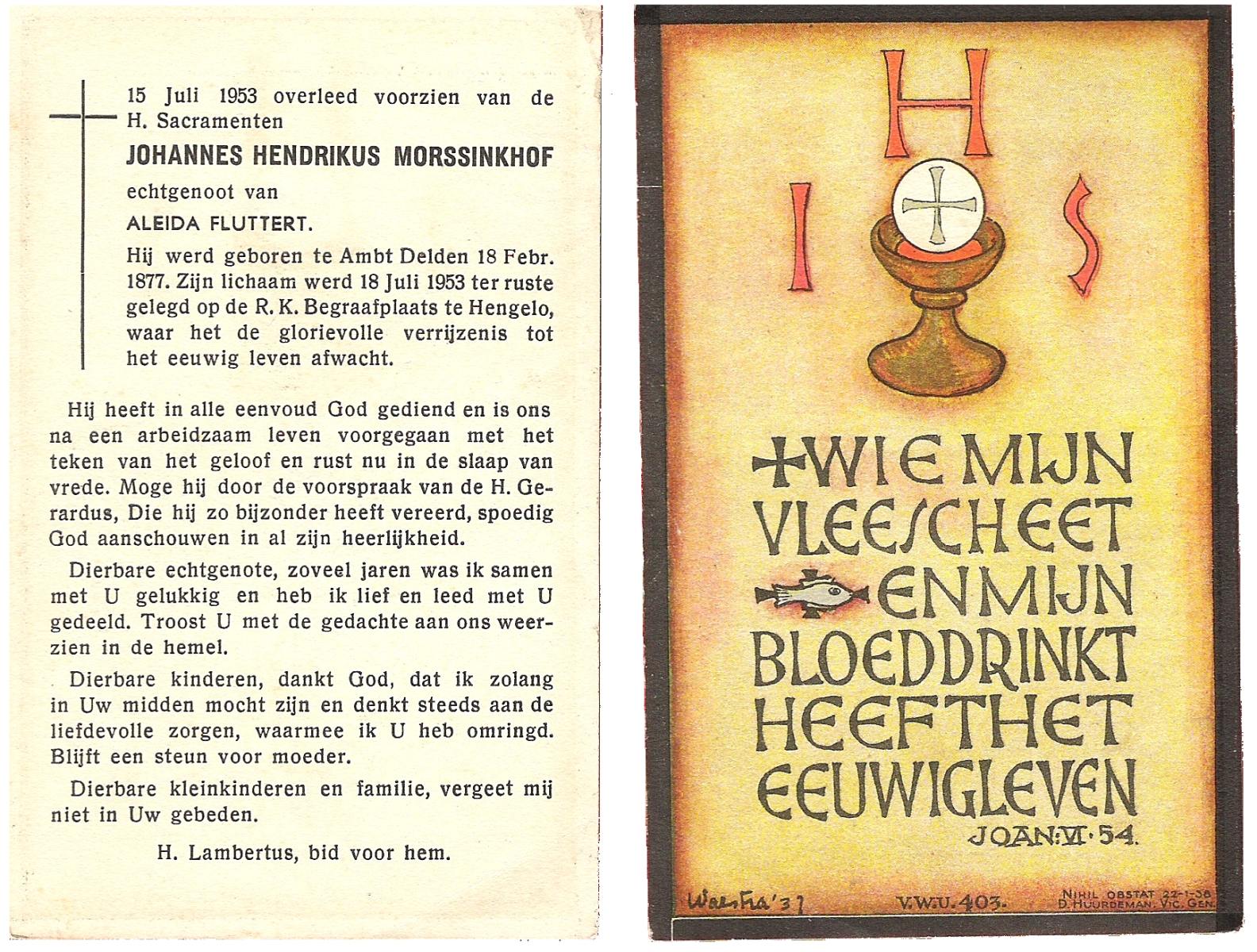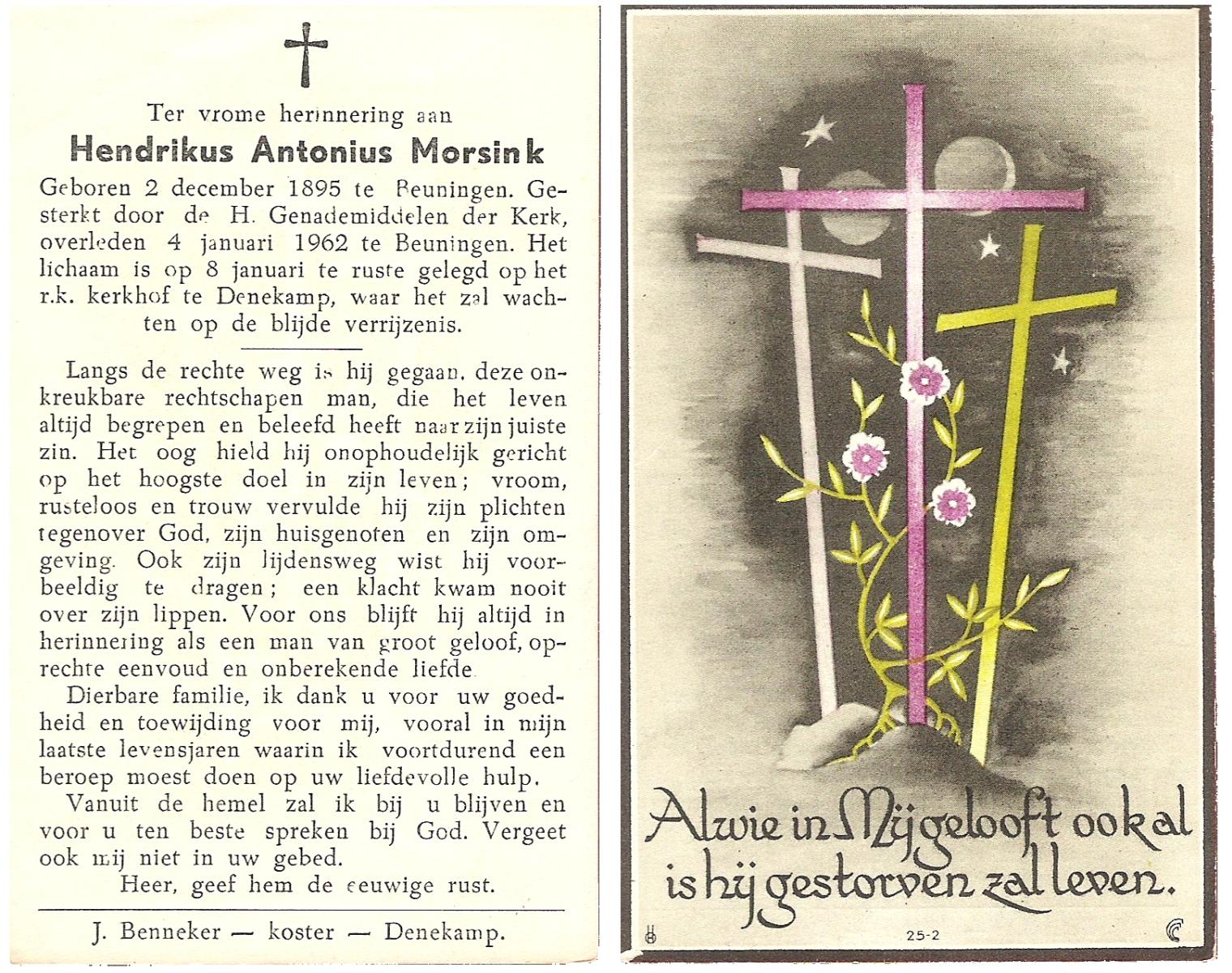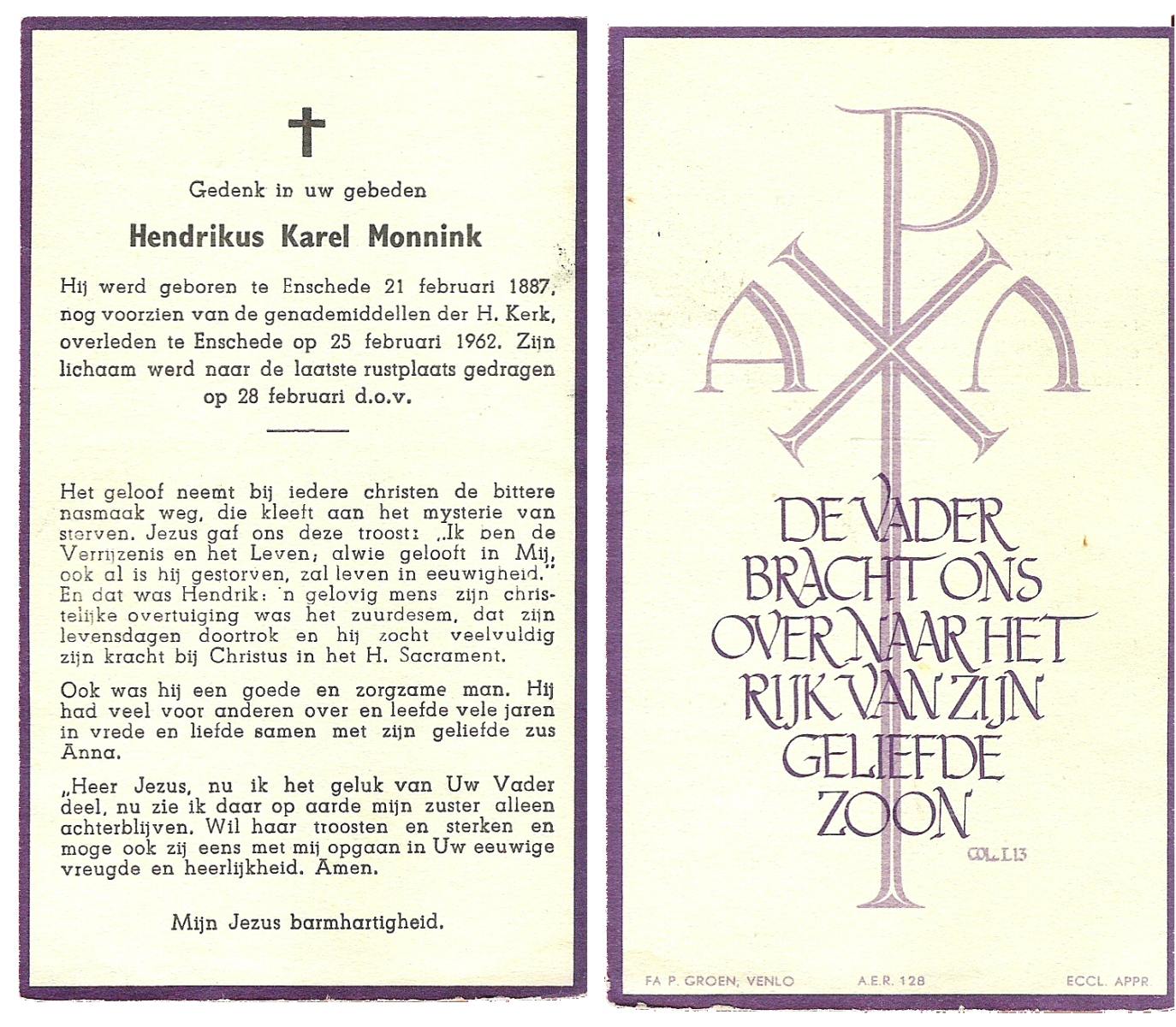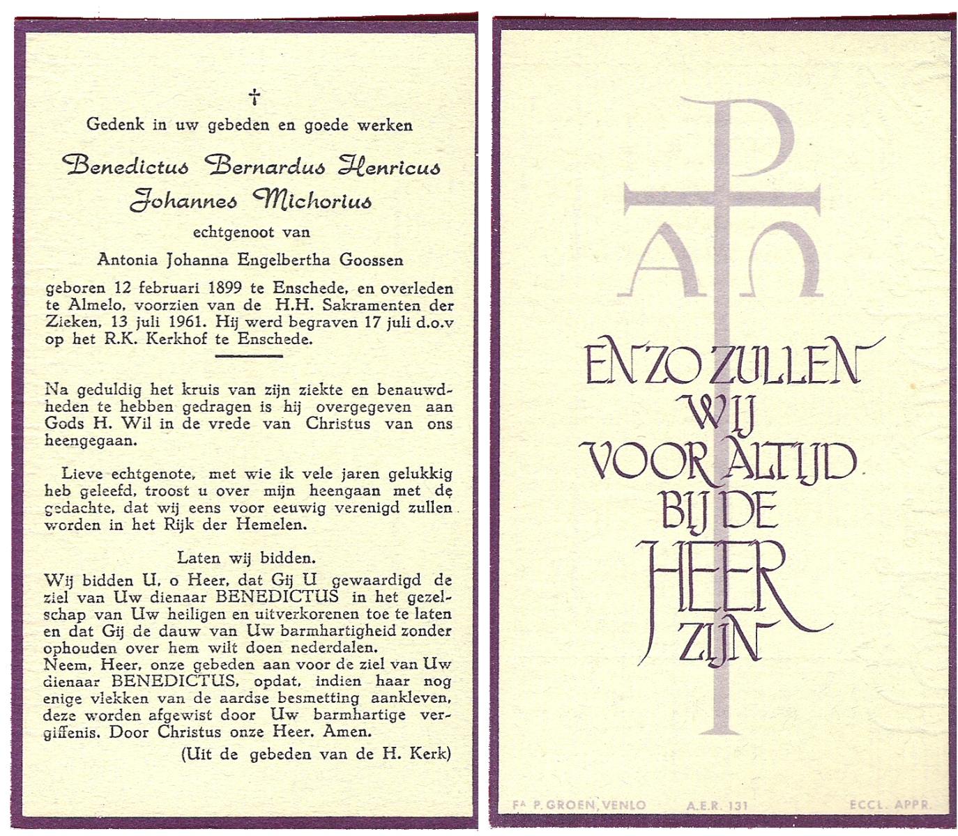 MICHORIUS, Hendrikus, geboren op 13-12-1886 te Haaksbergen, overleden op 26-1-1959 te Haaksbergen op 72-jarige leeftijd, begraven op 30-1-1959 te Haaksbergen.