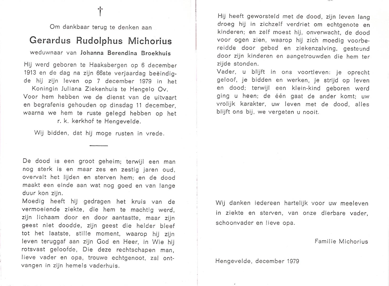 MICHORIUS, Gerardus Rudolphus, geboren op 6-12-1913 te Haaksbergen, overleden op 7-12-1979 te Hengelo (Ov.) op 66-jarige leeftijd, begraven op 11-12-1979 te Hengevelde.