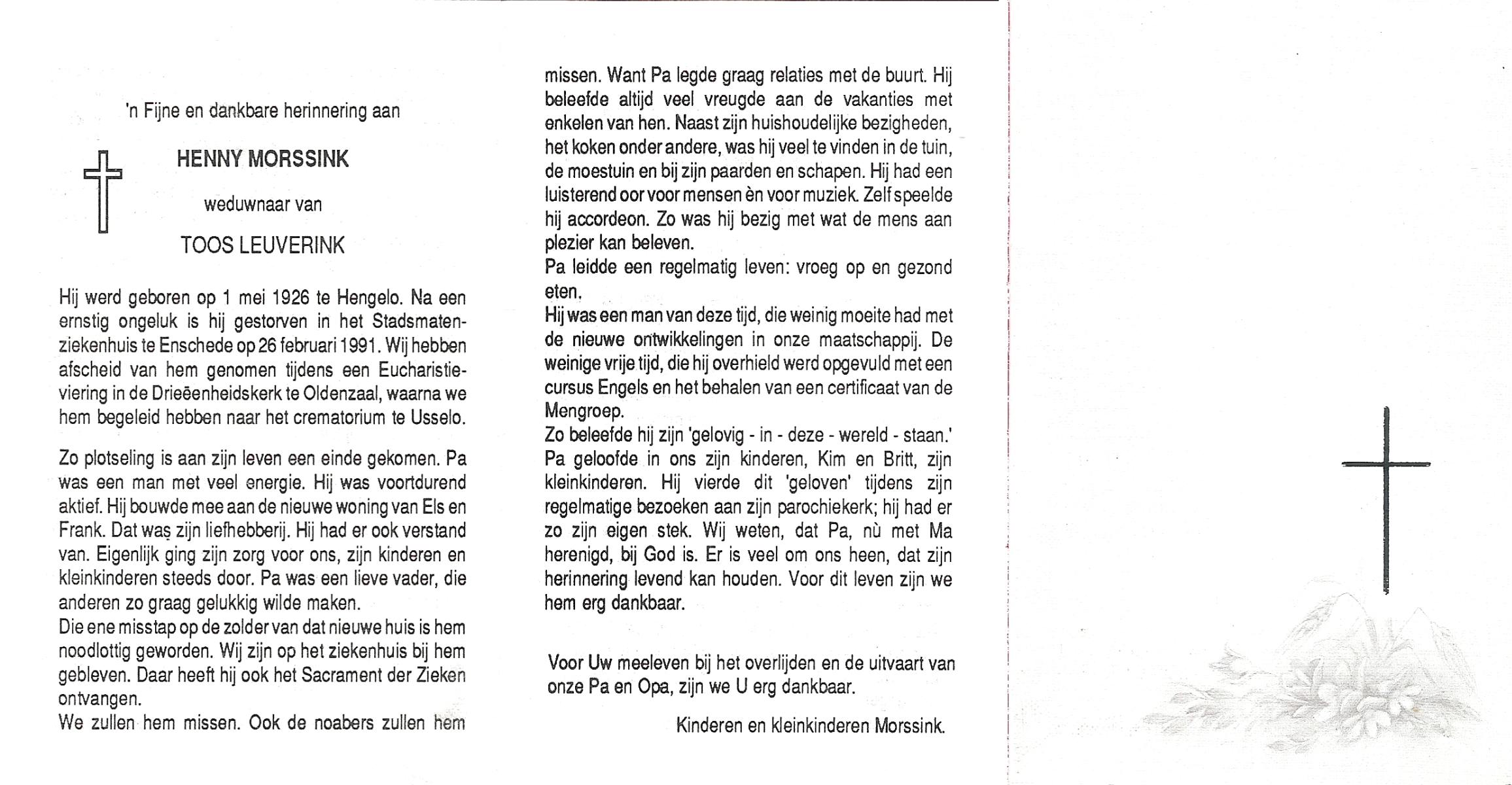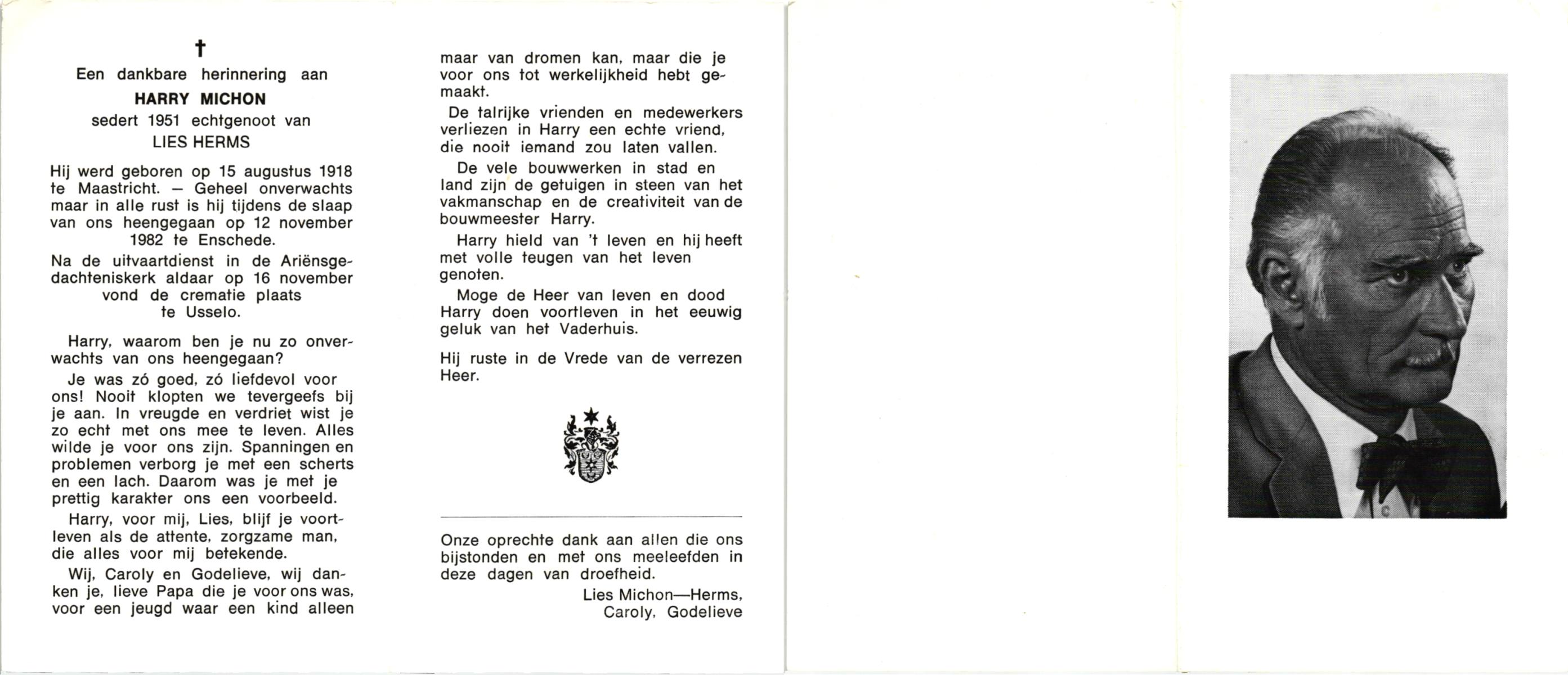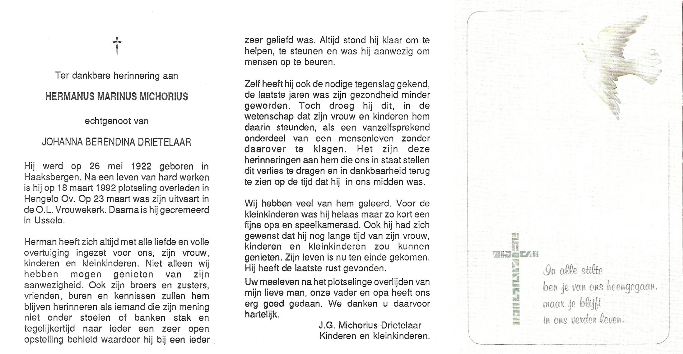 MICHORIUS, Hermanus Marinus, geboren op 26-5-1922 te Haaksbergen, overleden op 18-3-1992 te Hengelo (Ov.) op 69-jarige leeftijd, gecremeerd op 23-3-1992 te Usselo.