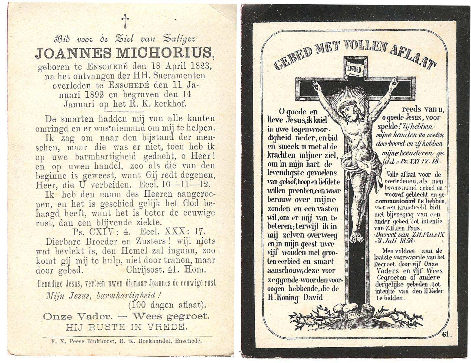 MICHORIUS, Joannes, geboren op 18-04-1823 te Enschede, overleden op 11-01-1892 te Enschede op 68-jarige leeftijd, begraven op 14-01-1892 te Enschede.