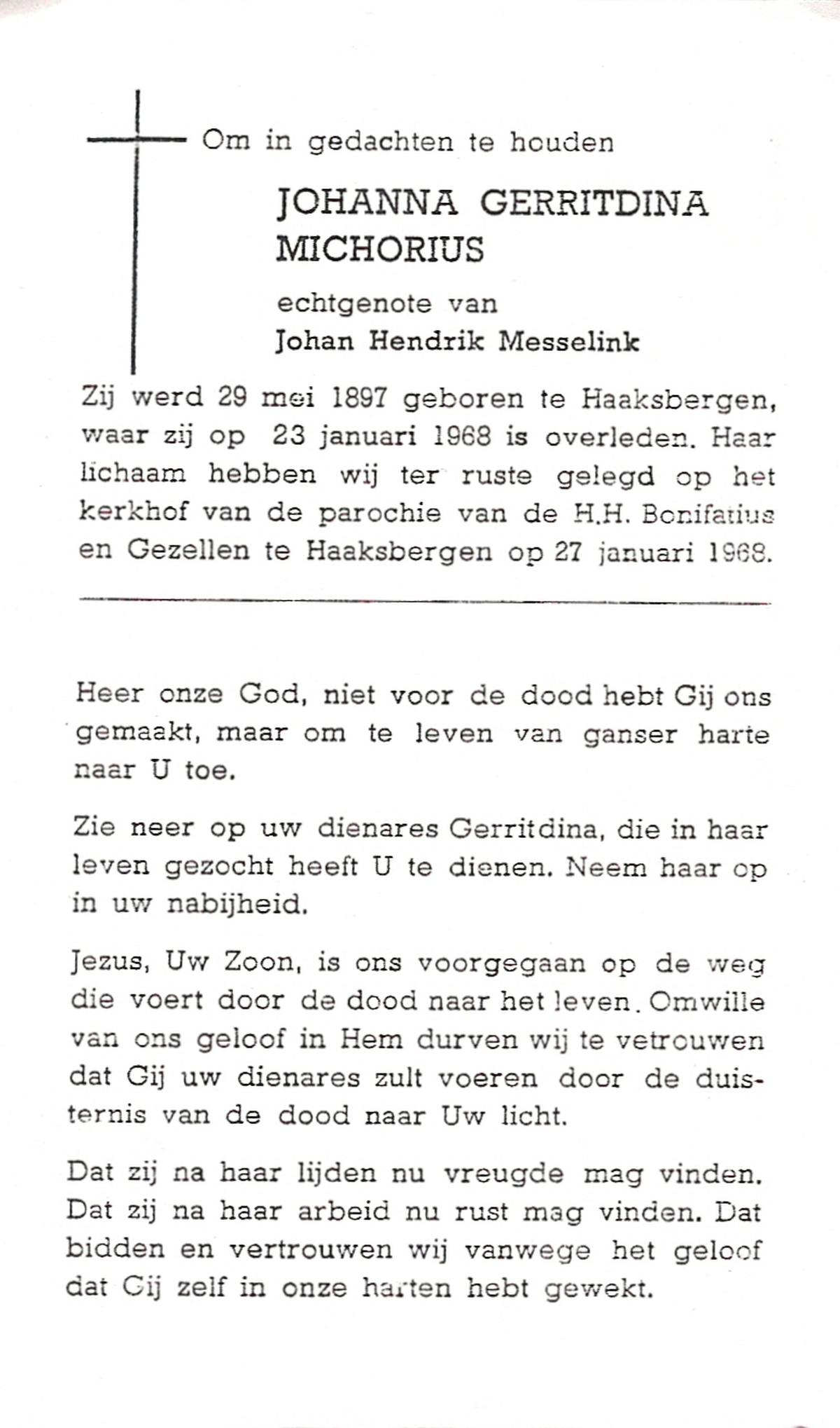 MICHORIUS, Johanna Gerritdina, geboren op 29-05-1897 te Haaksbergen, overleden op 23-1-1968 te Haaksbergen op 70-jarige leeftijd, begraven op 27-1-1968 te Haaksbergen.