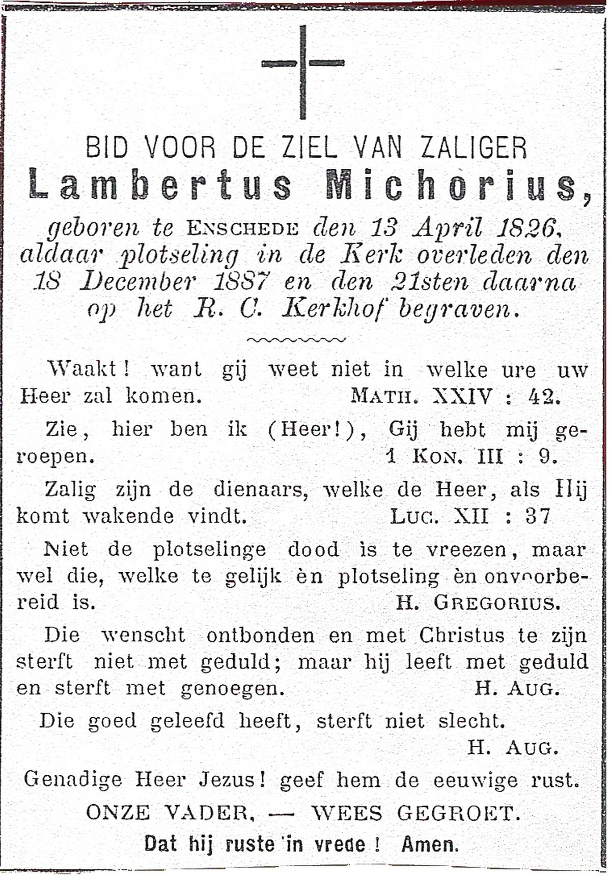 MICHORIUS, Lambertus, geboren op 13-04-1826 te Enschede, overleden op 18-12-1887 te Enschede op 61-jarige leeftijd, begraven op 21-12-1887 te Enschede.