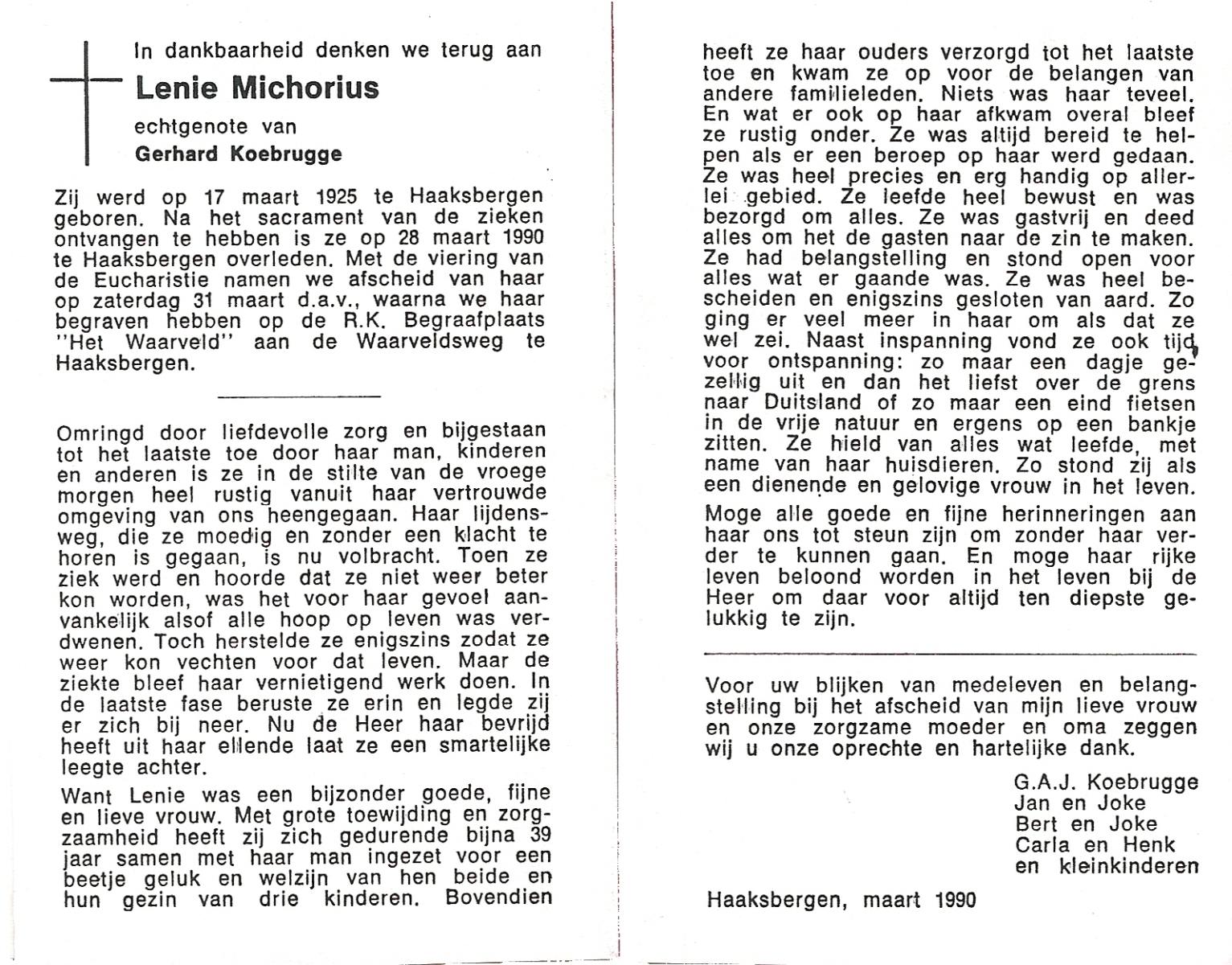 MICHORIUS, Lenie, geboren op 17-3-1925 te Haaksbergen, overleden op 28-3-1990 te Haaksbergen op 65-jarige leeftijd, begraven op 31-3-1990 te Haaksbergen.