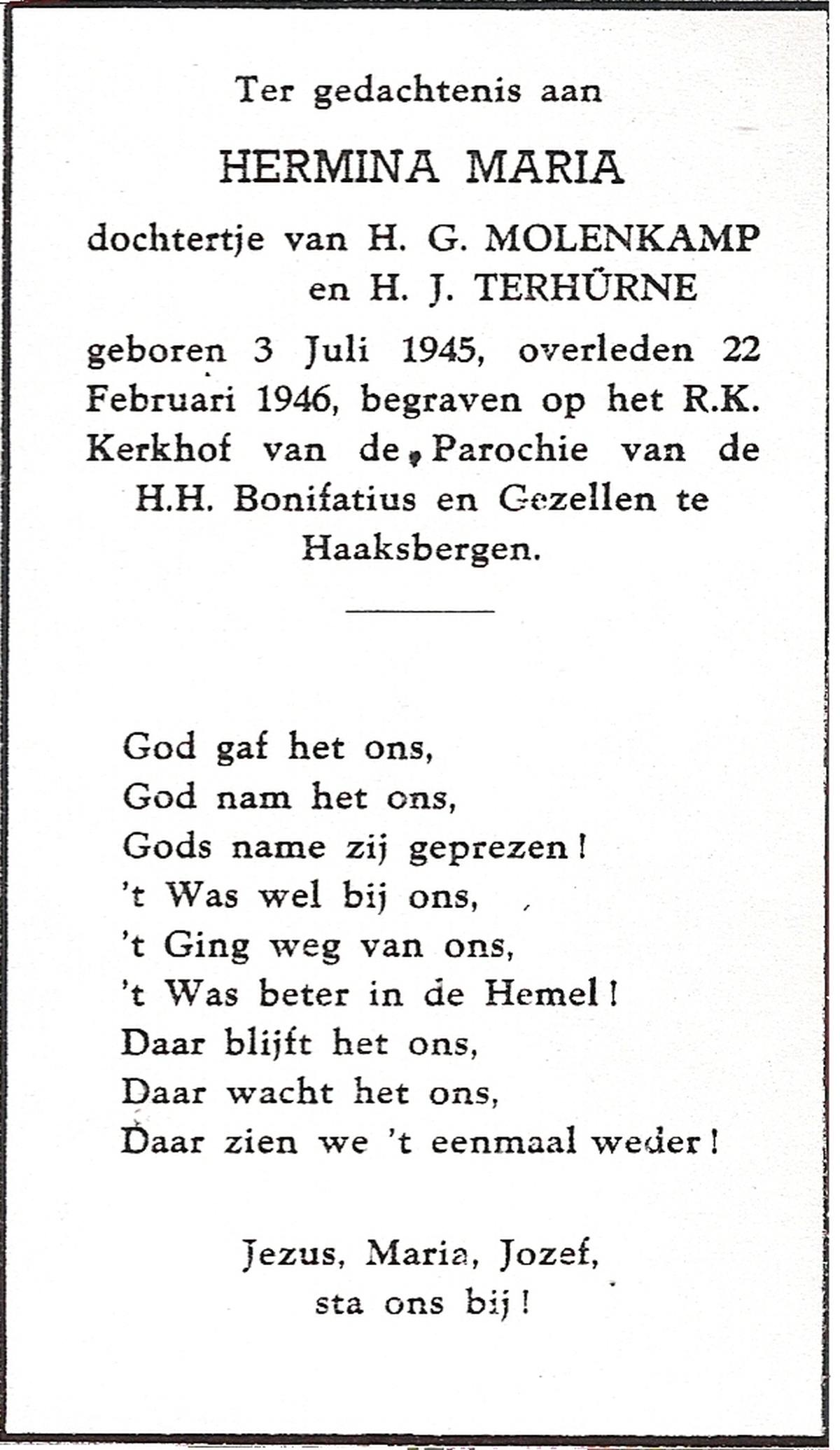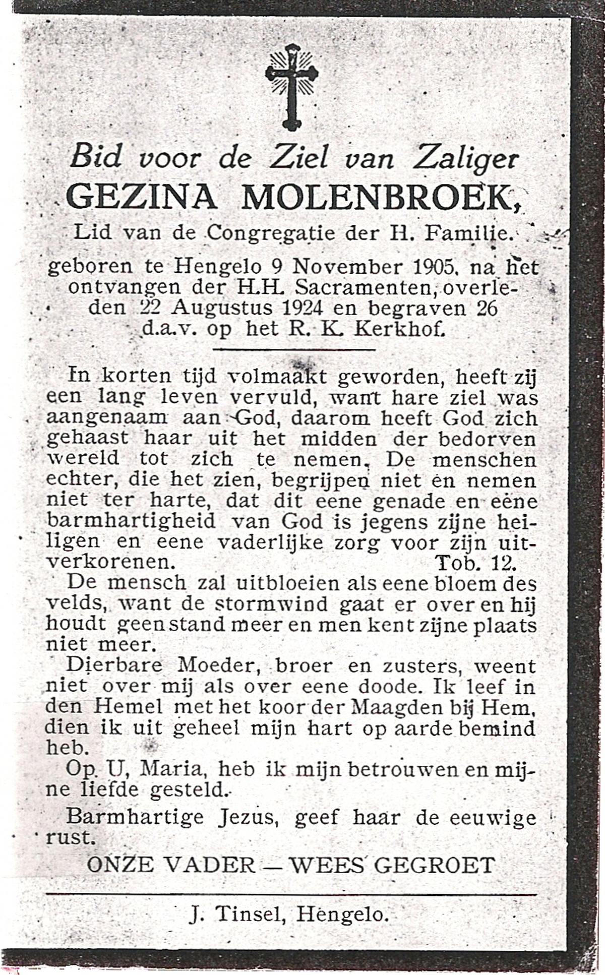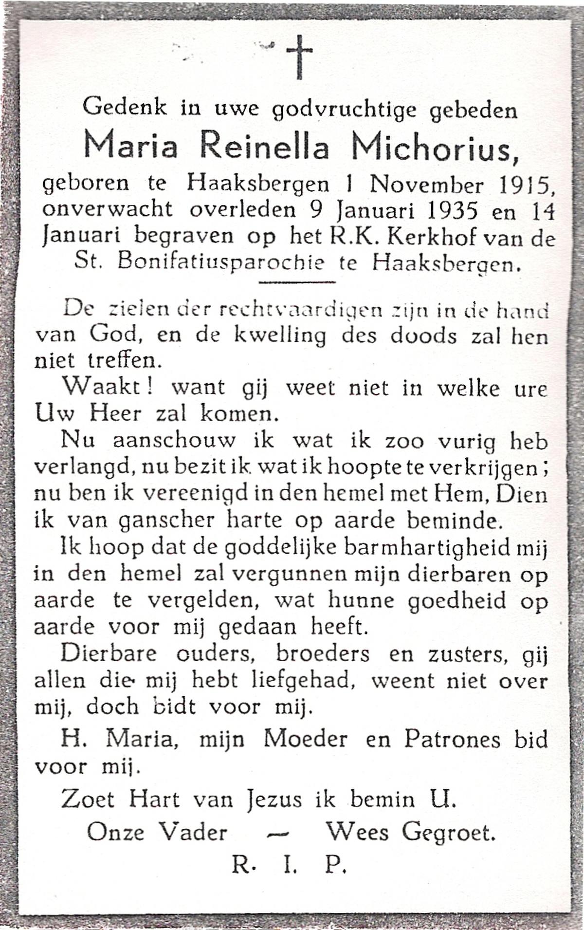 MICHORIUS, Maria Reinella, geboren op 1-11-1915 te Haaksbergen, overleden op 9-1-1935 op 19-jarige leeftijd, begraven op 14-1-1935 te Haaksbergen.