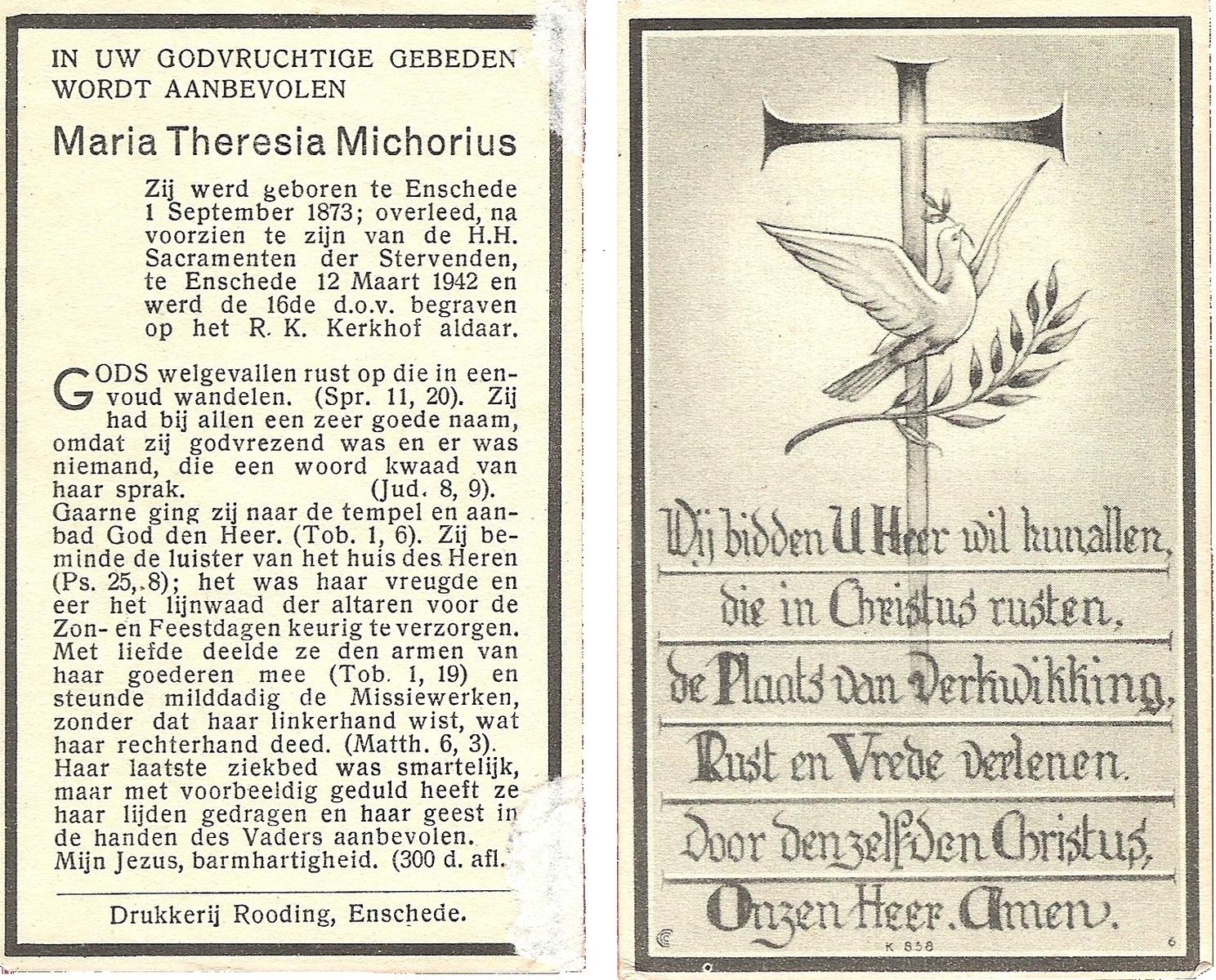 MICHORIUS, Maria Theresia, geboren op 01-09-1873 te Enschede, overleden op 12-3-1942 te Enschede op 68-jarige leeftijd, begraven op 16-3-1942 te Enschede.