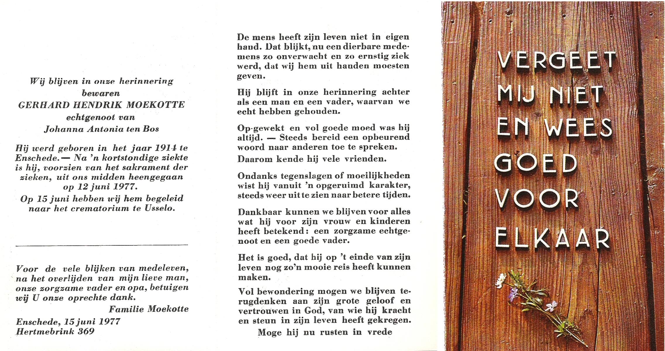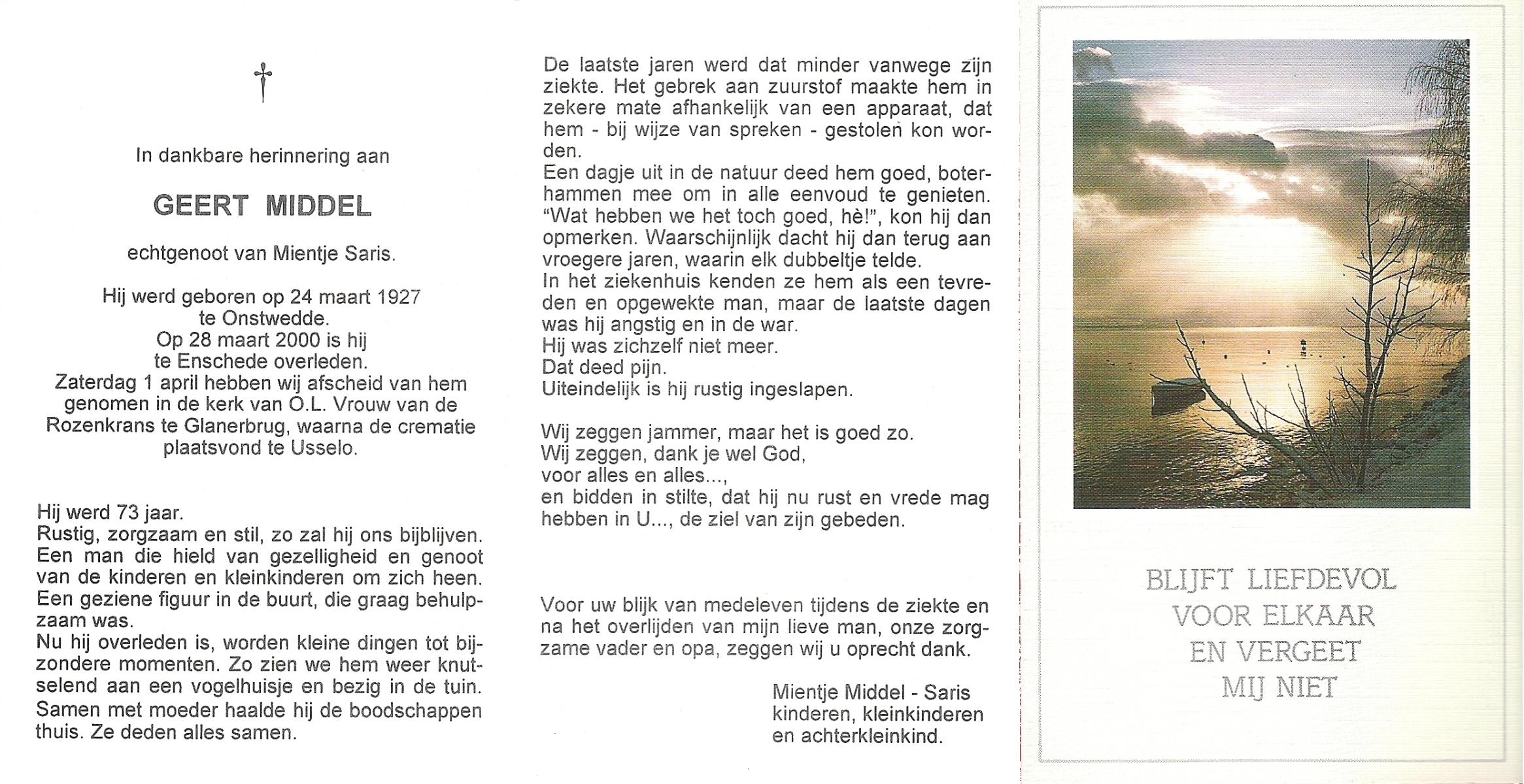 MIDDEL, Geert, geboren op 24-3-1927 te Onstwedde, overleden op 28-3-2000 te Enschede op 73-jarige leeftijd, gecremeerd op 1-4-2000 te Usselo.