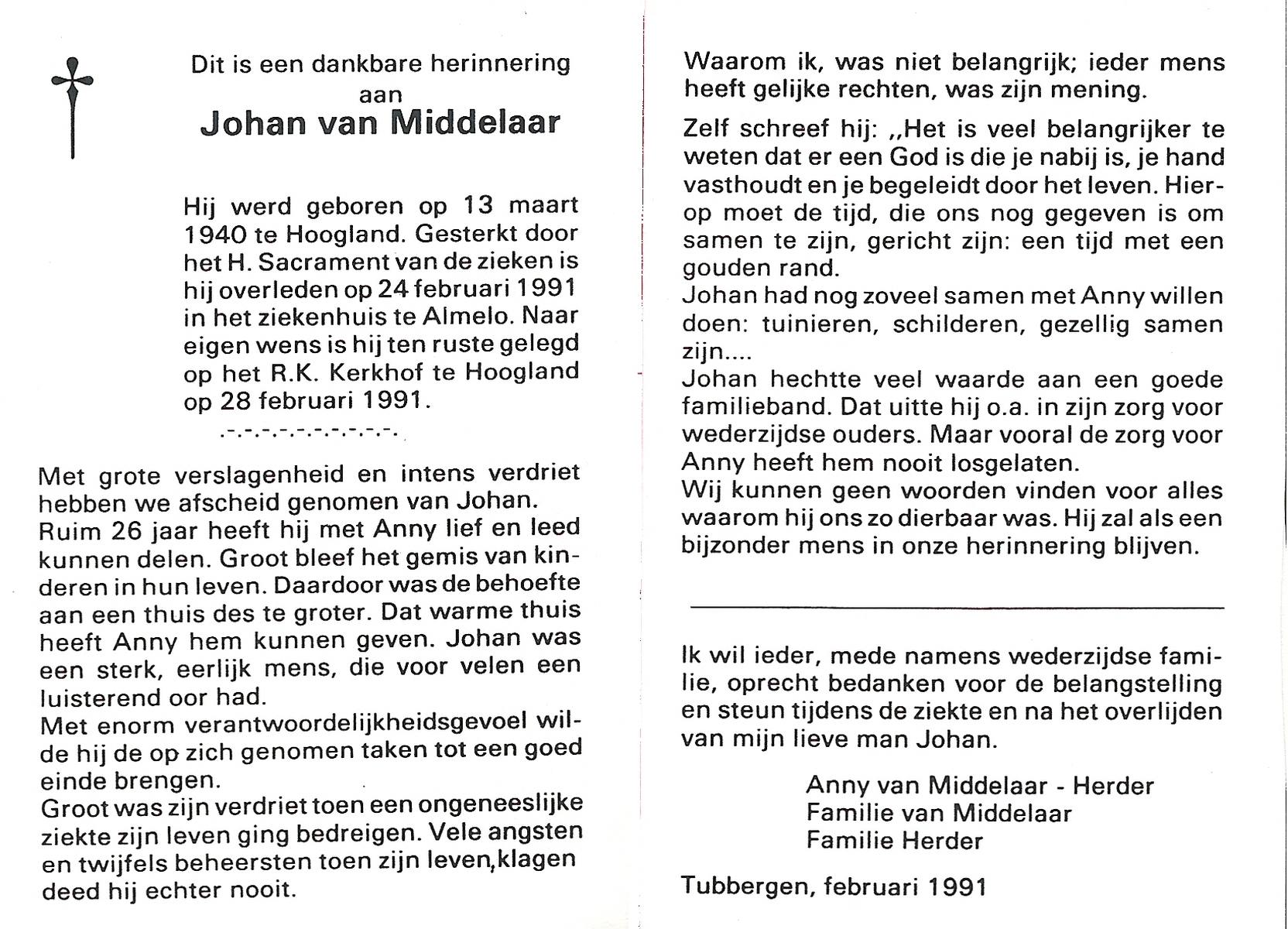 MIDDELAAR, van, Johan, geboren op 13-3-1940 te Hoogland, overleden op 24-2-1991 te Almelo op 50-jarige leeftijd, begraven op 28-2-1991 te Hoogland R.K.kerkhof.
