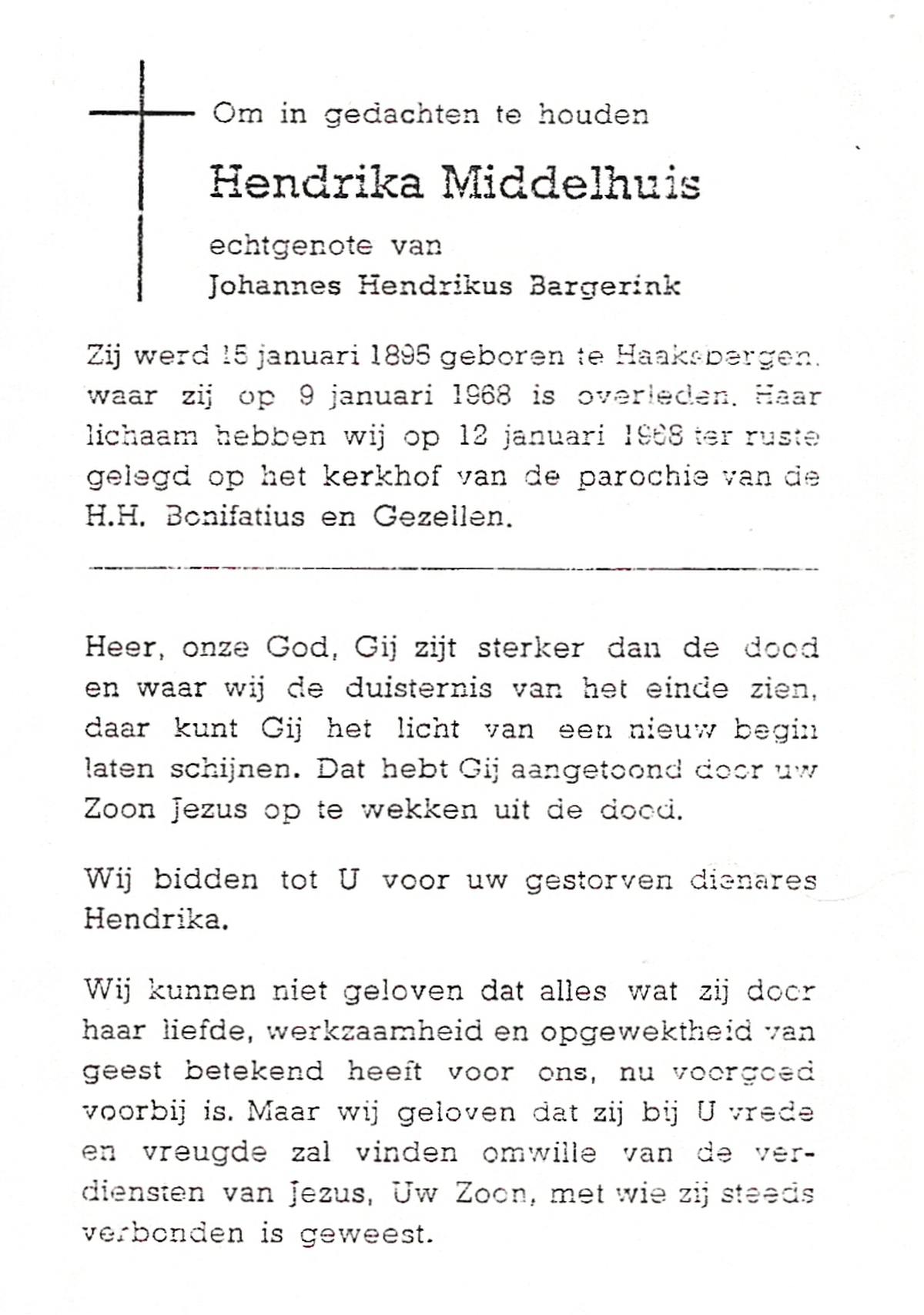 MIDDELHUIS, Hendrika, geboren op 15-01-1895 te Haaksbergen, overleden op 9-1-1968 te Haaksbergen op 72-jarige leeftijd, begraven op 12-1-1968 te Haaksbergen.