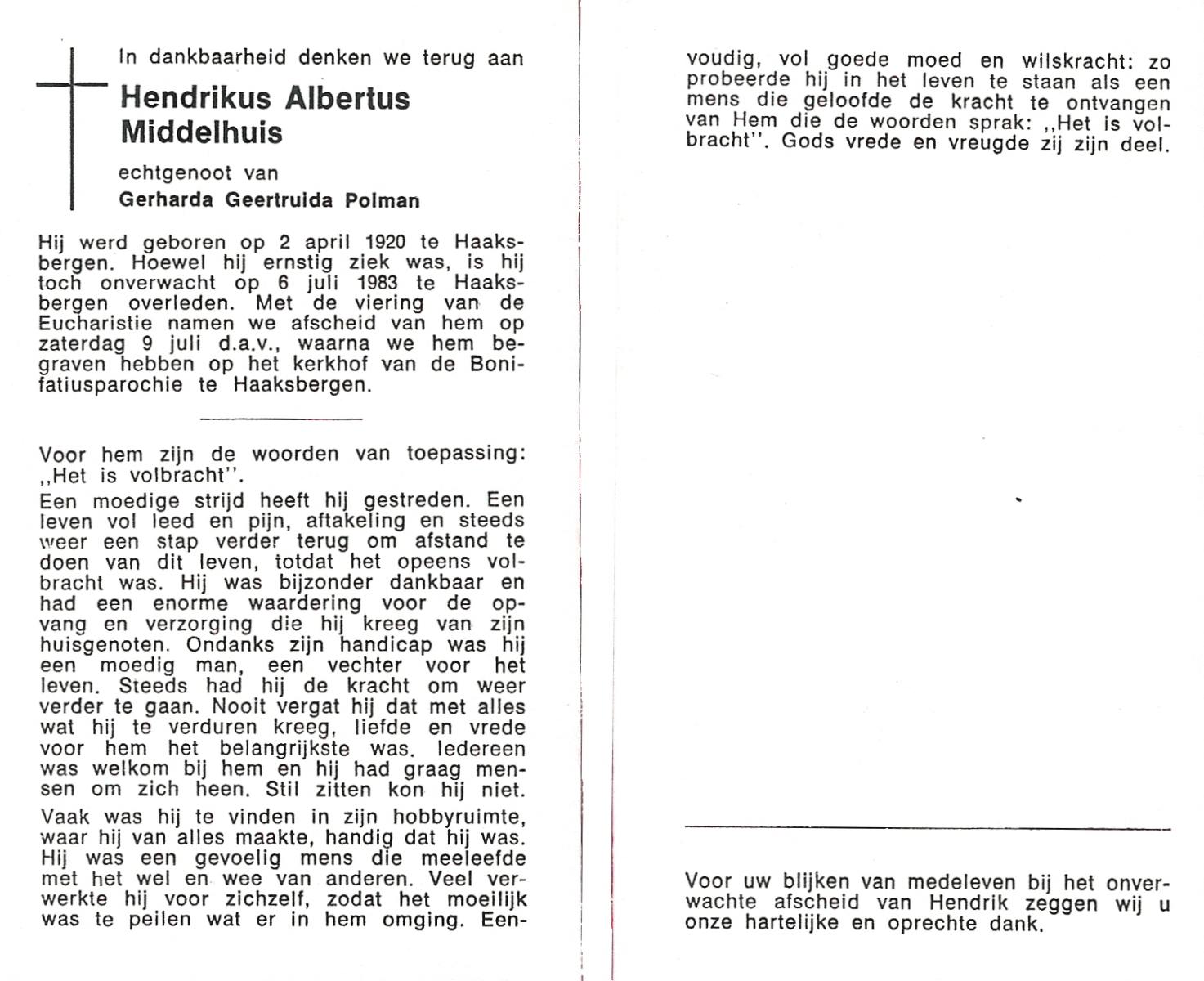 MIDDELHUIS, Hendrikus Albertus, geboren op 2-4-1920 te Haaksbergen, overleden op 6-7-1983 te Haaksbergen op 63-jarige leeftijd, begraven op 9-7-1983 te Haaksbergen.