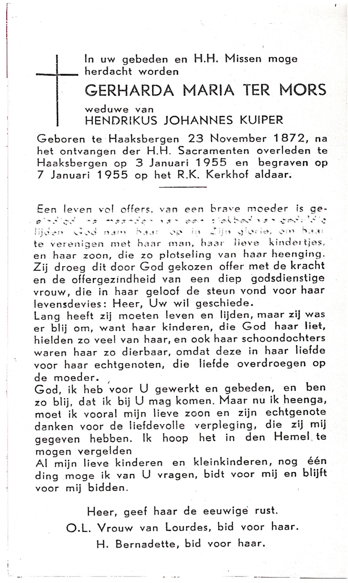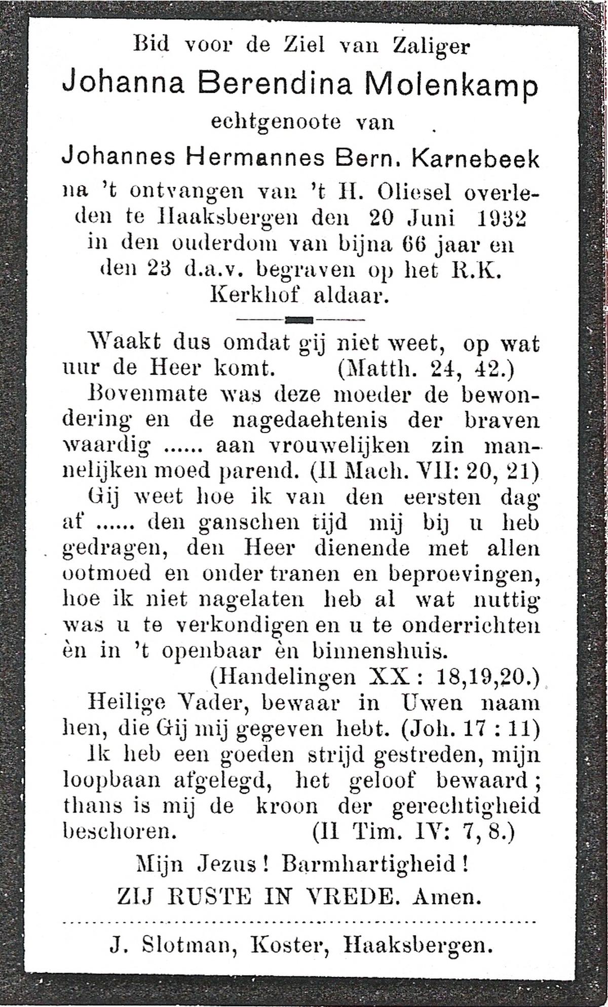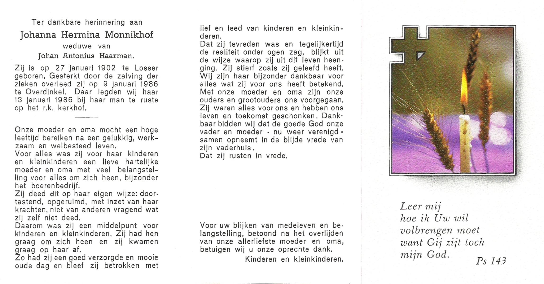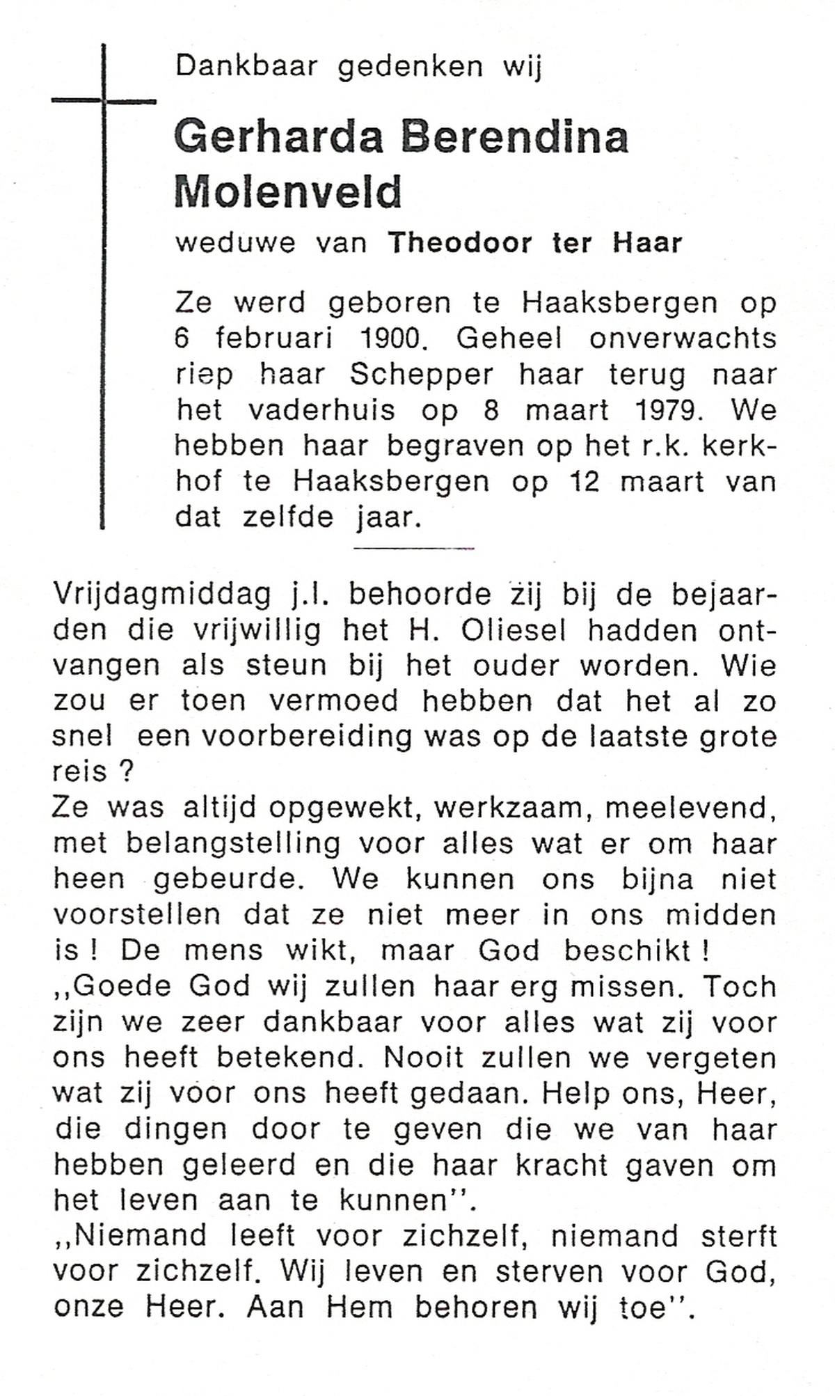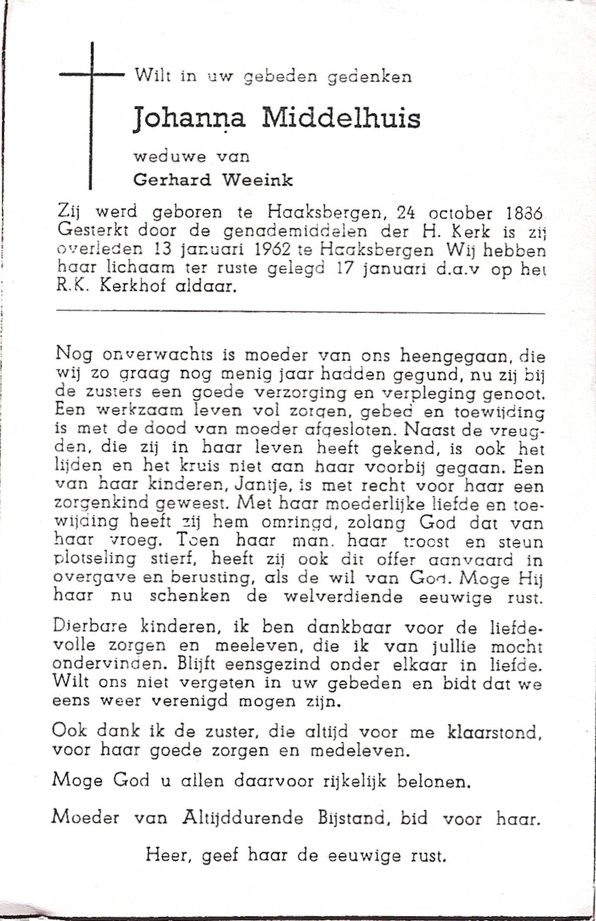 MIDDELHUIS, Johanna, geboren op 24-10-1886 te Haaksbergen, overleden op 13-1-1962 te Haaksbergen op 75-jarige leeftijd, begraven op 17-1-1962 te Haaksbergen.