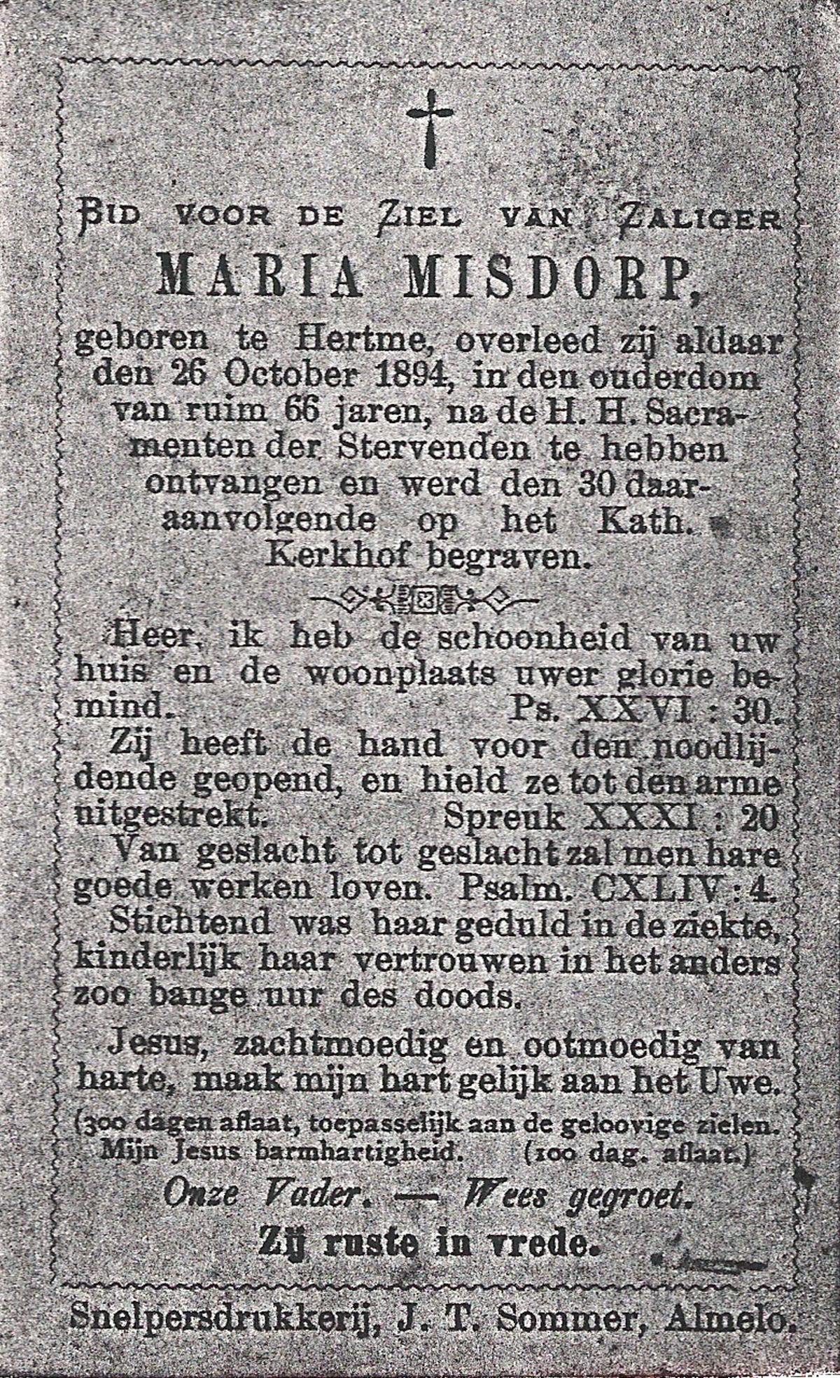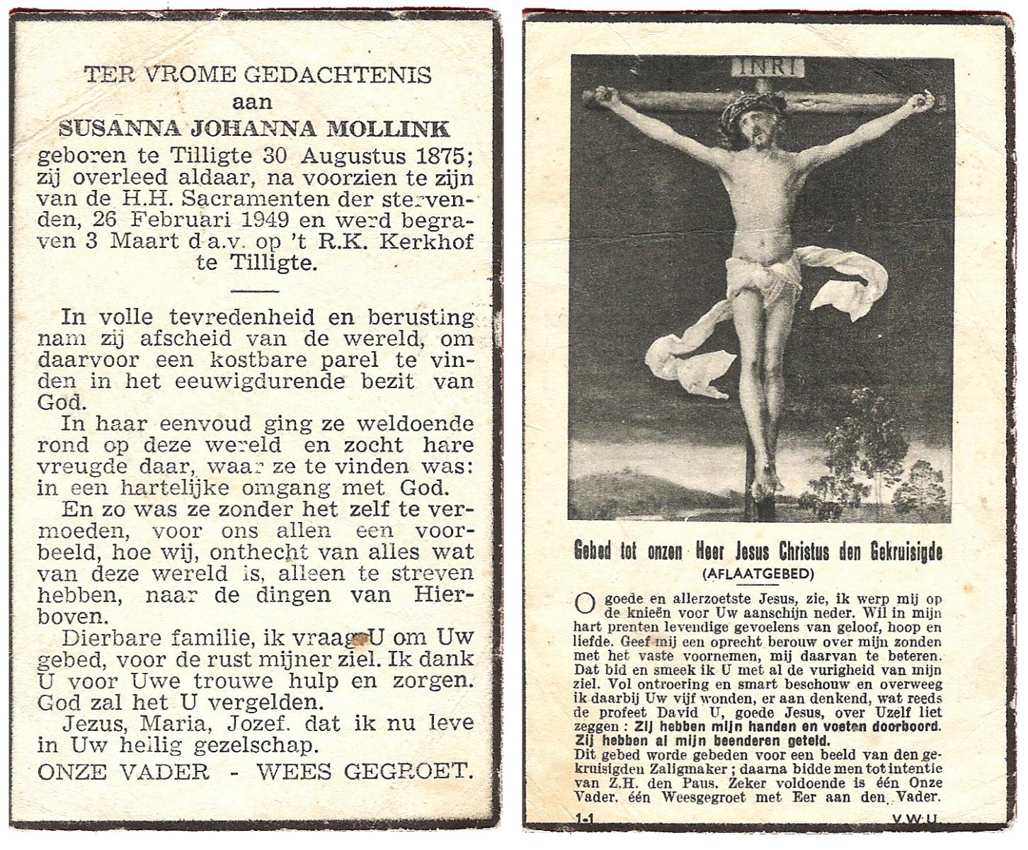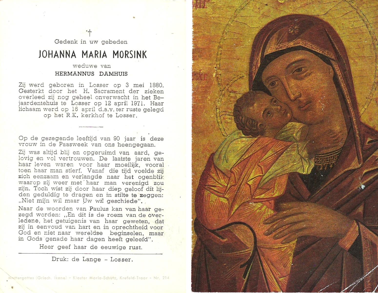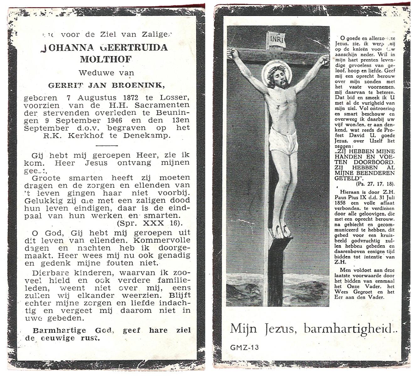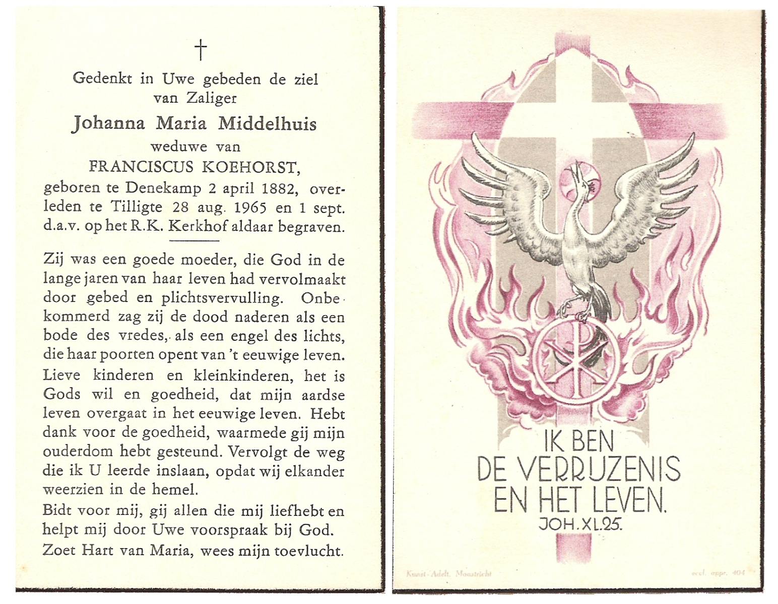 MIDDELHUIS, Johanna Maria, geboren op 02-04-1882 te Denekamp, overleden op 28-8-1965 te Tilligte op 83-jarige leeftijd, begraven op 1-9-1965 te Tilligte.