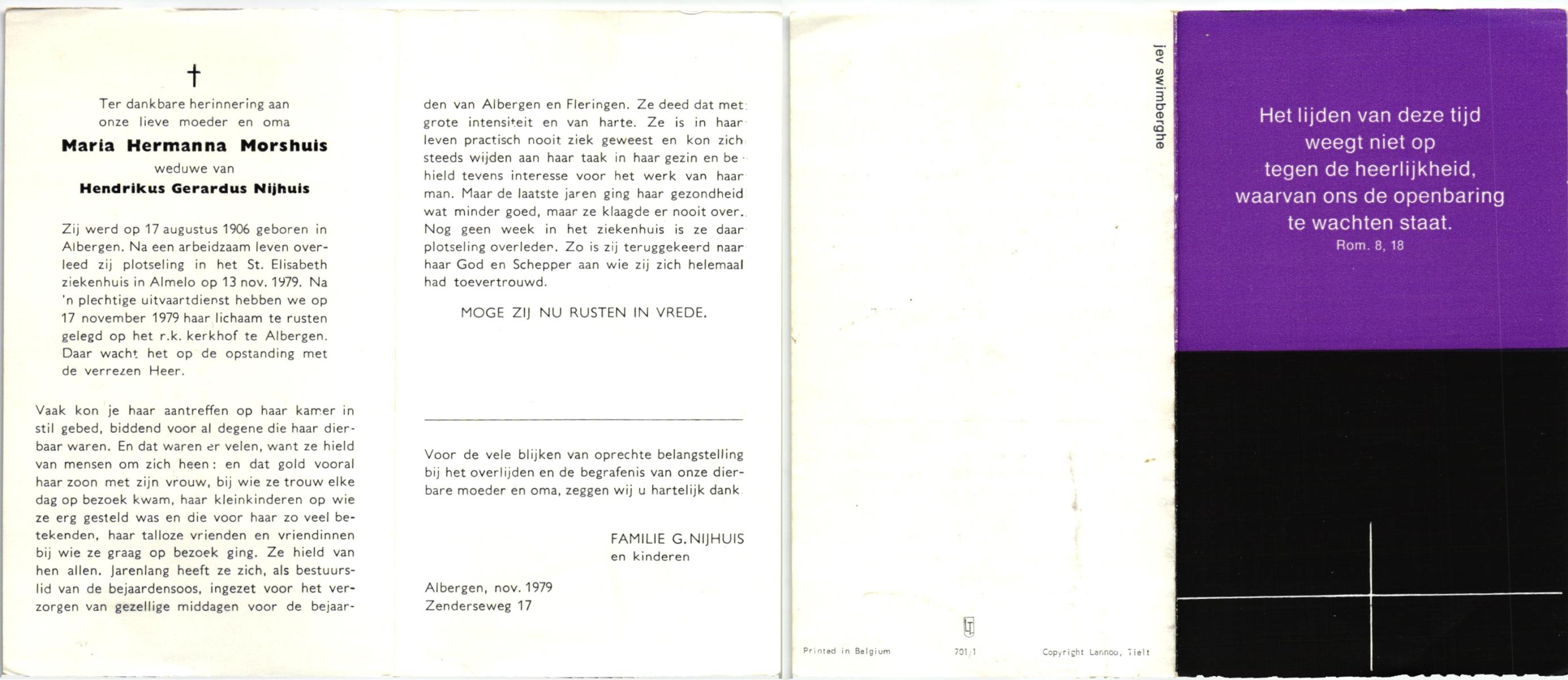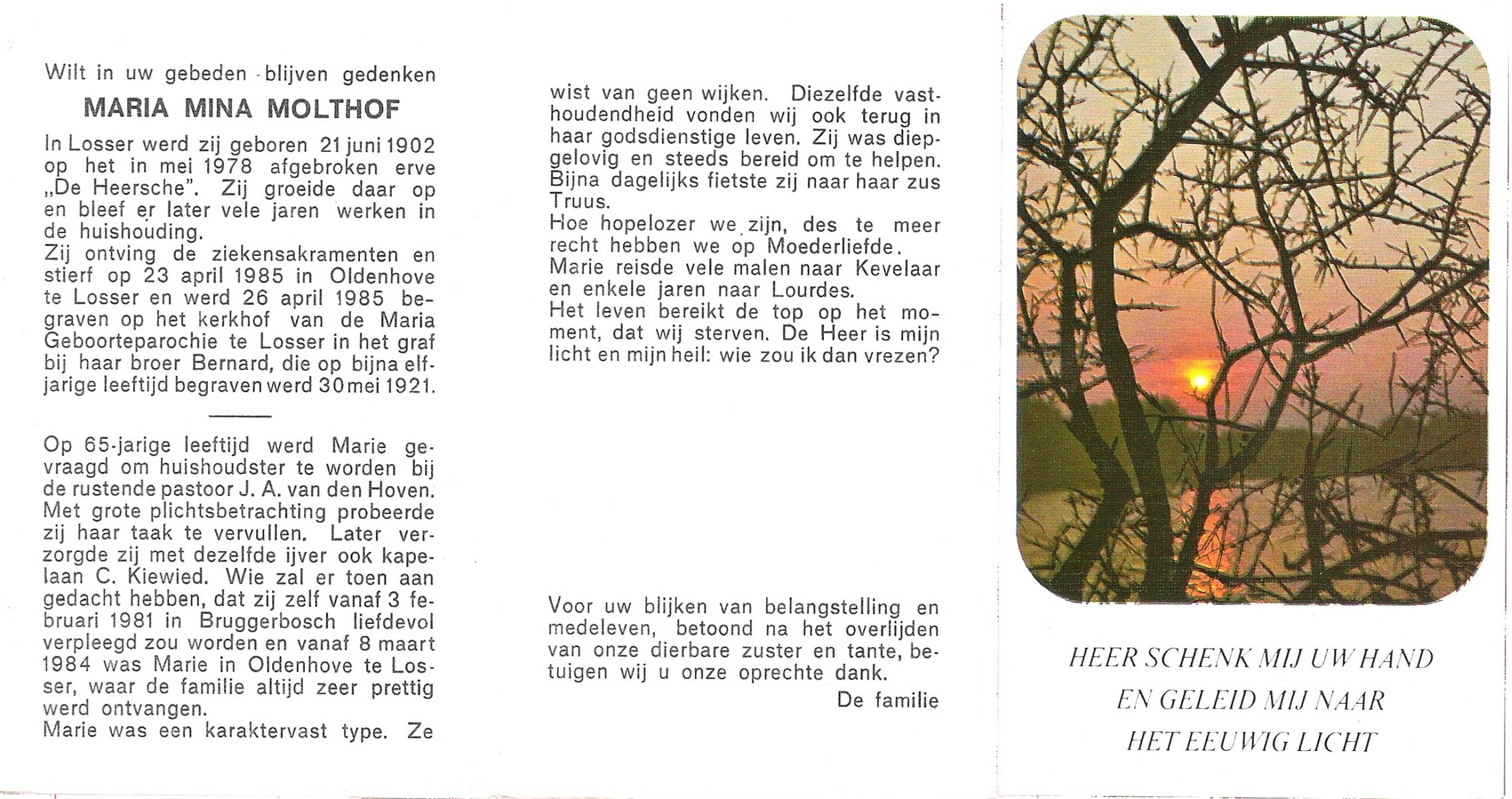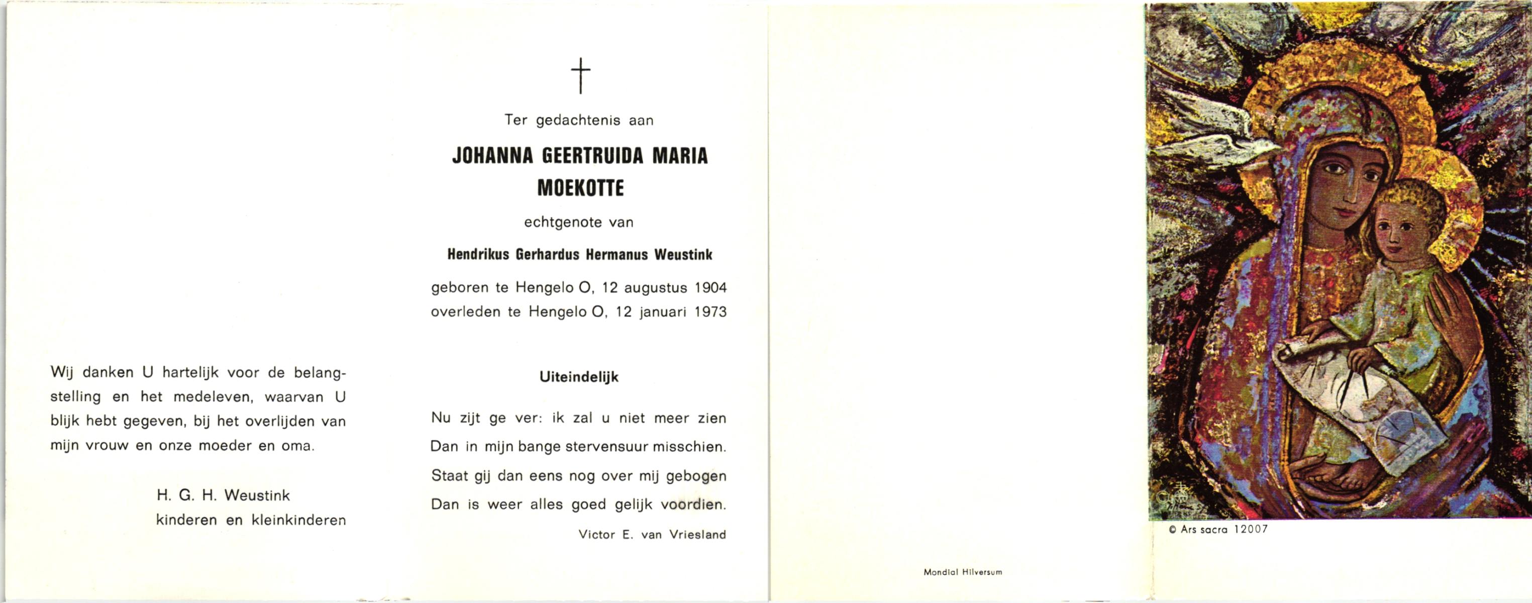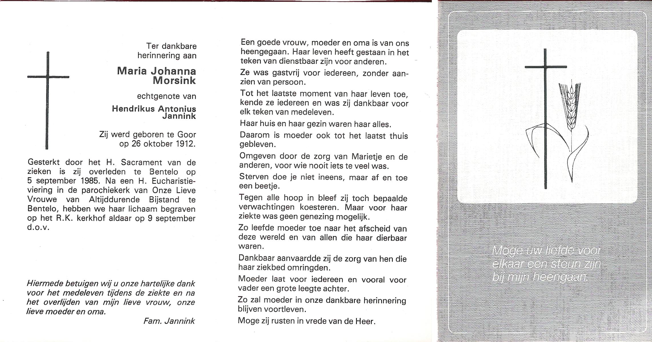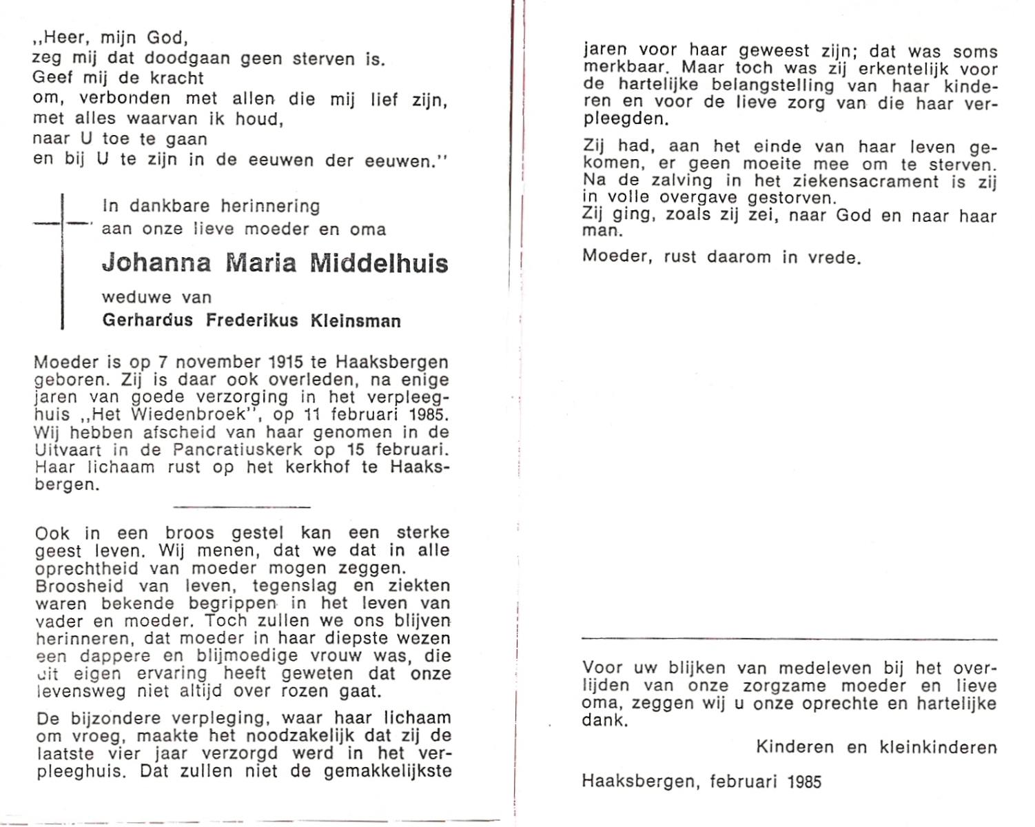 MIDDELHUIS, Johanna Maria, geboren op 7-11-1915 te Haaksbergen, overleden op 11-2-1985 te Haaksbergen op 69-jarige leeftijd, begraven op 15-2-1985 te Haaksbergen.