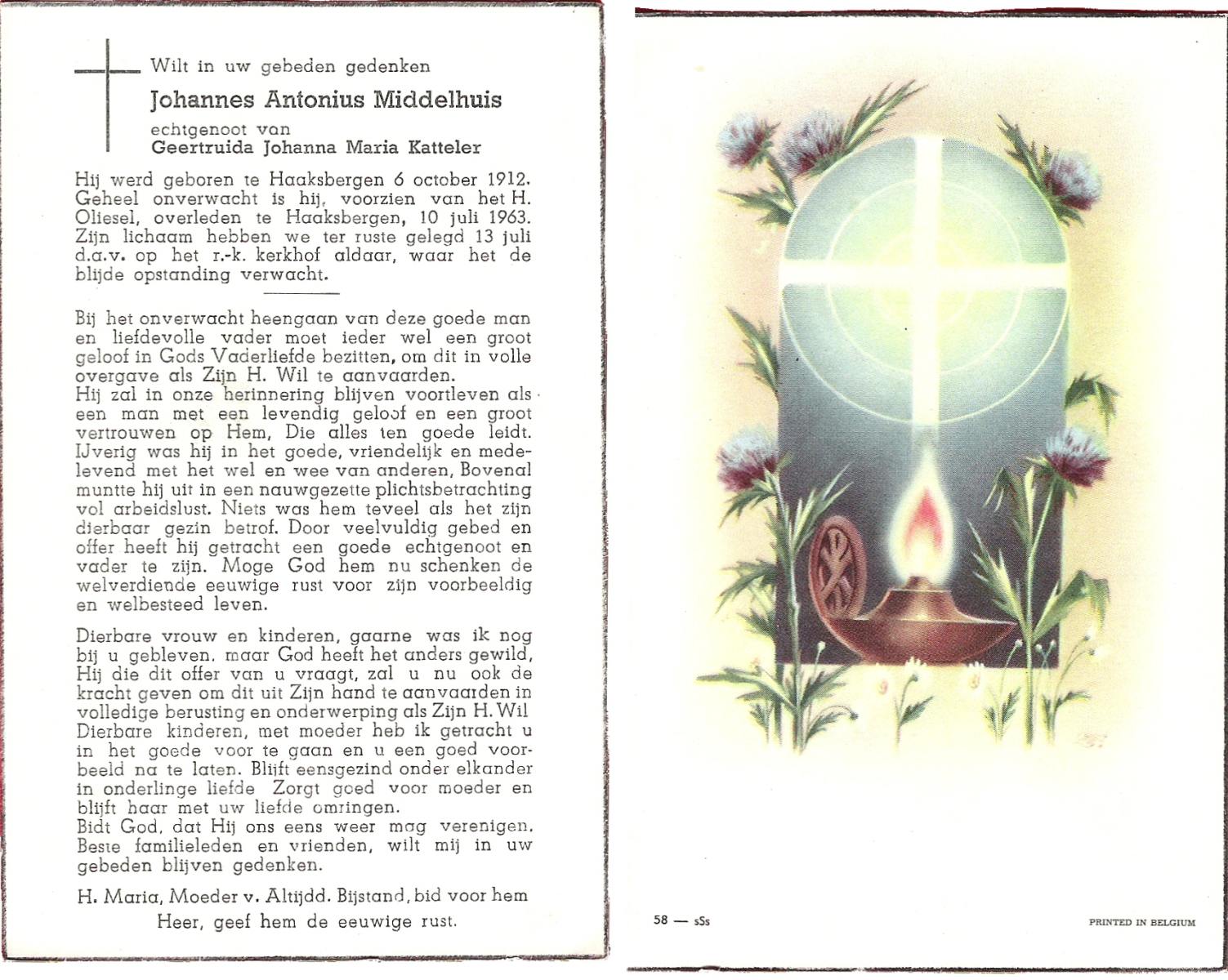 MIDDELHUIS, Johannes Antonius, geboren op 6-10-1912 te Haaksbergen, overleden op 10-7-1963 te Haaksbergen op 50-jarige leeftijd, begraven op 13-7-1963 te Haaksbergen.