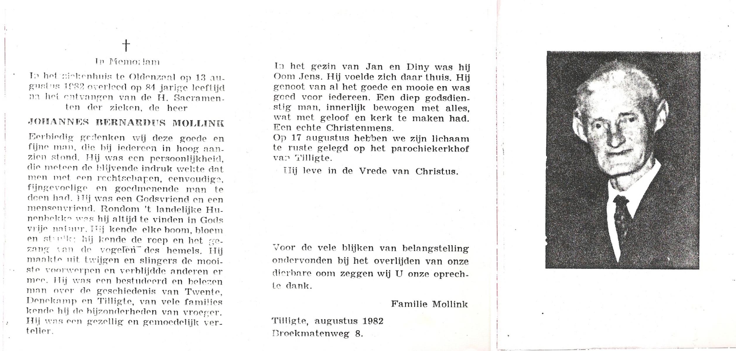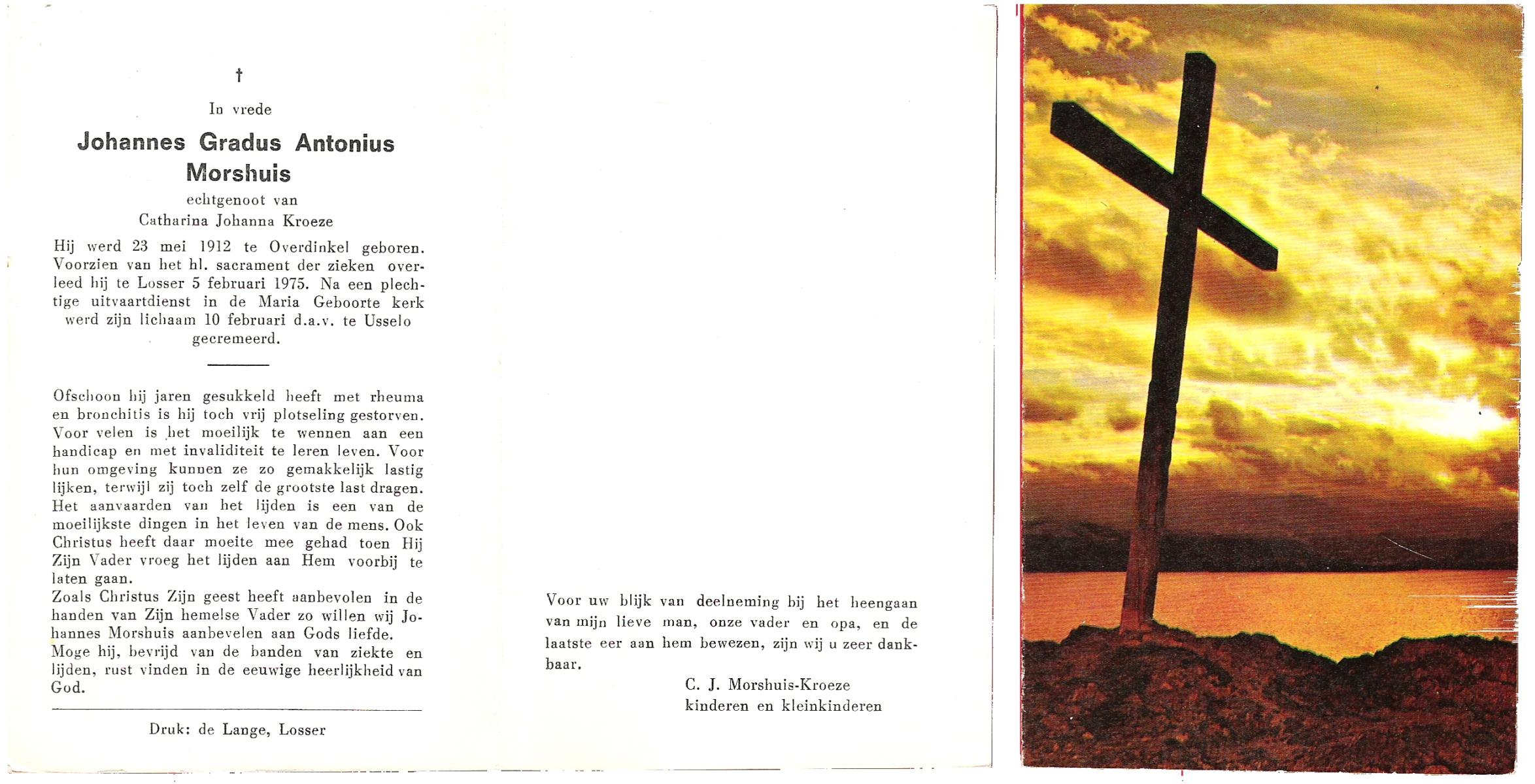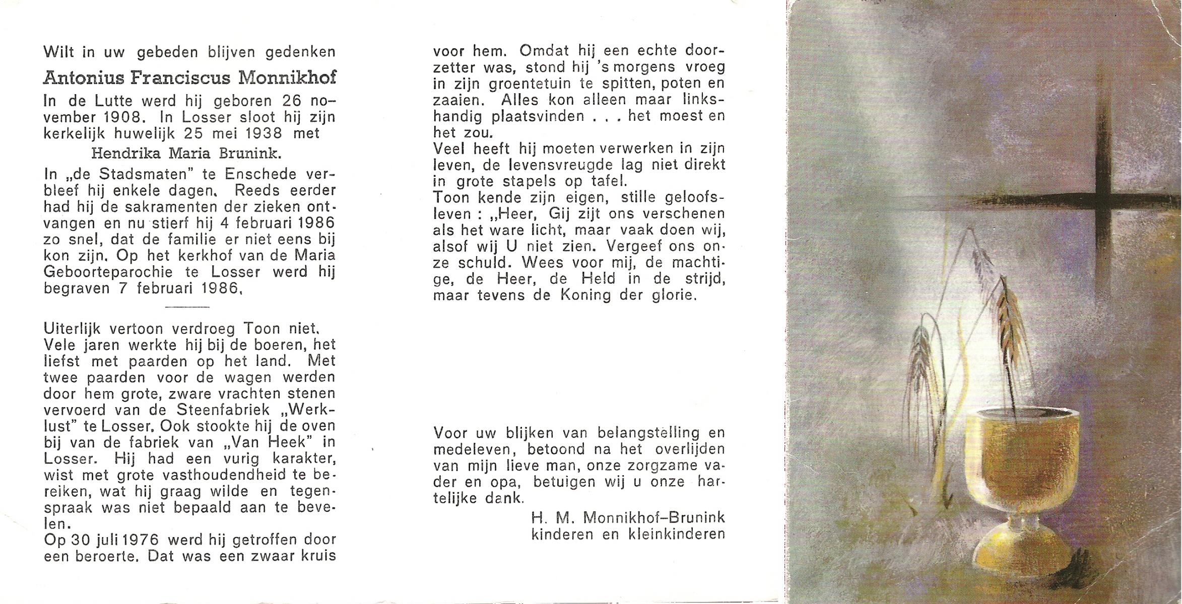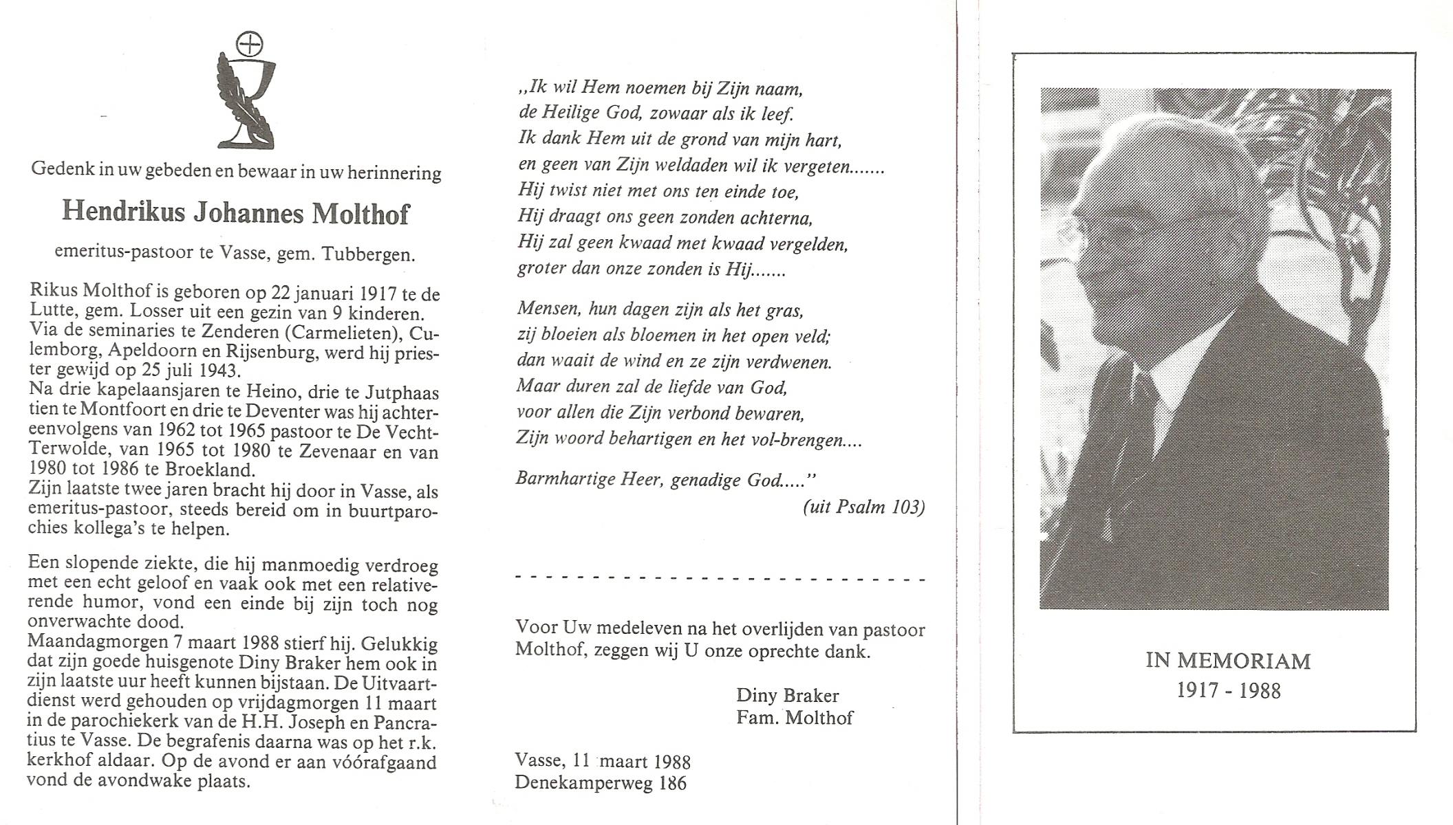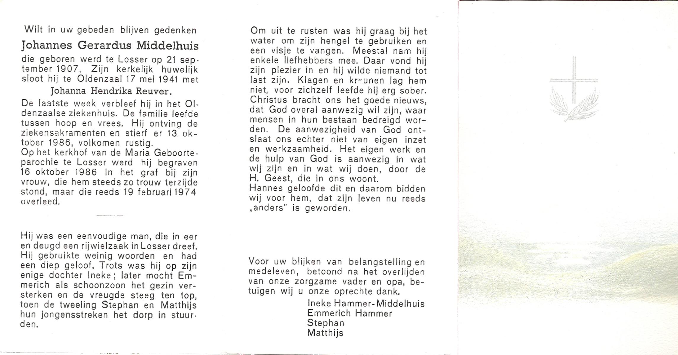 MIDDELHUIS, Johannes Gerardus, geboren op 21-9-1907 te Losser, overleden op 13-10-1986 te Oldenzaal op 79-jarige leeftijd, begraven op 16-10-1986 te Losser.
