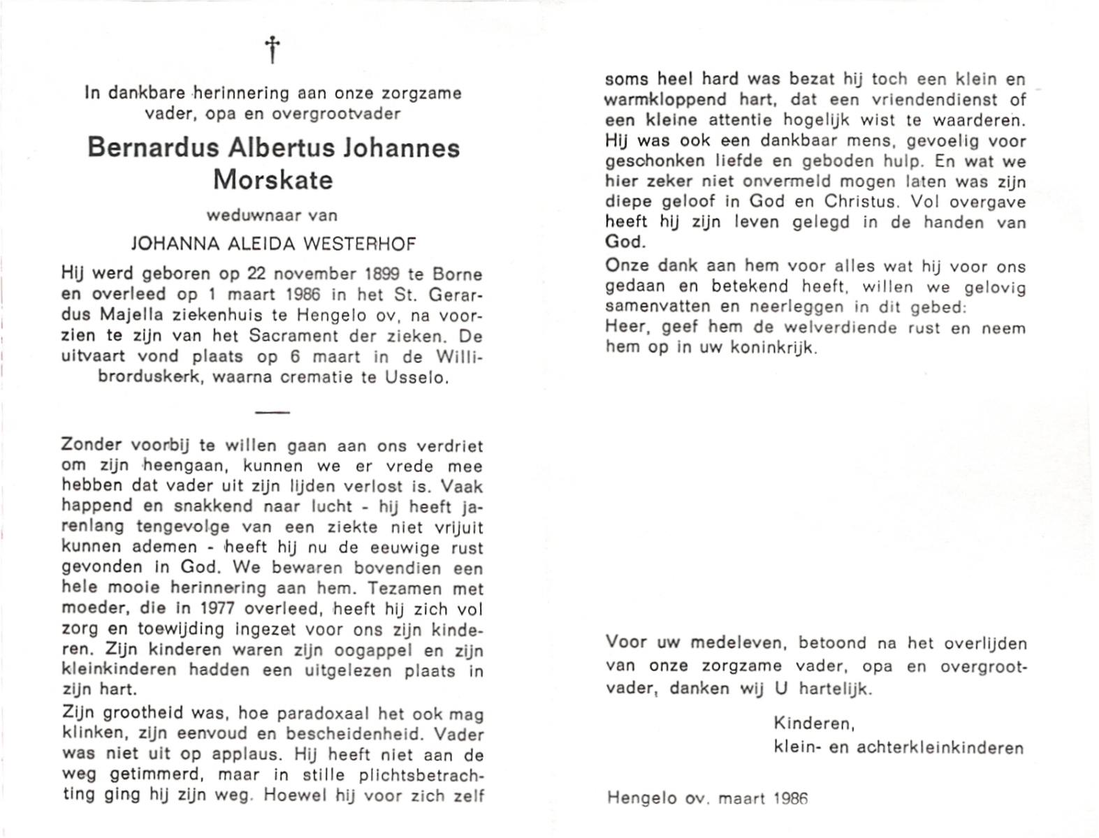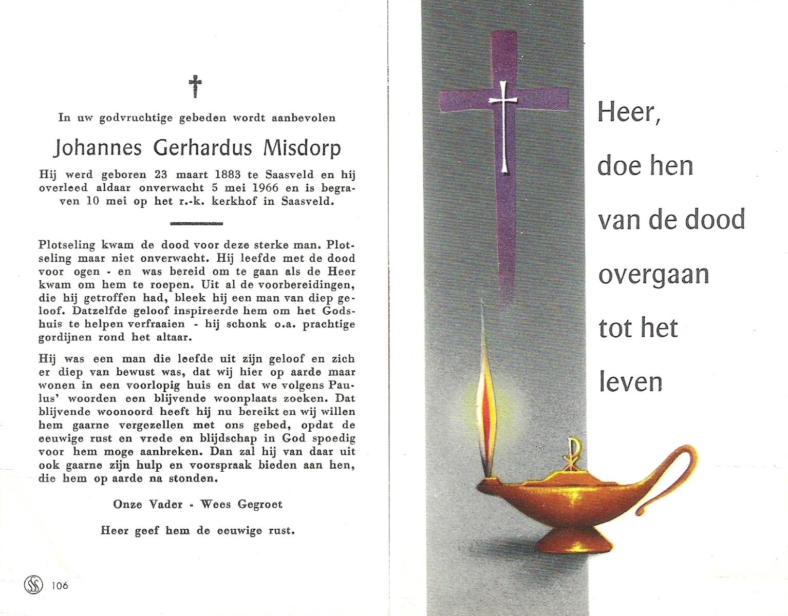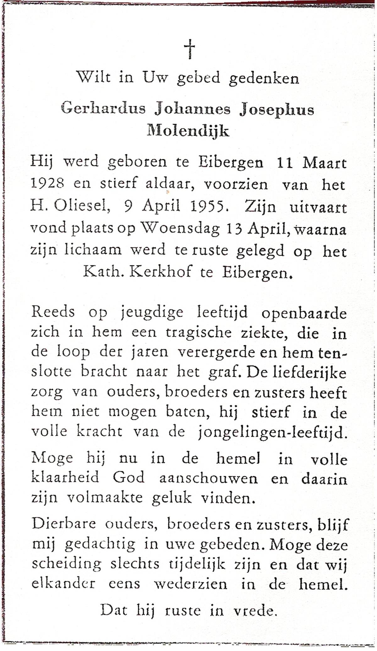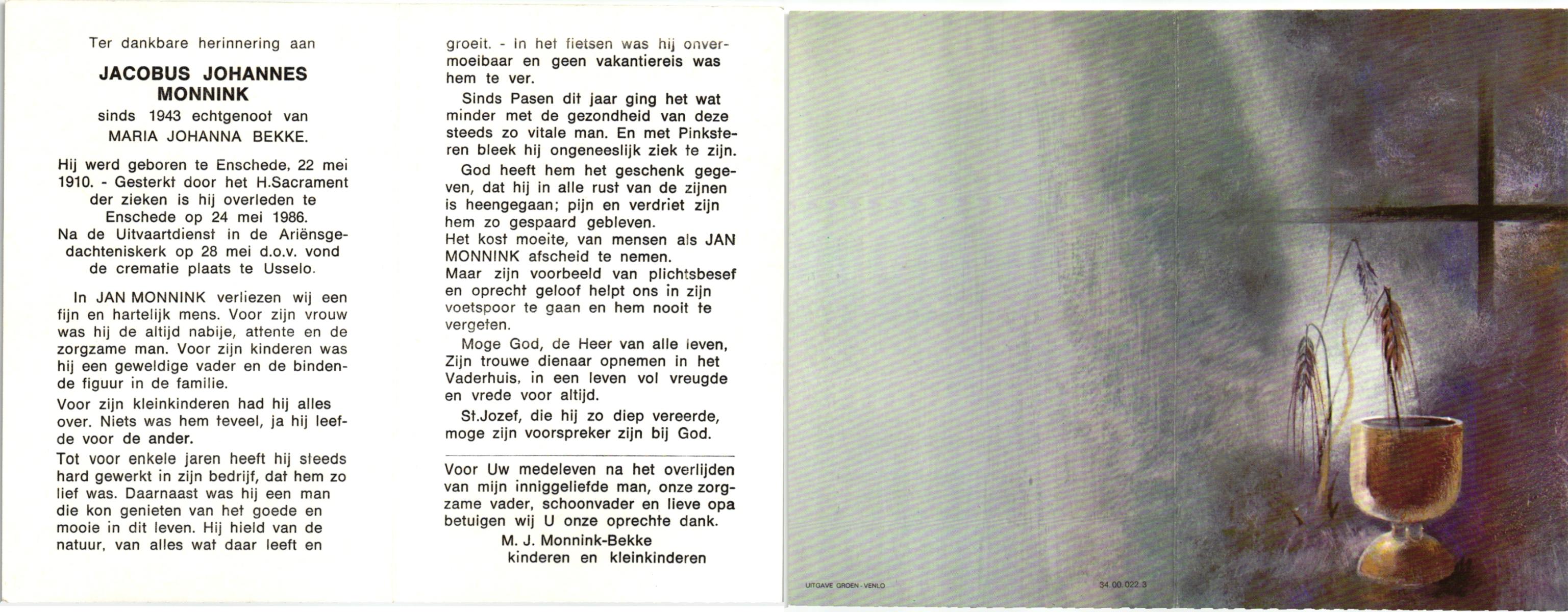 MIDDELHUIS, Johannes Gerardus, geboren op 21-9-1907 te Losser, overleden op 13-10-1986 te Oldenzaal op 79-jarige leeftijd, begraven op 16-10-1986 te Losser.