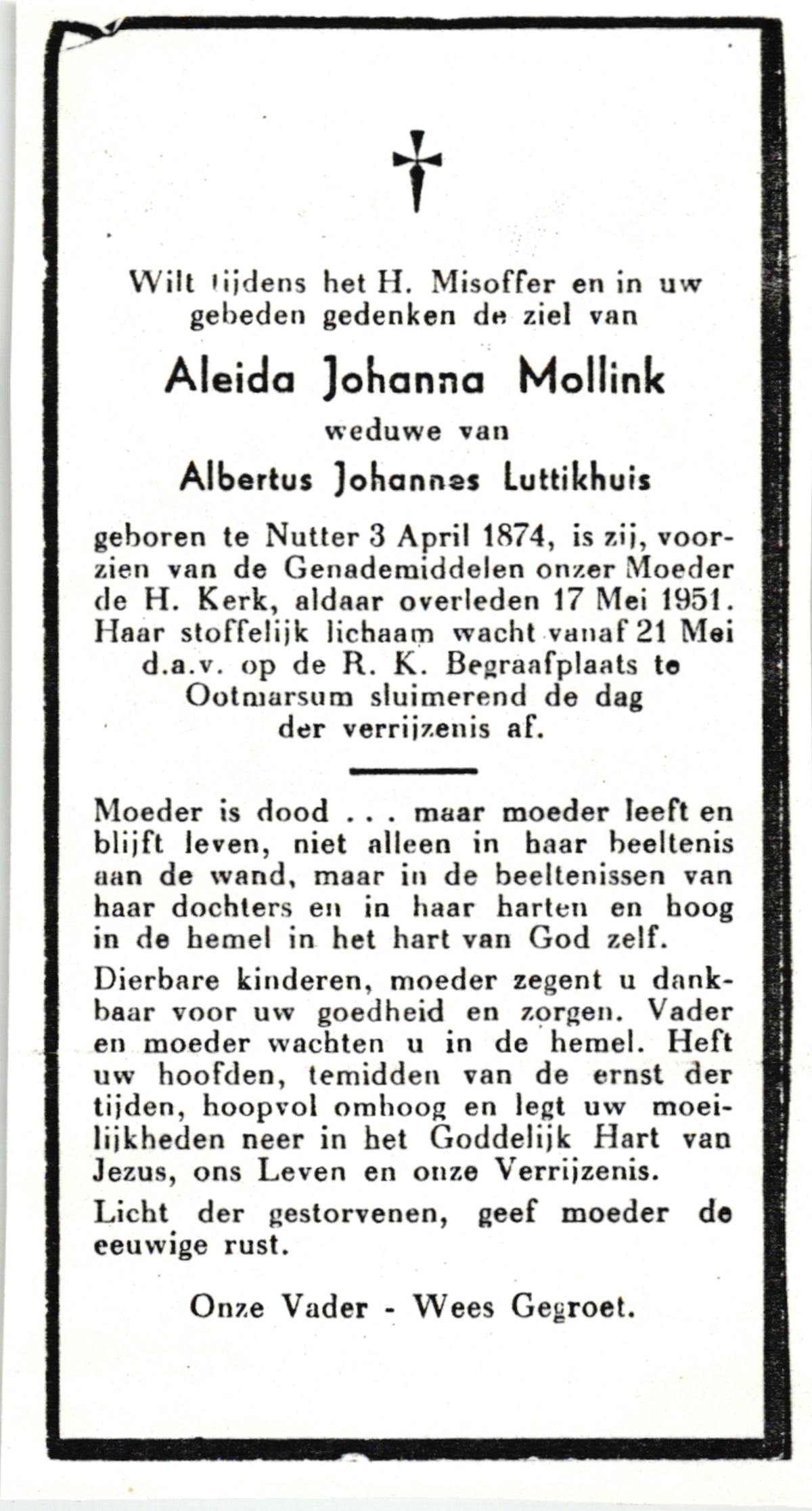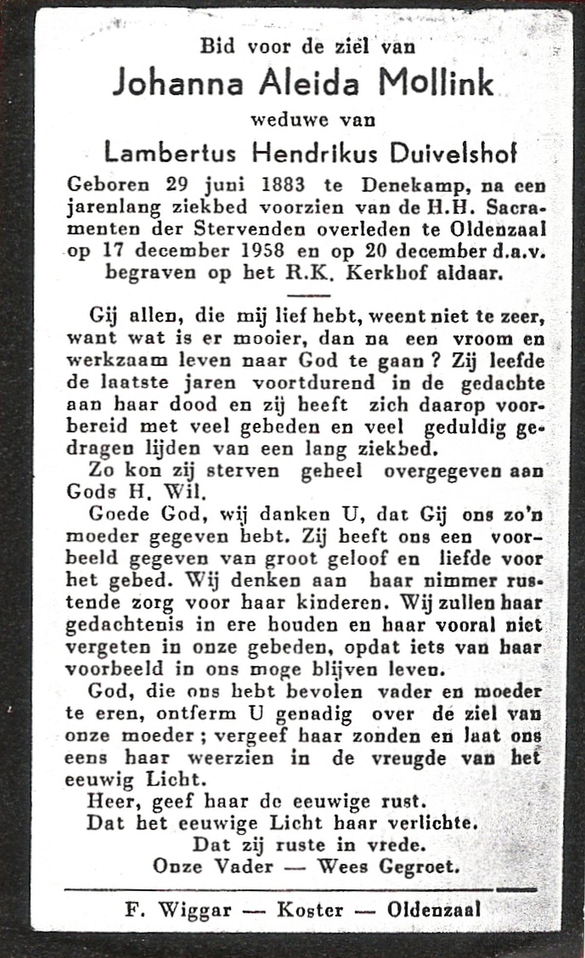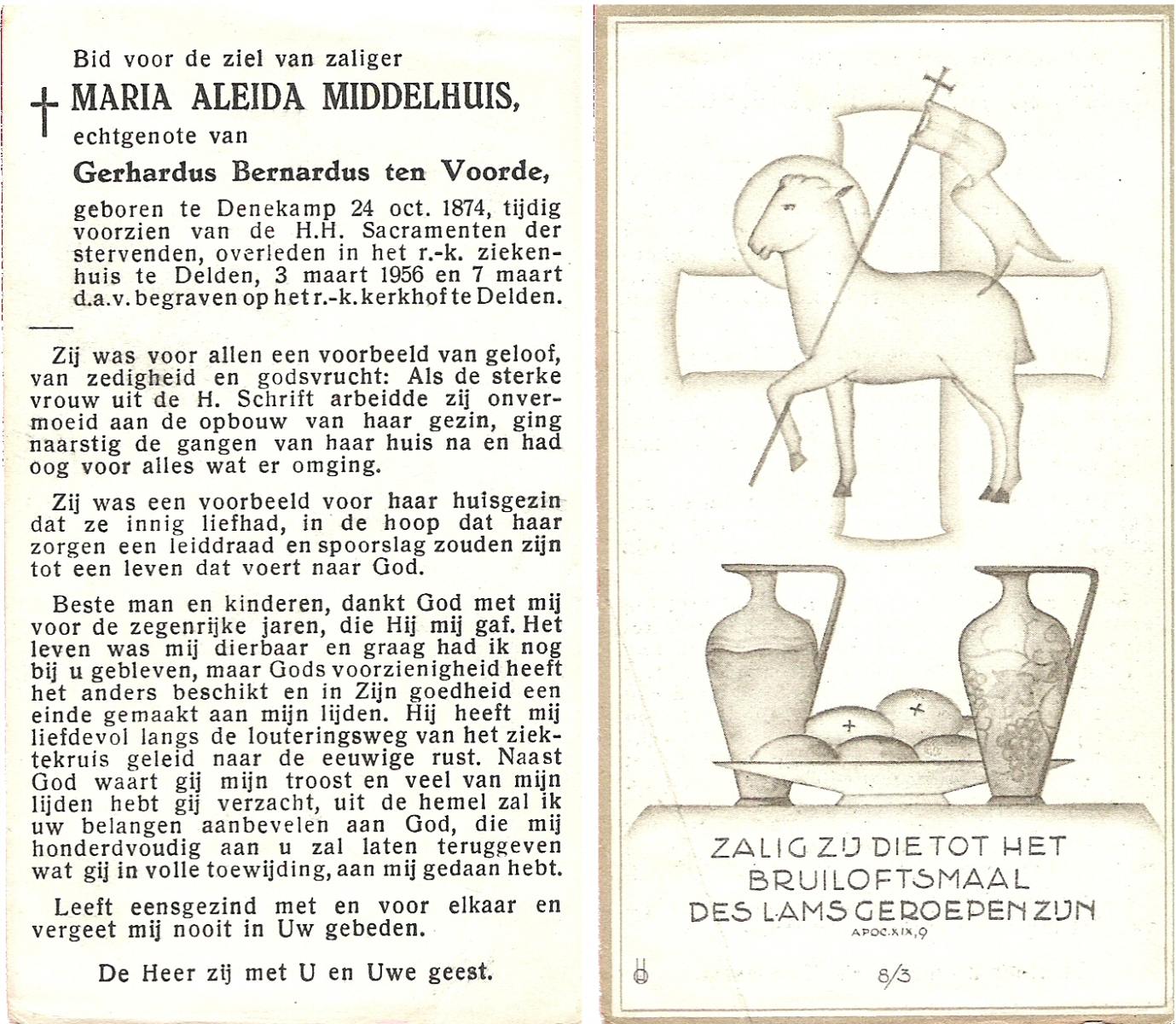MIDDELHUIS, Maria Aleida, geboren op 24-10-1874 te Denekamp, overleden op 3-3-1956 te Delden op 81-jarige leeftijd, begraven op 7-3-1956 te Delden.
