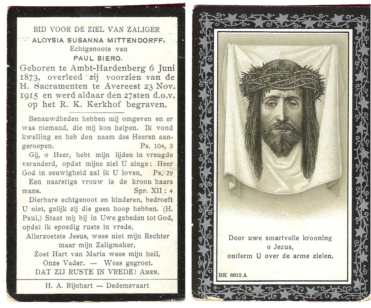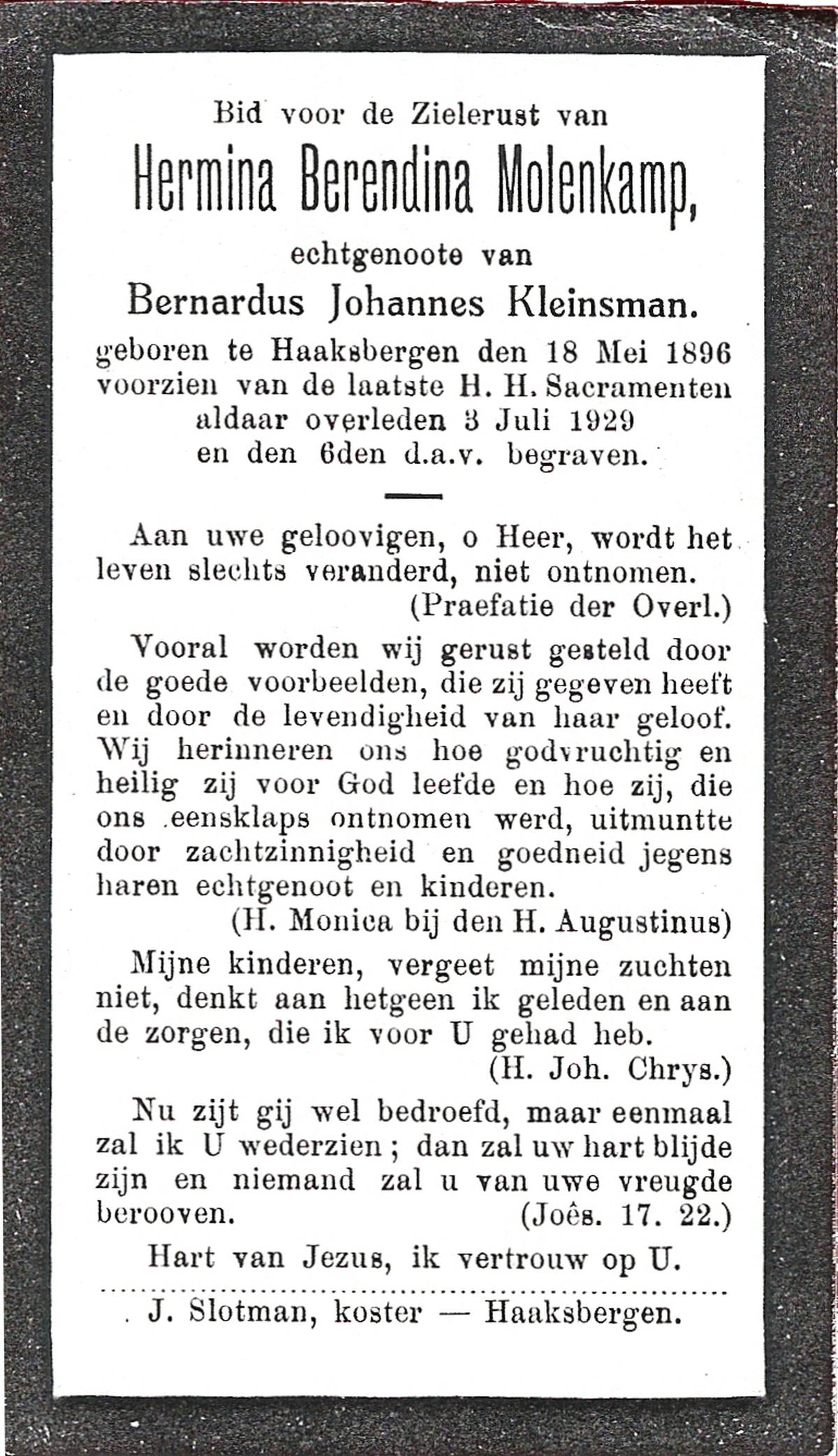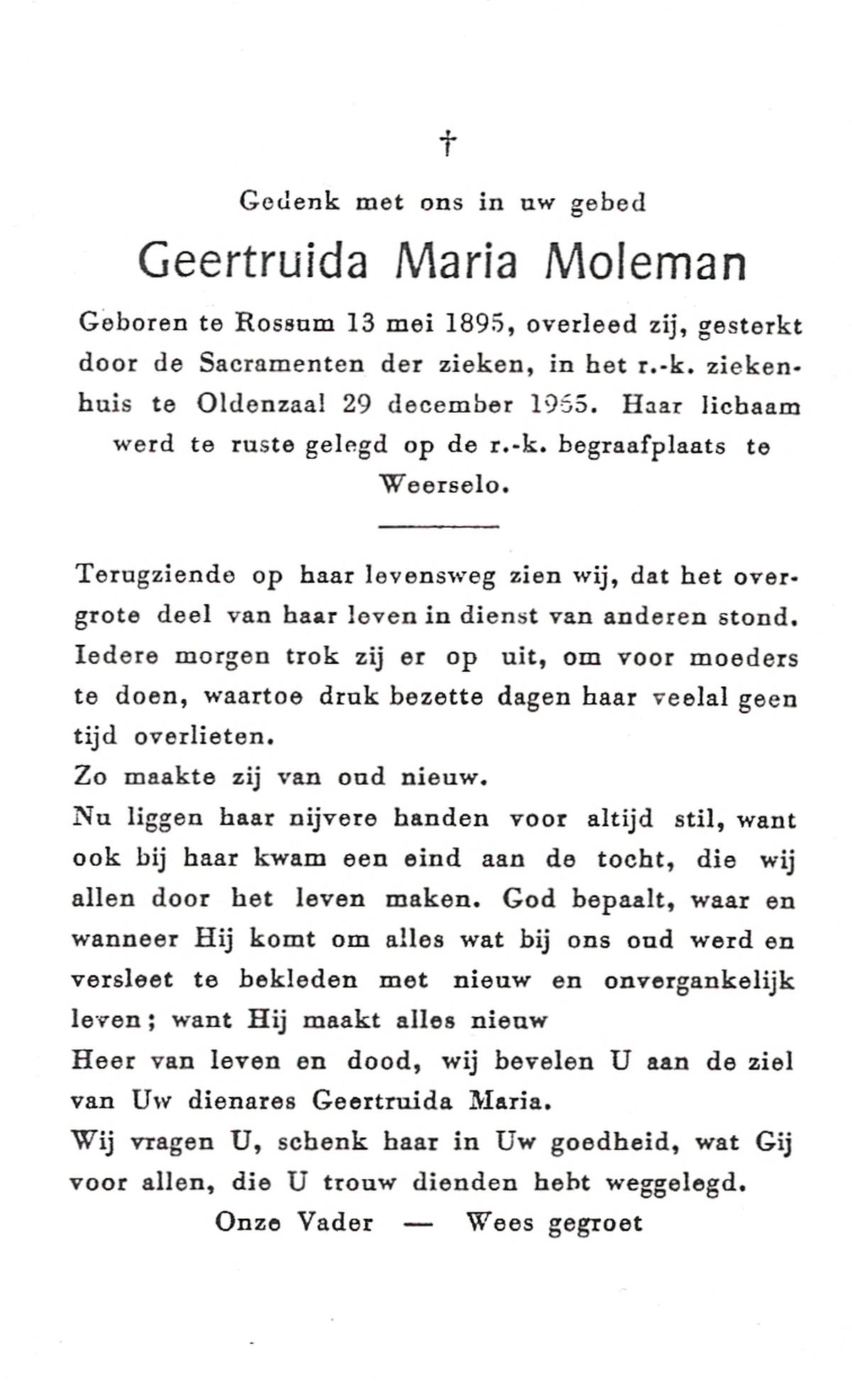 MIDDELHUIS, Maria Aleida, geboren op 24-10-1874 te Denekamp, overleden op 3-3-1956 te Delden op 81-jarige leeftijd, begraven op 7-3-1956 te Delden.