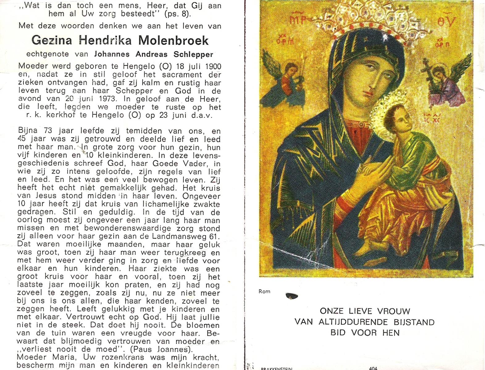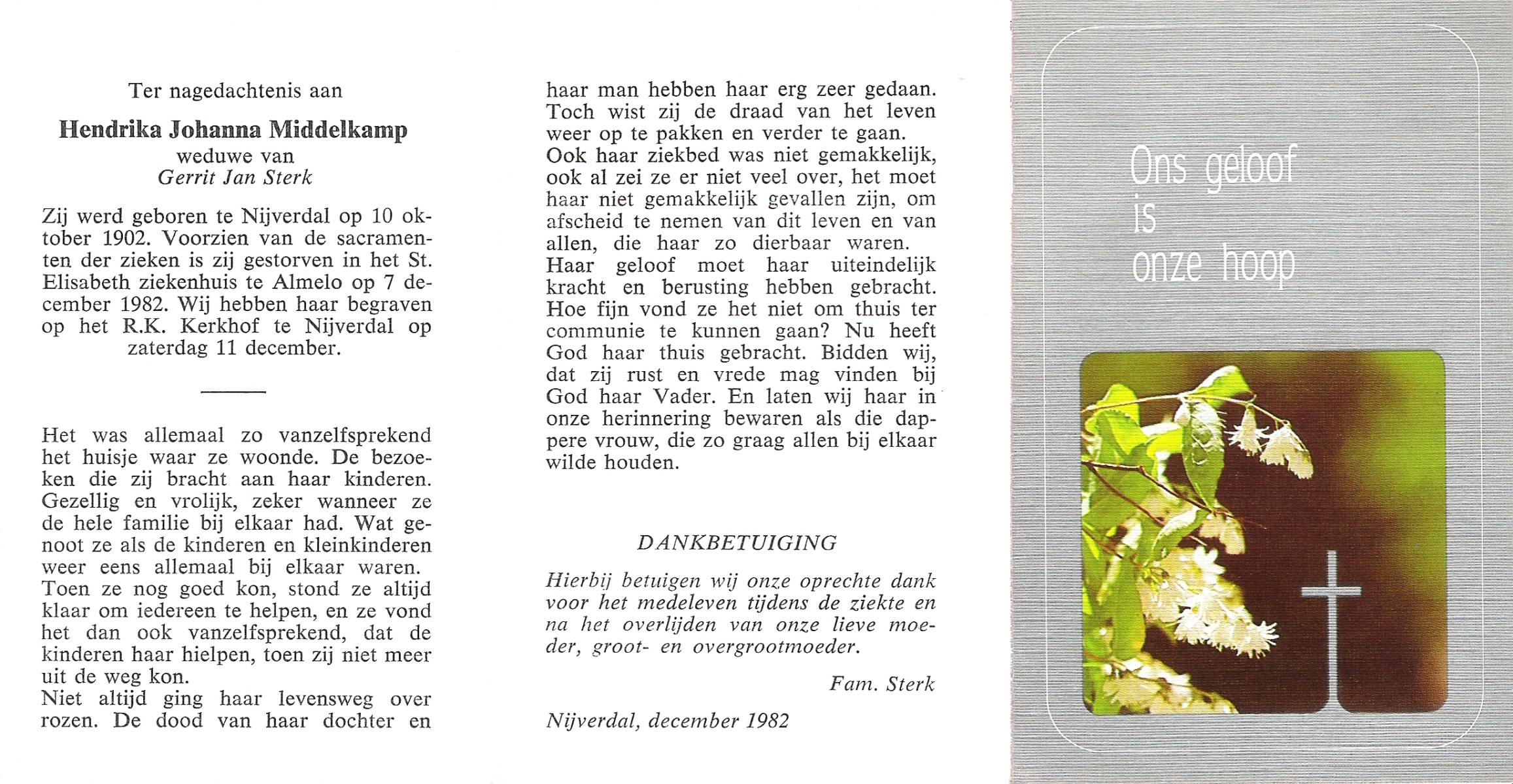 MIDDELKAMP, Hendrika Johanna, geboren op 10-10-1902 te Hellendoorn, Nijverdal, overleden op 7-12-1982 te Almelo op 80-jarige leeftijd, begraven op 11-12-1982 te Hellendoorn, Nijverdal.