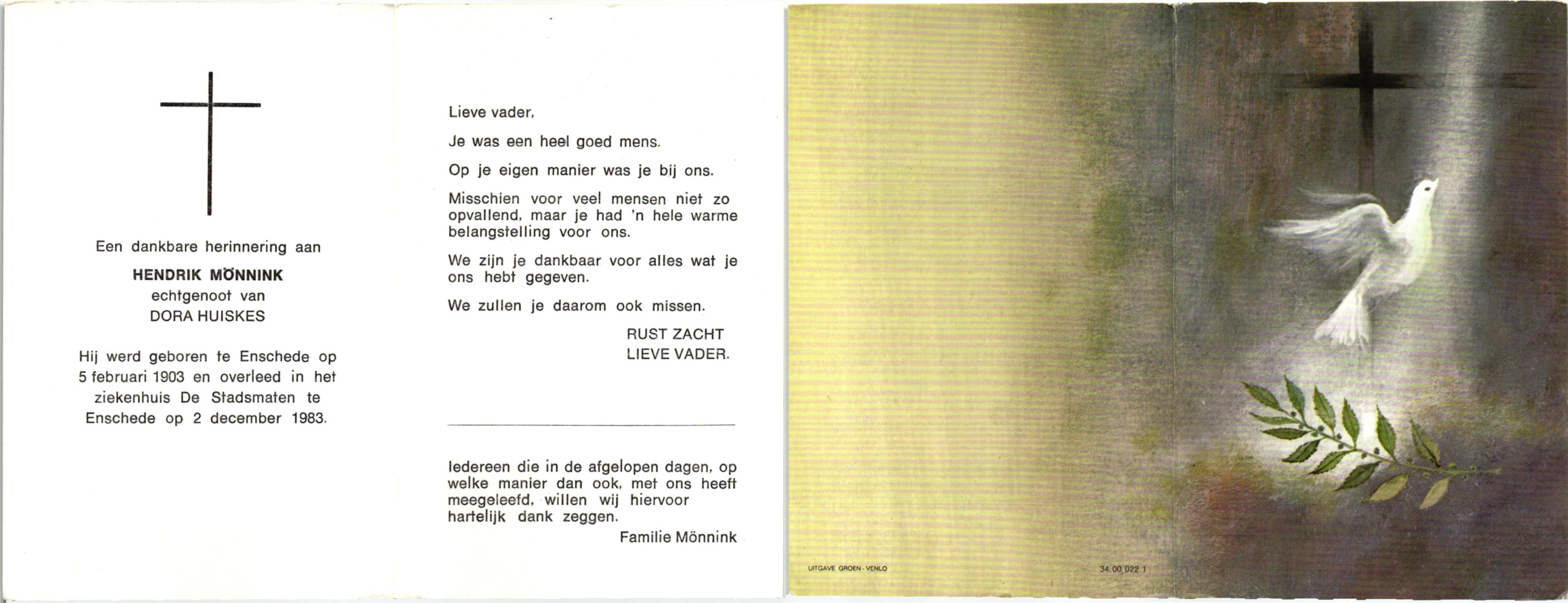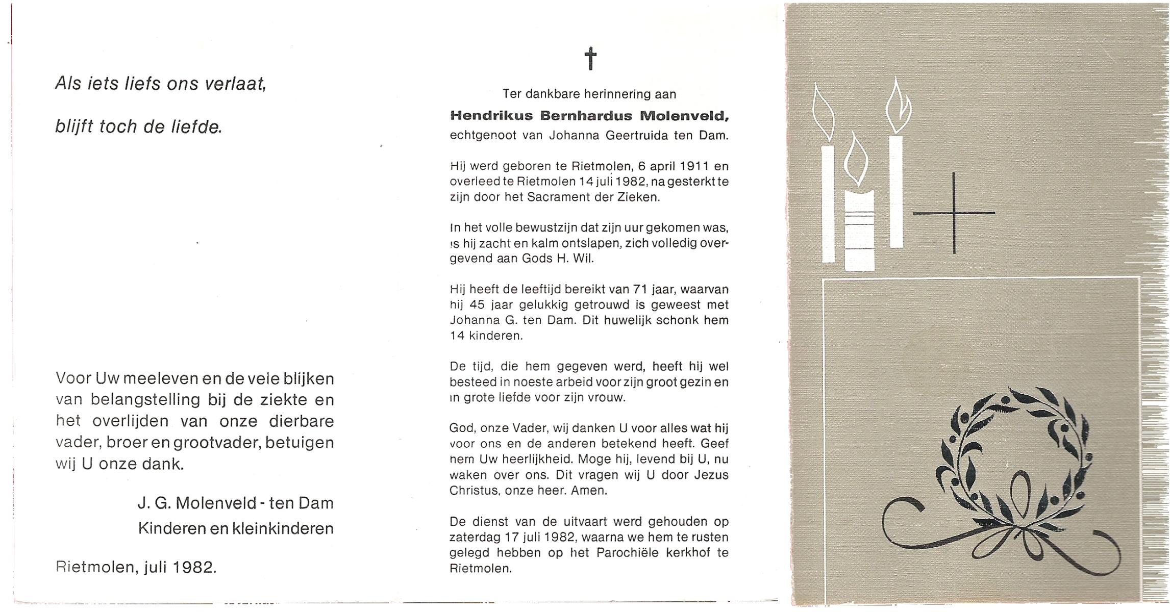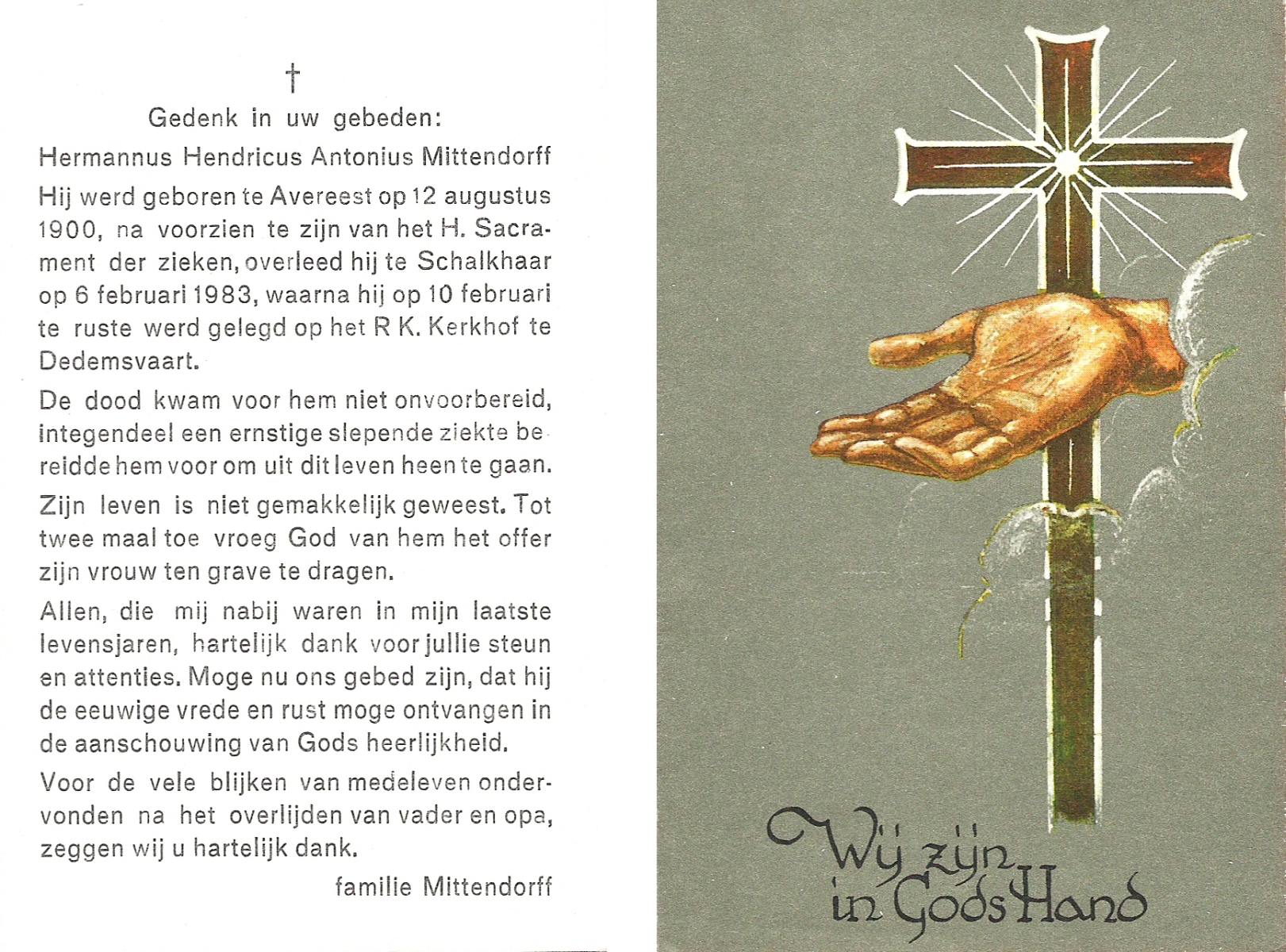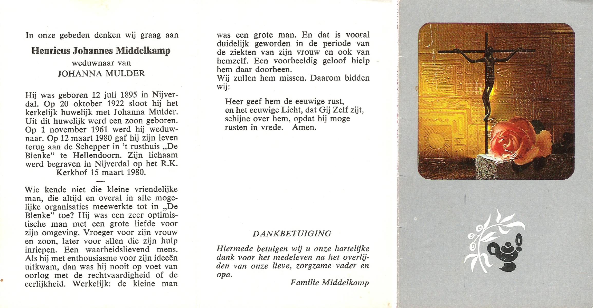 MIDDELKAMP, Henricus Johannes, geboren op 12-07-1885 te Hellendoorn, Nijverdal, overleden op 12-3-1980 te Hellendoorn op 94-jarige leeftijd, begraven op 15-3-1980 te Hellendoorn, Nijverdal.