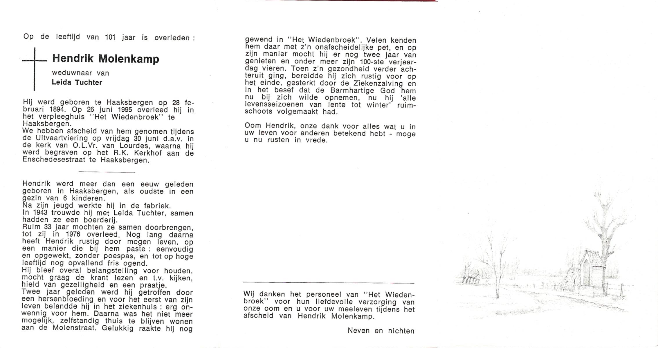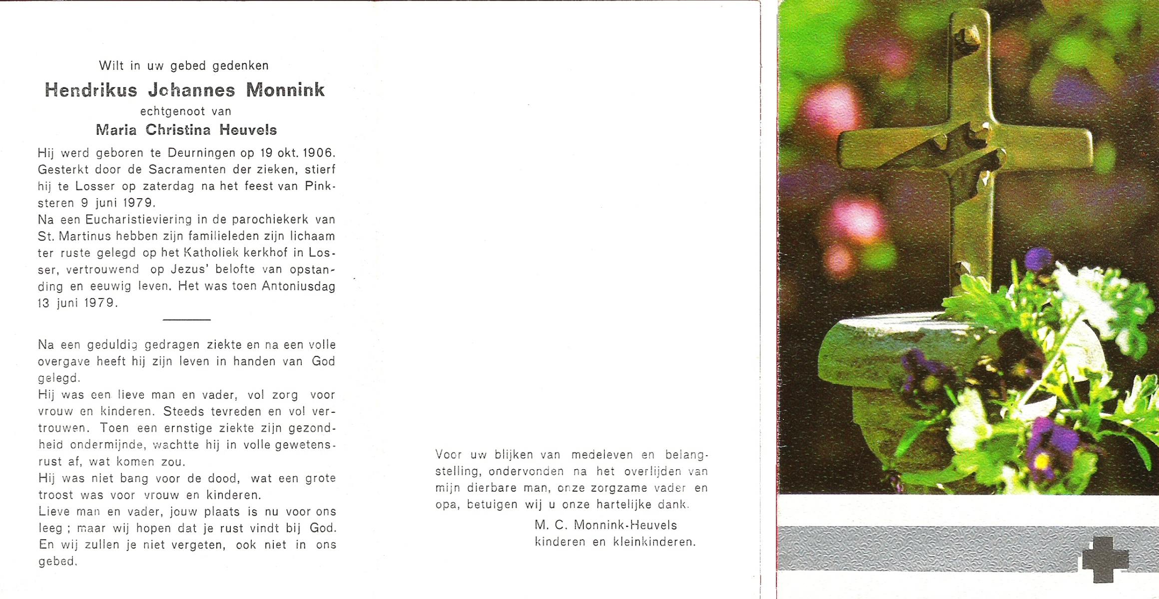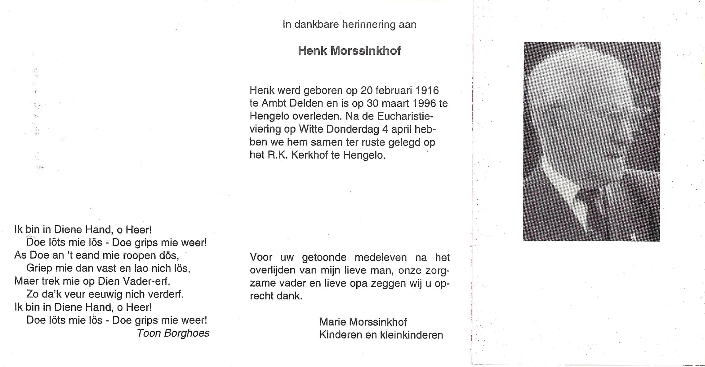 MIDDELKAMP, Henricus Johannes, geboren op 12-07-1885 te Hellendoorn, Nijverdal, overleden op 12-3-1980 te Hellendoorn op 94-jarige leeftijd, begraven op 15-3-1980 te Hellendoorn, Nijverdal.