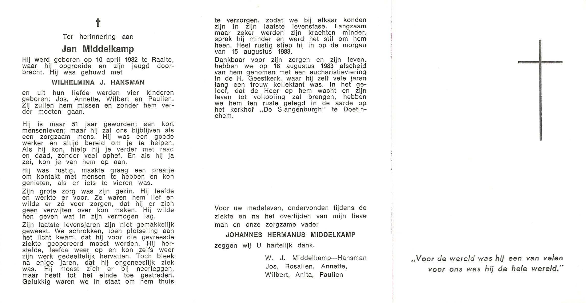MIDDELKAMP, Jan, geboren op 10-4-1932 te Raalte, overleden op 15-8-1983 op 51-jarige leeftijd, begraven op 18-8-1983 te Doetinchem.