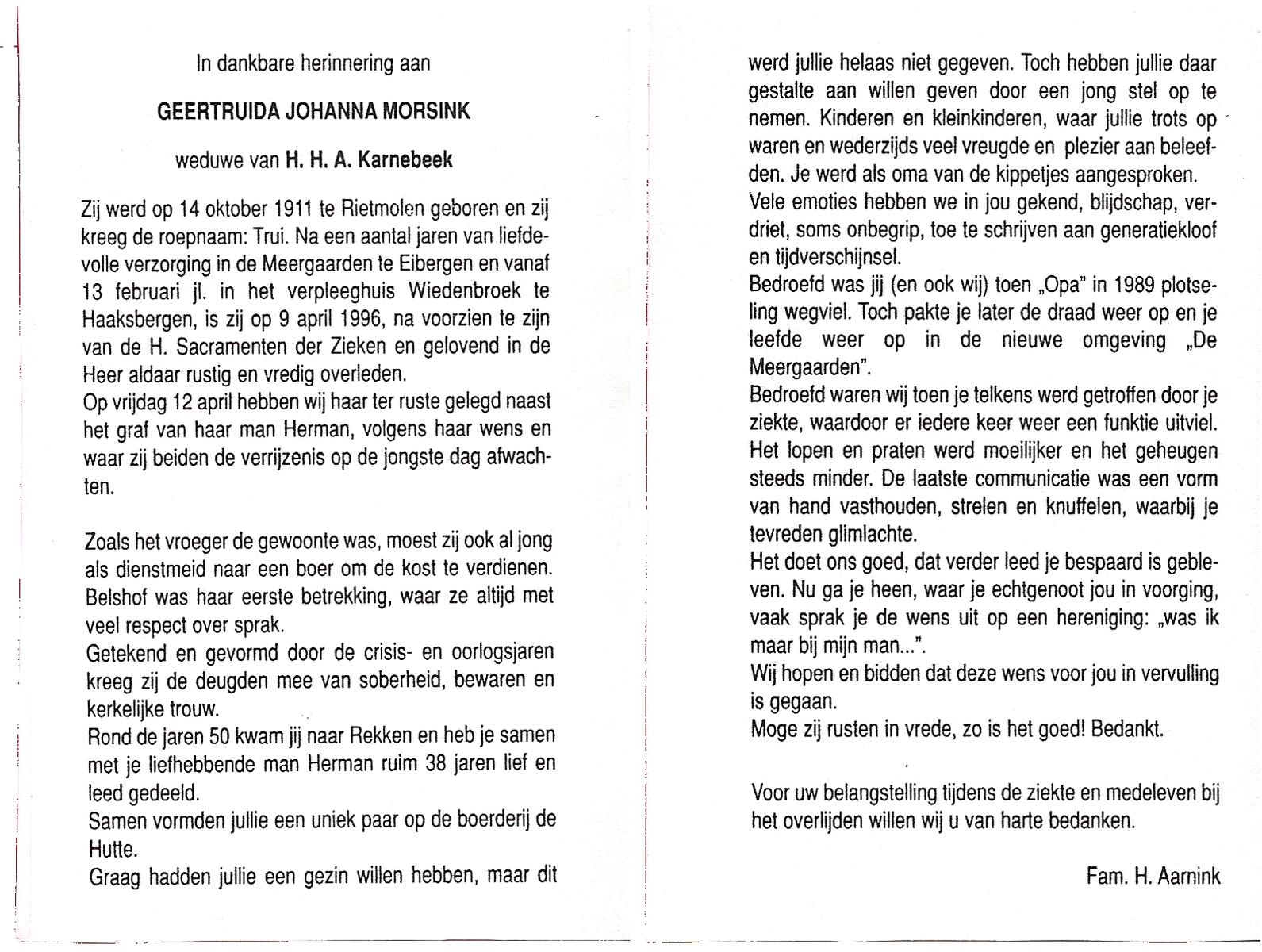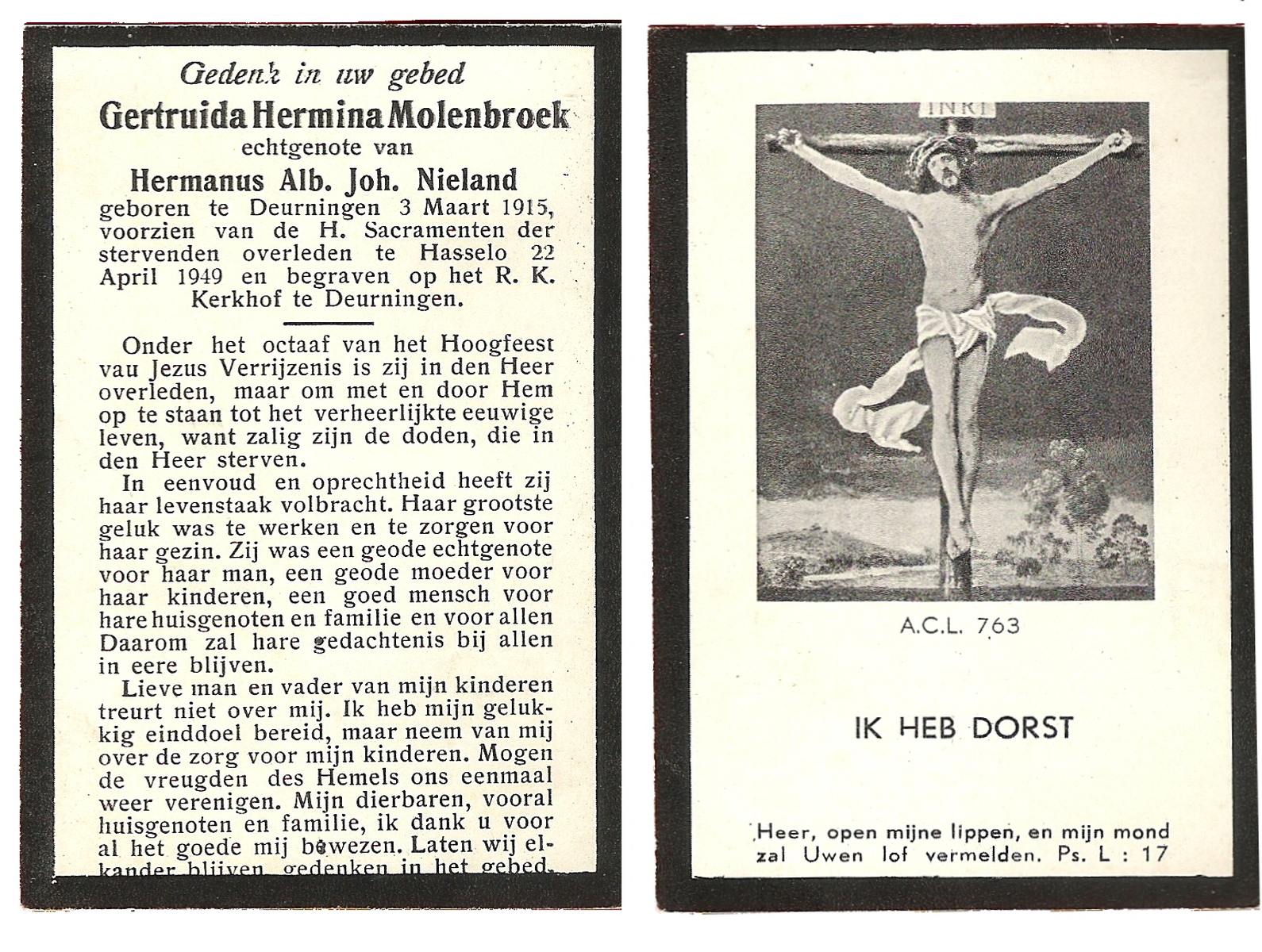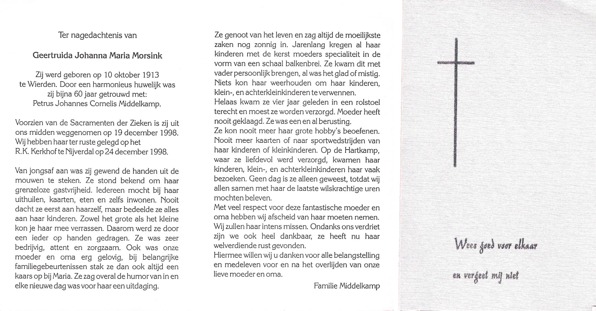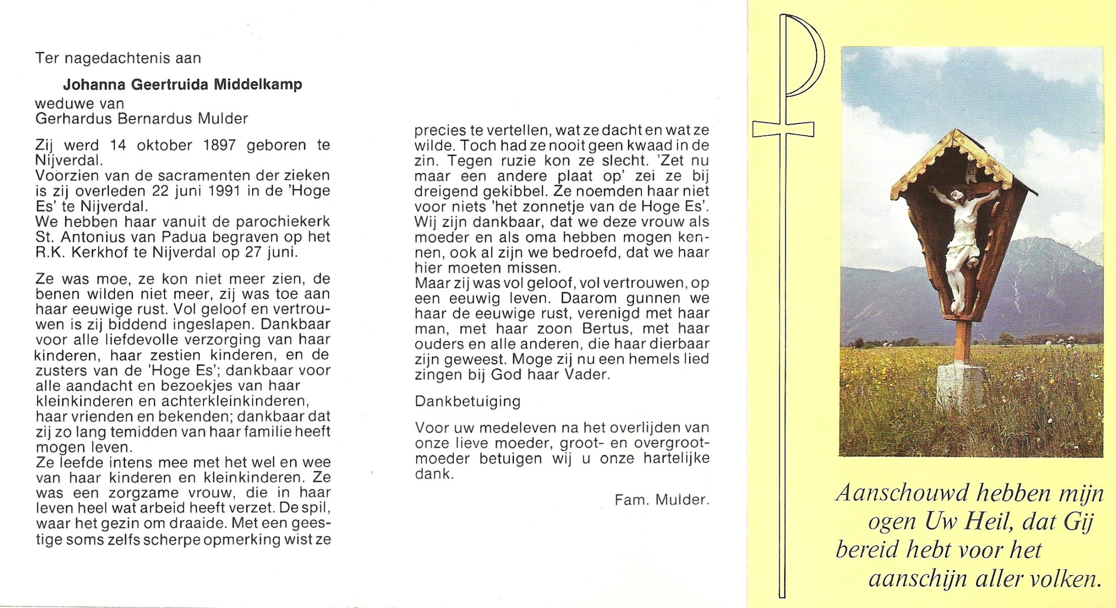 MIDDELKAMP, Johanna Geertruida, geboren op 14-10-1907 te Hellendoorn, Nijverdal, overleden op 22-6-1991 te Hellendoorn, Nijverdal op 83-jarige leeftijd, begraven op 27-6-1991 te Hellendoorn, Nijverdal.
