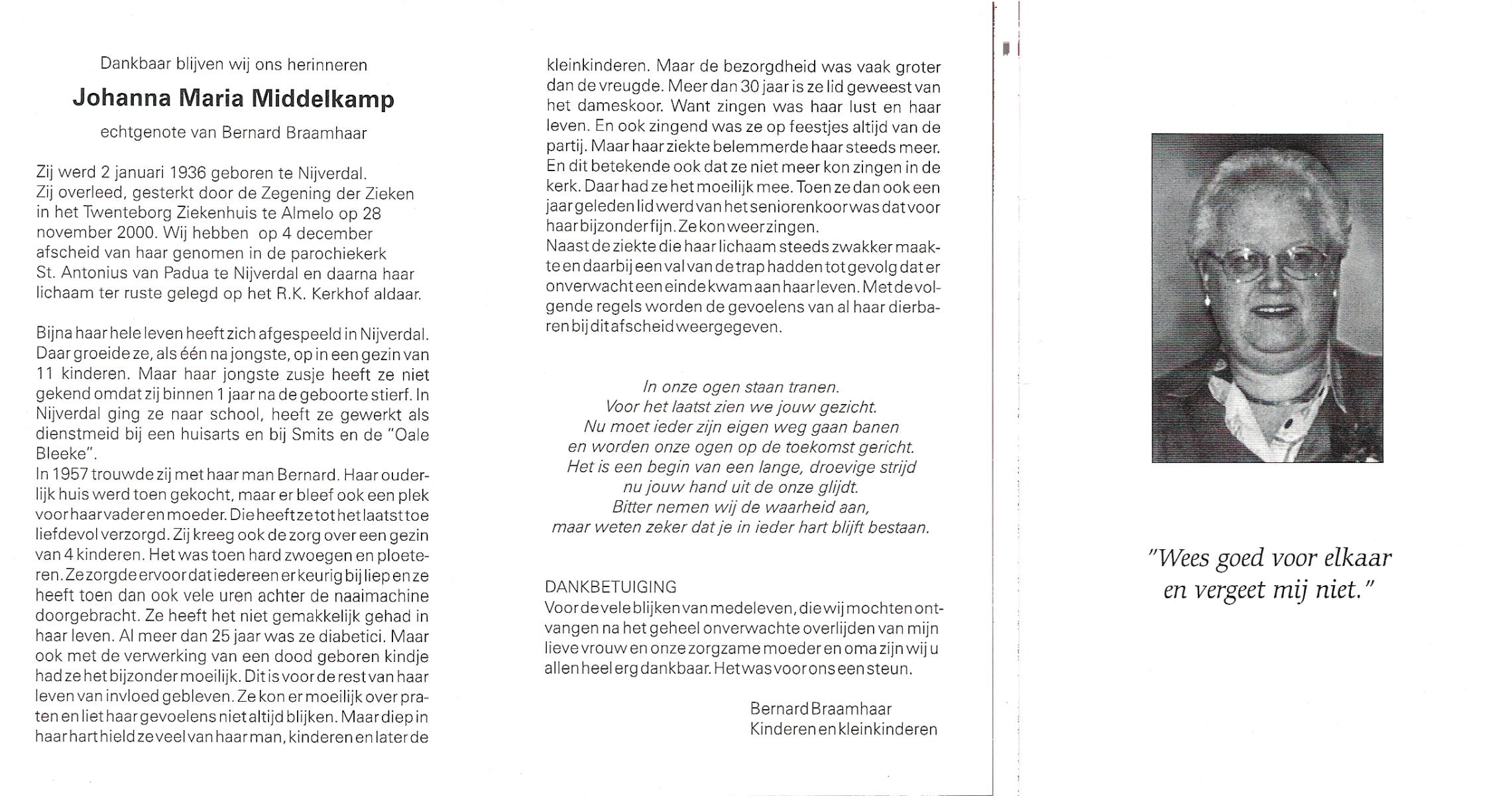 MIDDELKAMP, Johanna Maria, geboren op 2-1-1936 te Hellendoorn, Nijverdal, overleden op 28-11-2000 te Almelo op 64-jarige leeftijd, begraven op 4-12-2000 te Hellendoorn, Nijverdal.