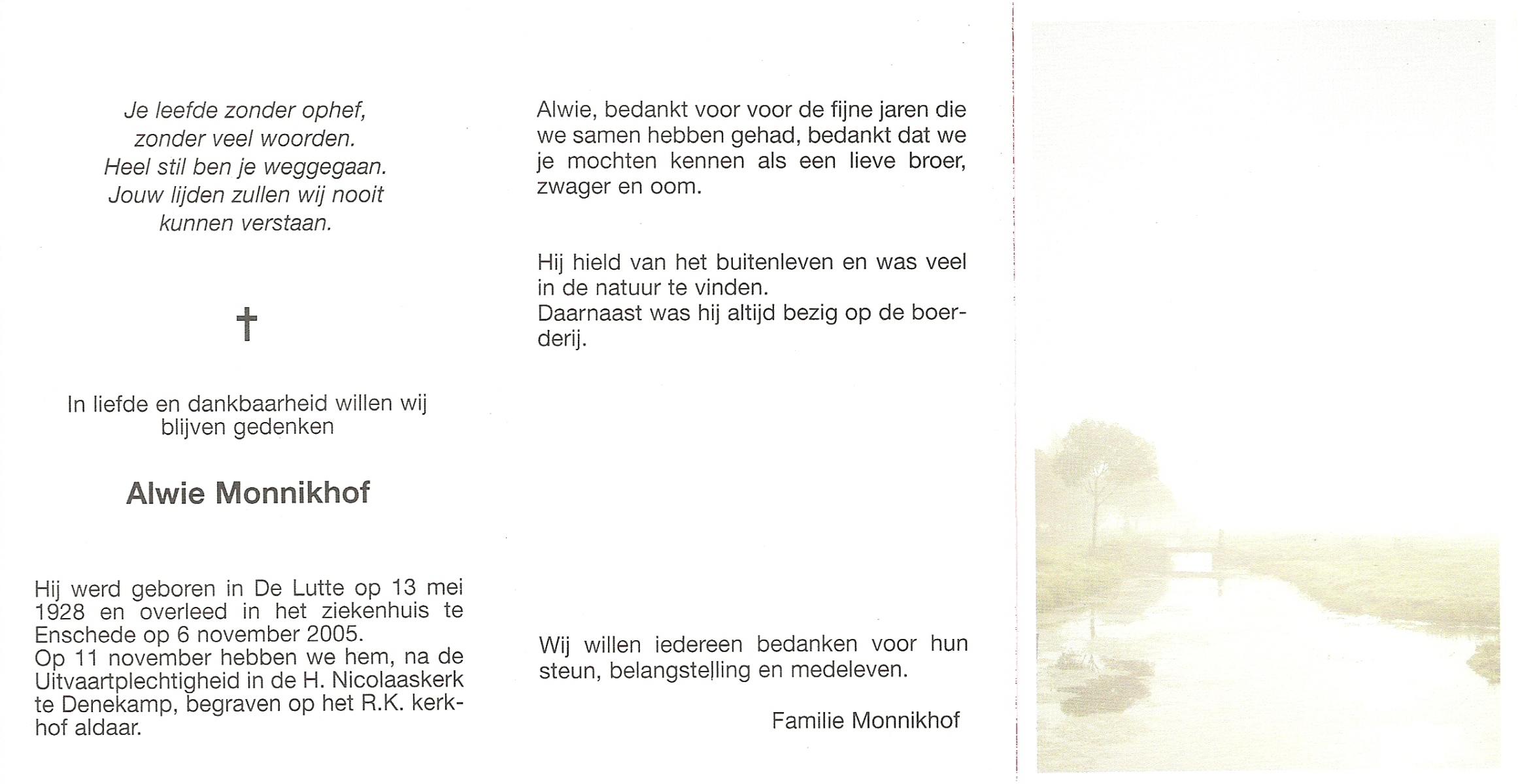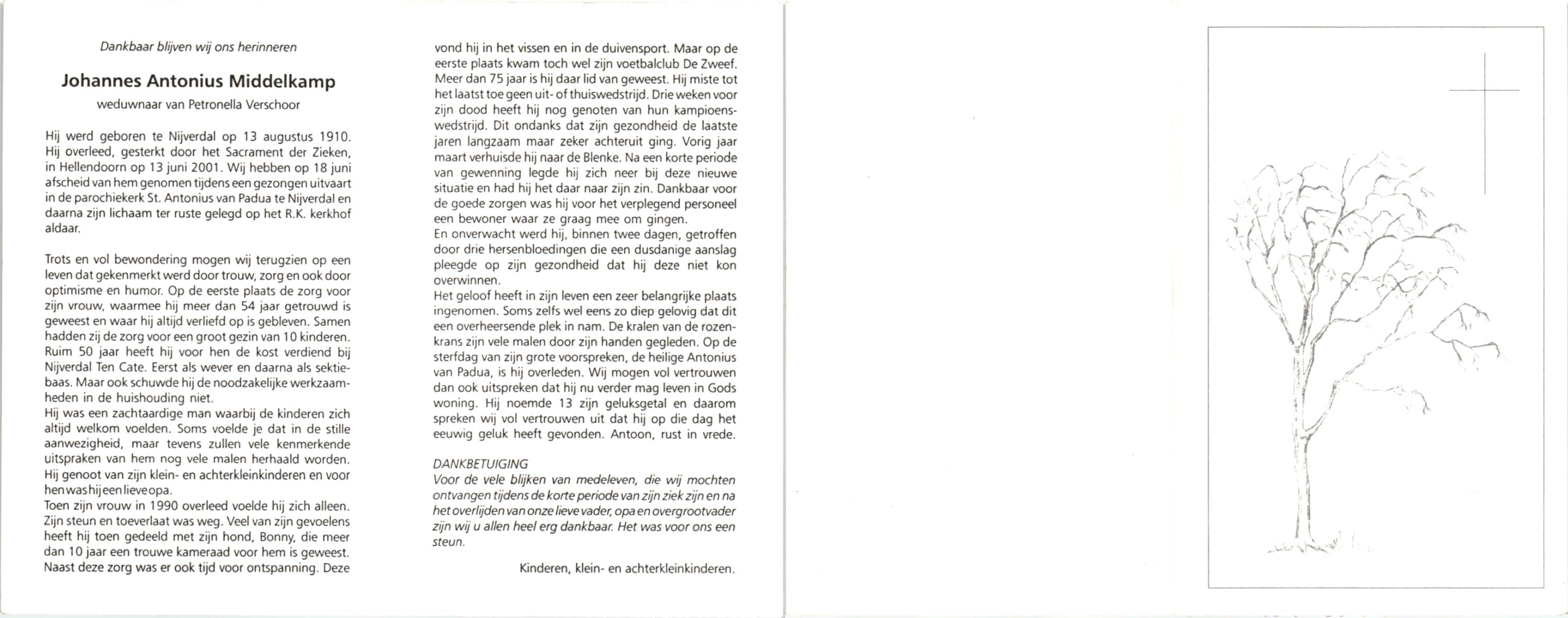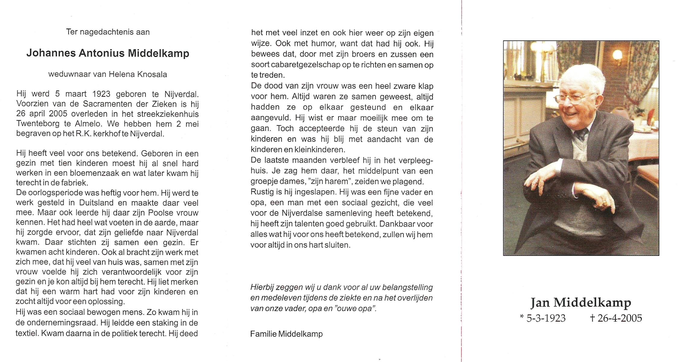 MIDDELKAMP, Johannes Antonius, geboren op 5-3-1923 te Hellendoorn, Nijverdal, overleden op 26-4-2005 te Almelo op 82-jarige leeftijd, begraven op 2-5-2005 te Hellendoorn, Nijverdal.