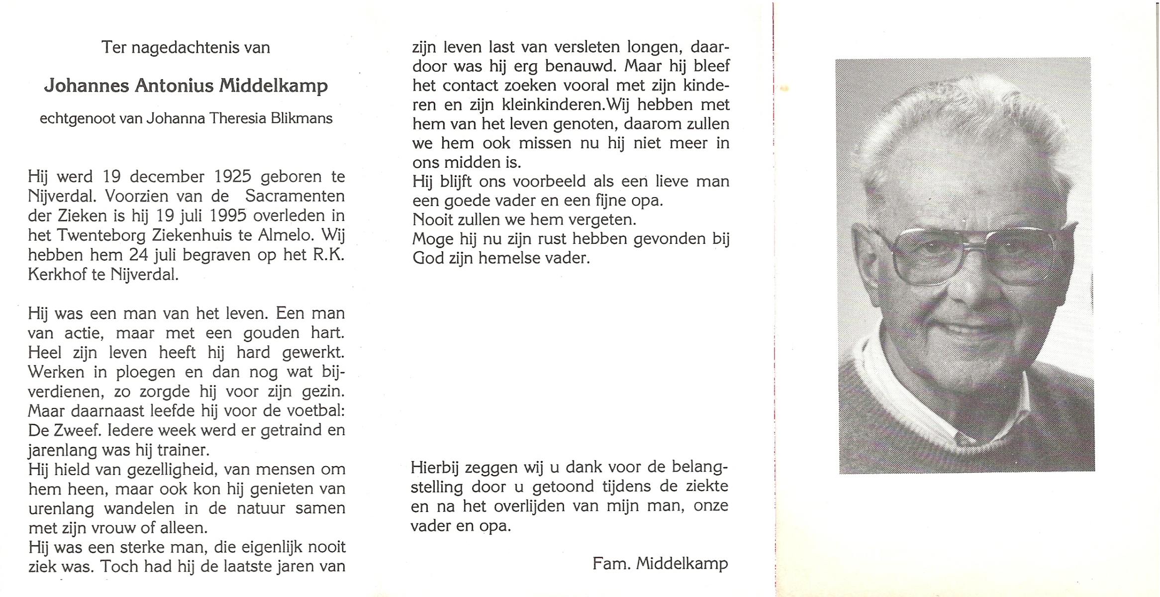 MIDDELKAMP, Johannes Antonius, geboren op 19-12-1925 te Hellendoorn, Nijverdal, overleden op 19-7-1995 te Almelo op 69-jarige leeftijd, begraven op 24-7-1995 te Hellendoorn, Nijverdal.