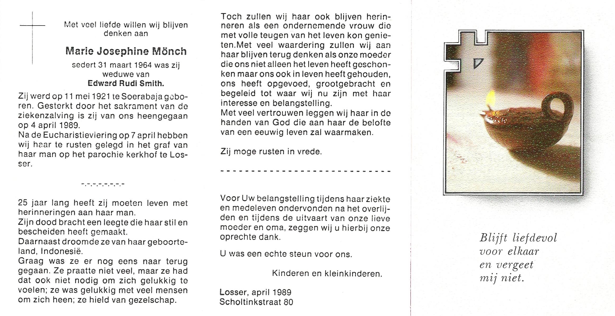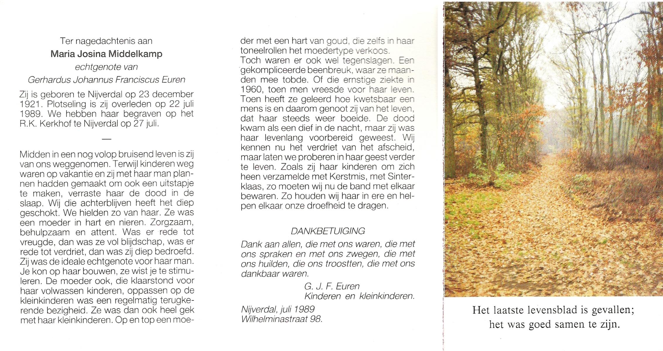 MIDDELKAMP, Maria Josina, geboren op 23-12-1921 te Hellendoorn, Nijverdal, overleden op 22-7-1989 te Hellendoorn, Nijverdal op 67-jarige leeftijd, begraven op 27-7-1989 te Hellendoorn, Nijverdal.