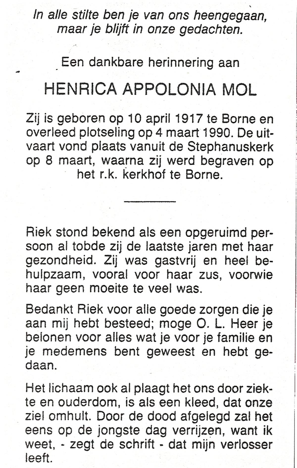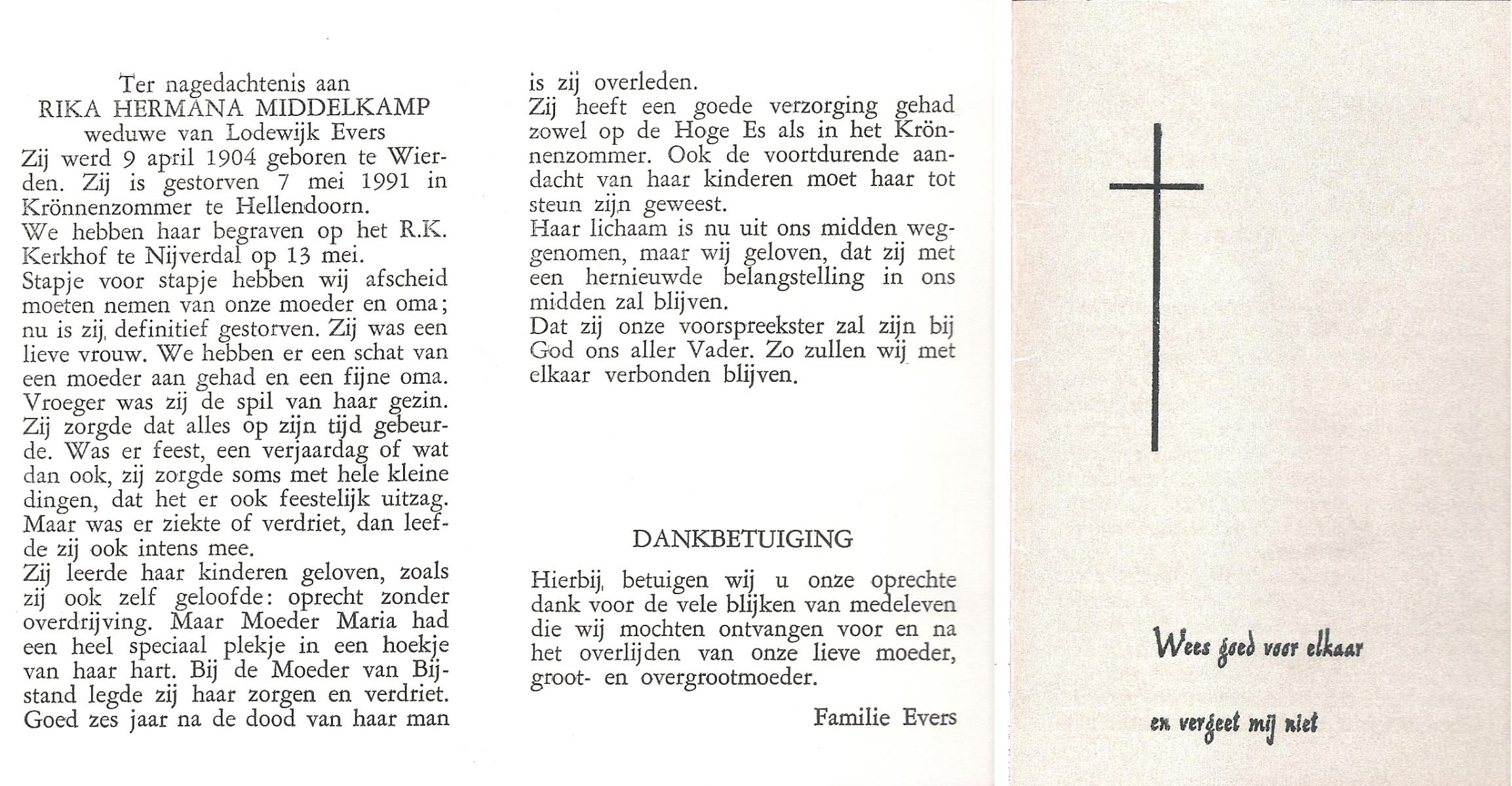 MIDDELKAMP, Rika Hermana, geboren op 9-4-1904 te Wierden, overleden op 7-5-1991 te Hellendoorn op 87-jarige leeftijd, begraven op 13-5-1991 te Hellendoorn, Nijverdal.